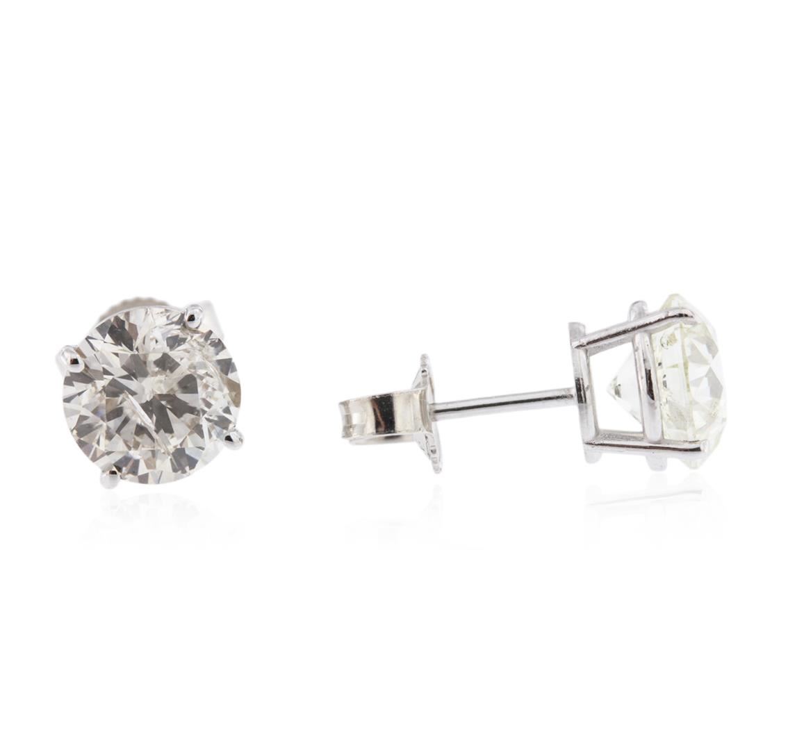 One pair electronically tested 14KT white gold ladies cast diamond stud earrings with friction posts with a bright polish finish. Condition is new. Containing: One prong set round brilliant cut diamond, measuring 7.15 - 7.14 x 4.30mm (depth est.) approximate weight of 1.34ct. Clarity: I-2. Color: K, Cut is Good. One prong set round brilliant cut diamond, measuring 7.19 - 7.19 x 4.31mm (depth est.) approximate weight of 1.36ct. Clarity: I-2. Color: K, Cut is Good. All diamonds are graded in the mounting, unless otherwise stated. Total Weight of Diamonds 2.70ct. Total Weight of Stud Earrings 1.70 grams. GGL Appraised at $10,925.00.