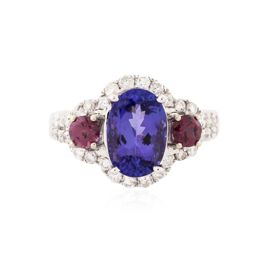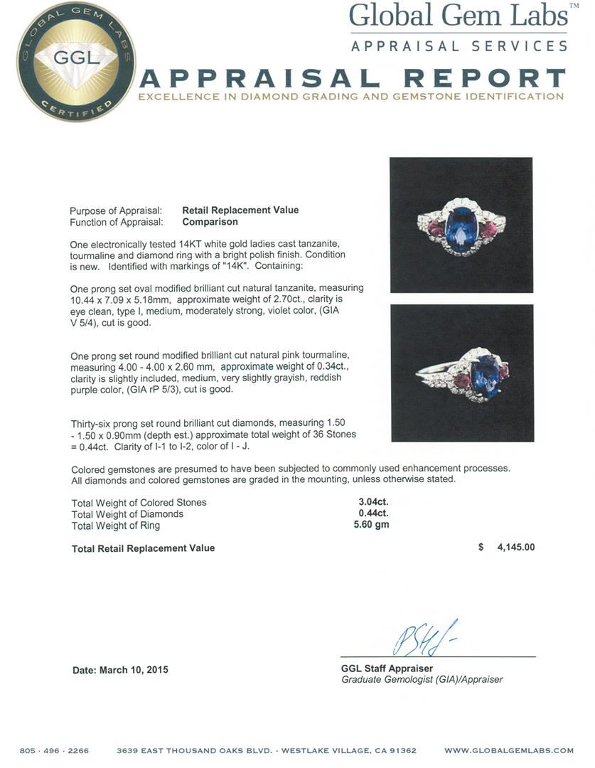 One electronically tested 14KT white gold ladies cast tanzanite, tourmaline and diamond ring with a bright polish finish. Identified with markings of "14K". Condition is new. Containing: One prong set oval modified brilliant cut natural tanzanite, measuring 10.44 x 7.09 x 5.18mm, approximate weight of 2.70ct., clarity is eye clean, type I, medium, moderately strong, violet color, (GIA V 5/4), cut is good. One prong set round modified brilliant cut natural pink tourmaline, measuring 4.00 - 4.00 x 2.60 mm, approximate weight of 0.34ct., clarity is slightly included, medium, very slightly grayish, reddish purple color, (GIA rP 5/3), cut is good. Thirty-Six prong set round brilliant cut diamonds, measuring 1.50 - 1.50 x 0.90mm (depth est.) approximate total weight of 36 Stones = 0.44ct. Clarity: I-1 to I-2. Color: I - J. Colored gemstones are presumed to have been subjected to commonly used enhancement processes. All diamonds and colored gemstones are graded in the mounting, unless otherwise stated. Total Weight of Colored Stones 3.04ct. Total Weight of Diamonds 0.44ct. Total Weight of Ring 5.60 grams. GGL Appraised at $4,145.00.