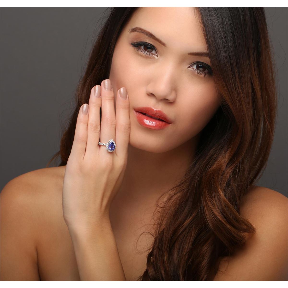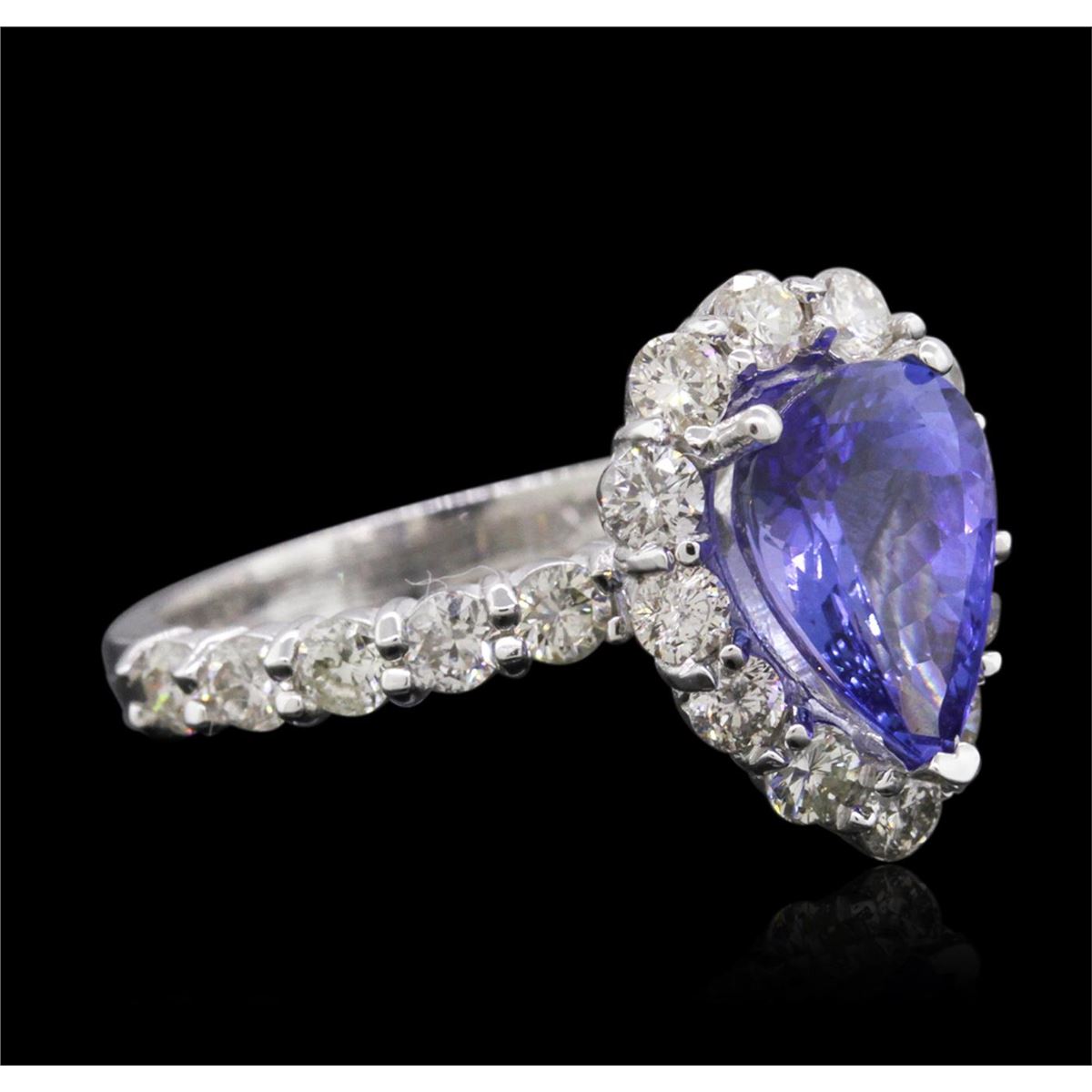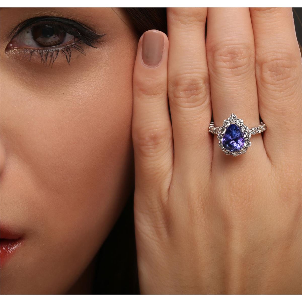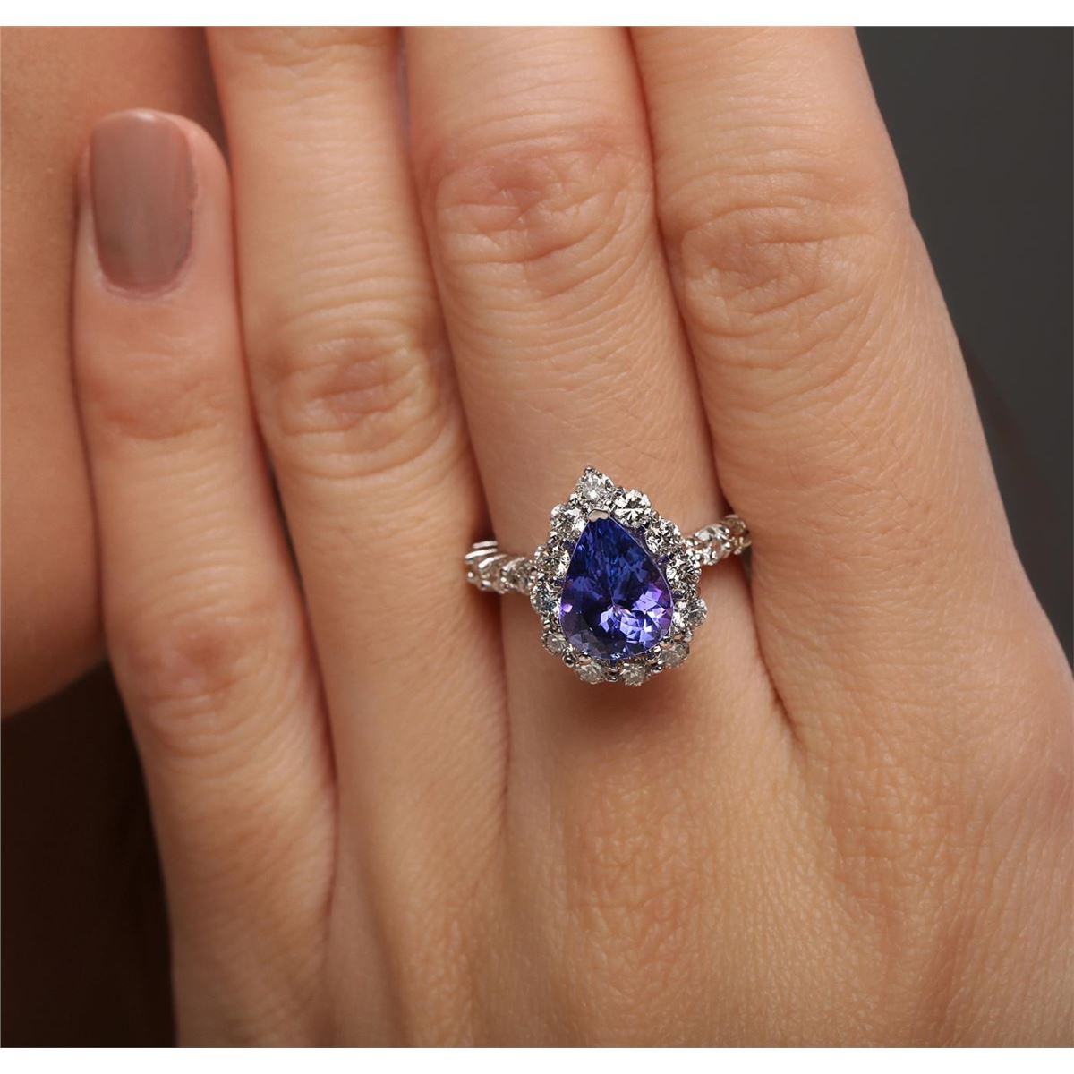 One electronically tested 14KT white gold ladies combination cast & assembled sapphire and diamond ring with a bright polish finish. Identified with markings of "14K". Condition is new. Containing: One prong set pear modified brilliant cut natural tanzanite, measuring 10.59 x 7.65 x 4.97mm, approximate weight of 2.70ct., clarity is eye clean, type I, medium, moderately strong, violet color, (GIA V 5/4), cut is good. Twenty-Two prong set round brilliant cut diamonds, measuring 2.50 - 2.50 x 1.50mm (depth est.) approximate total weight of 22 Stones = 1.26ct. Clarity: SI-2 to I-1. Color: J, Cut is Good. Colored gemstones are presumed to have been subjected to commonly used enhancement processes. All diamonds and colored gemstones are graded in the mounting, unless otherwise stated. Total Weight of Colored Stones 2.70ct. Total Weight of Diamonds 1.26ct. Total Weight of Ring 4.70 grams. GGL Appraised at $6,010.00.