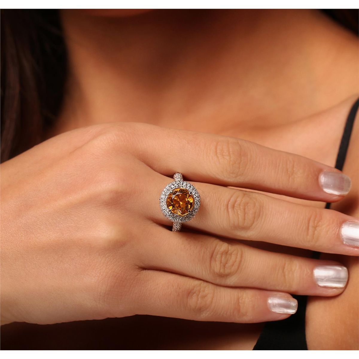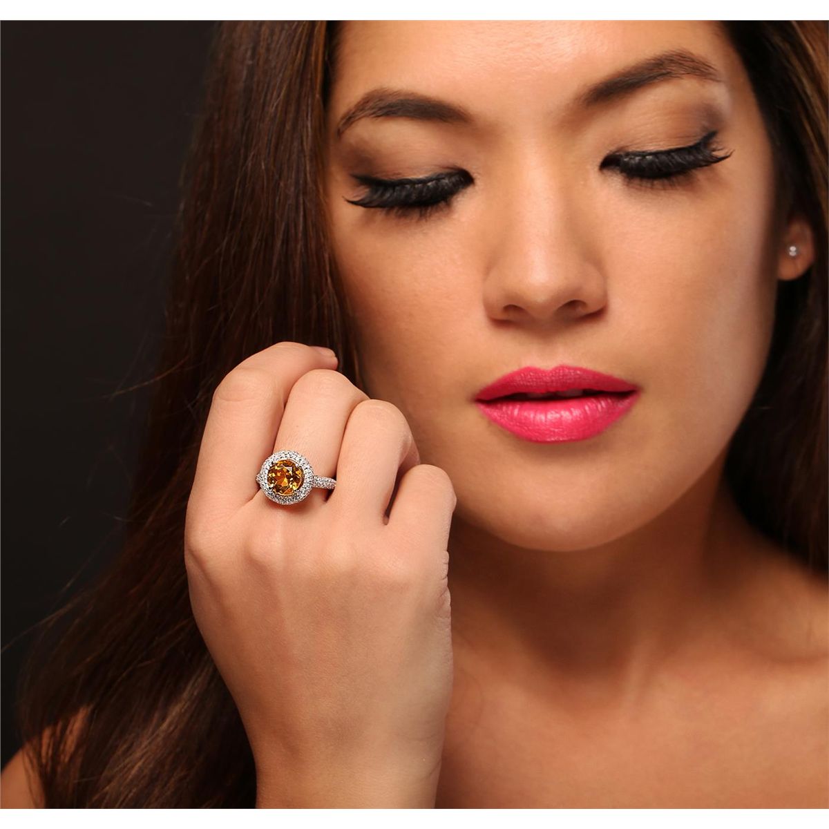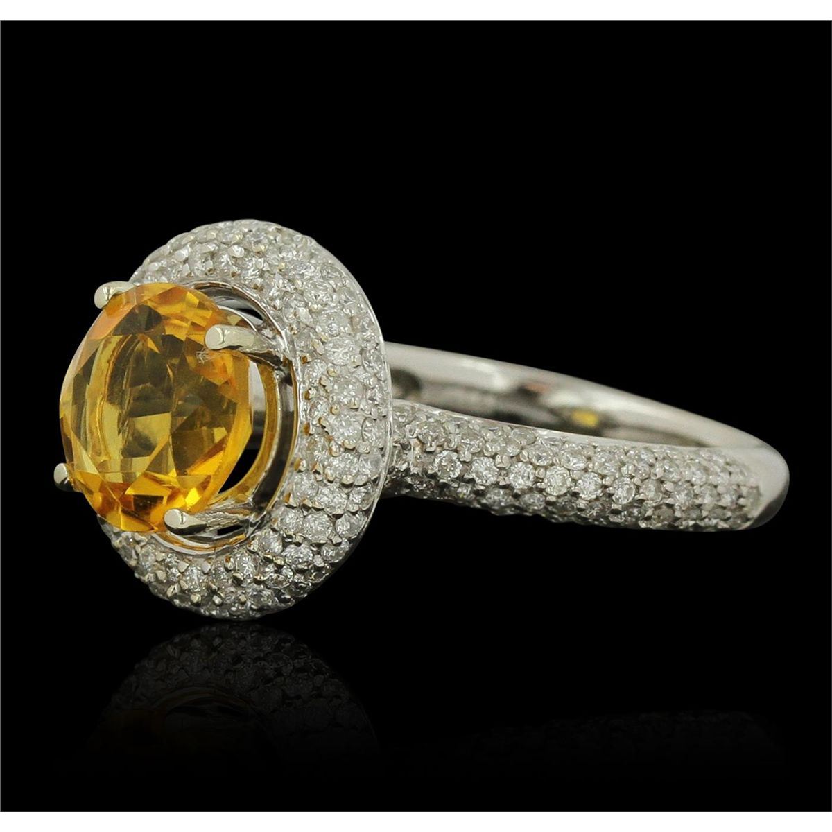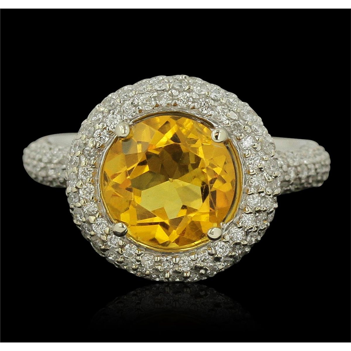 One electronically tested 14KT white gold Ladies combination cast & assembled ring with a bright polish finish. Condition is new. Identified with markings of "14K". Containing: One prong set round modified brilliant cut natural citrine quartz, measuring 9.10 - 9.10 x 6.10 mm, exact weight 2.70ct., clarity is eye clean, type I, medium light, moderately strong, orangy yellow color, (GIA oY 4/4), cut is very good. Colored gemstones are presumed to have been subjected to commonly used color/clarity enhancement processes. One Hundred Seventy-One bead set round brilliant cut diamonds, measuring 1.00 - 1.00 x 0.60mm (depth est.) approximate. Total Weight of 171 Stones = 1.29ct. Clarity: I-2 to I-3. Color: I - J, Cut is Good. Total Weight of Colored Stones 2.70ct. Total Weight of Diamonds 1.29ct. Total Weight of Ring 5.80 grams. GGL Appraised at $4,935.00.