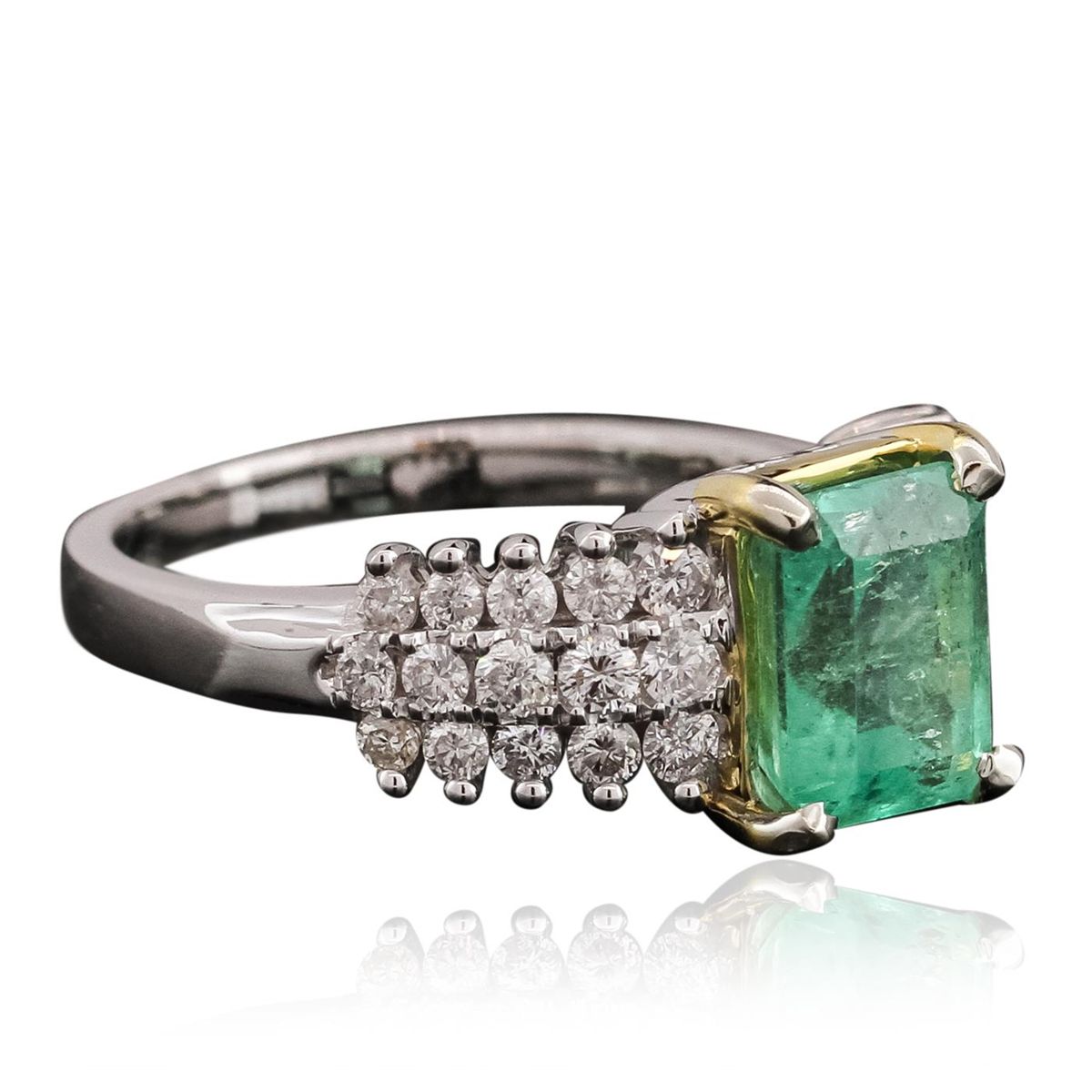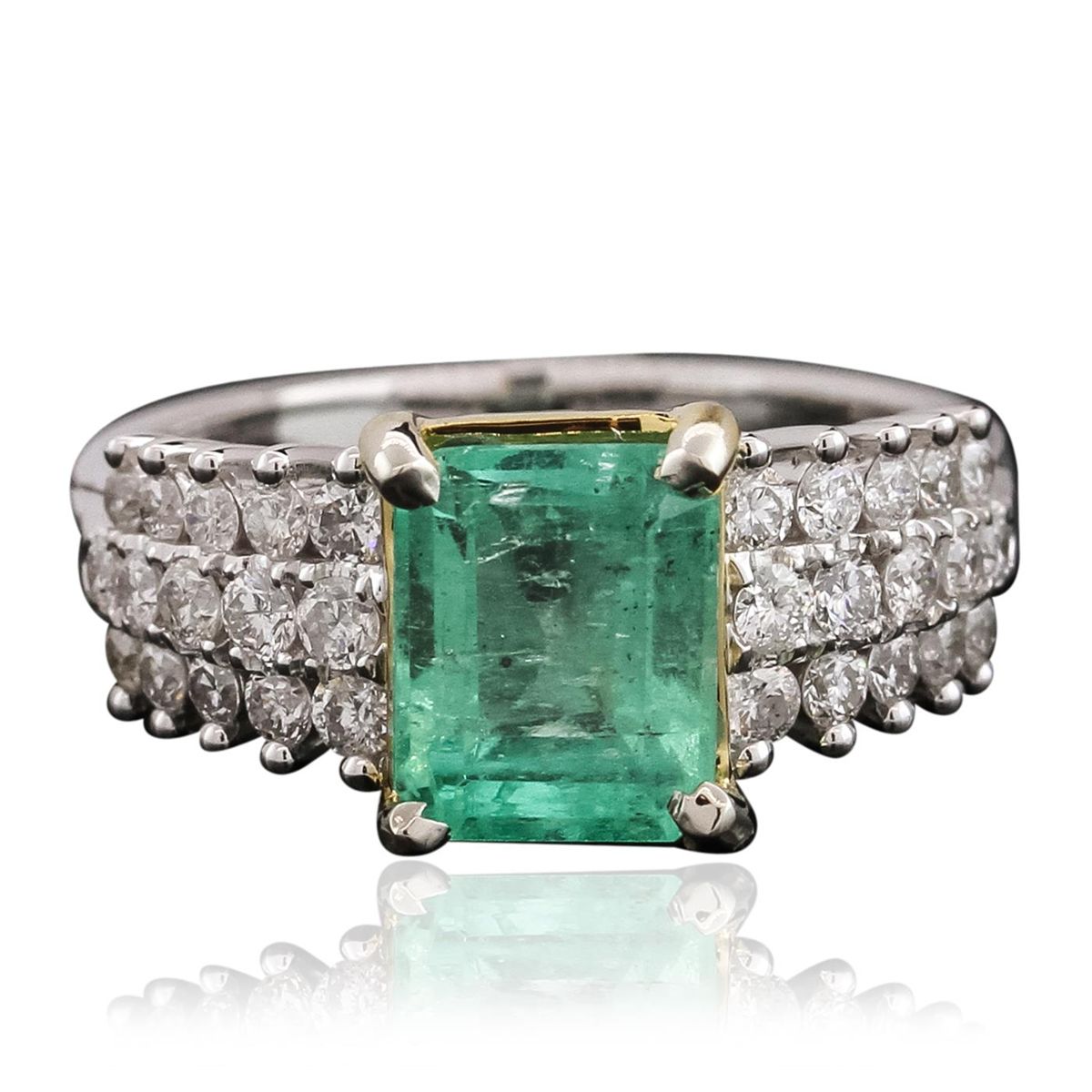 One electronically tested 14KT white gold ladies cast emerald and diamond ring. The featured emerald is supported by diamond set shoulders, completed by a two and one-half millimeter wide band. Bright polish with yellow gold accents. Identified with markings of "14K". Condition is new, good workmanship. Containing: One prong set rectangular step cut natural emerald, measuring 8.60 x 6.85 x 5.20mm, 8% bulge factor, approximate weight of 2.70ct., clarity is heavily included, type III, medium, very slightly grayish, very slightly bluish green color, (GIA vslbG 5/3), cut is good. Transmitting light with a minimum of distortion, transparent. Naturally occurring internal & external characteristics are present. Indications of oil residue. Graded in the setting. Thirty prong set round brilliant cut diamonds, measuring 1.90 - 1.80 x 1.11mm (depth est.) approximate total weight of 30 Stones = 0.79ct. Graded in the setting. Clarity: SI-2 to I-1. Color: G - I. Total Weight of Colored Stones 2.70ct. Total Weight of Diamonds 0.79ct. Total Weight of Ring 5.65 grams. AIG Appraised at $7,170.00.