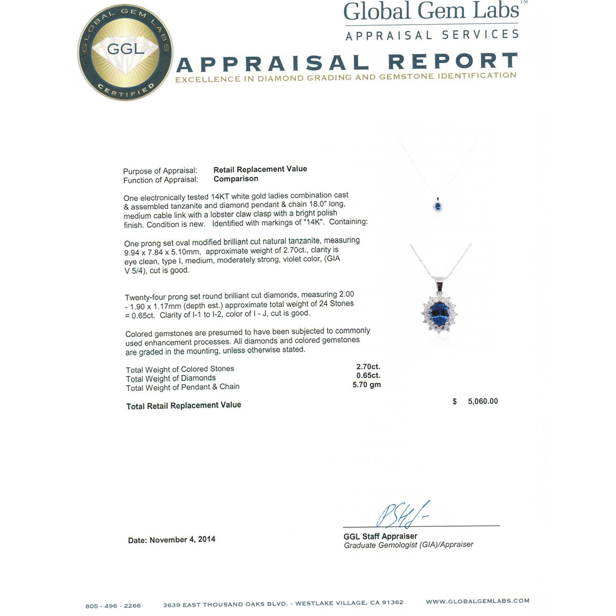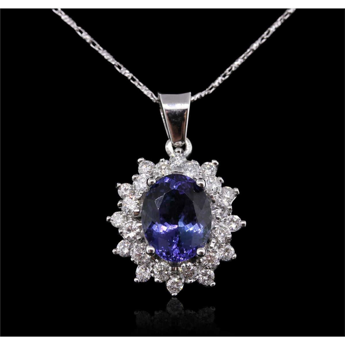 One electronically tested 14KT white gold ladies combination cast & assembled tanzanite and diamond pendant & chain 18.0" long, medium cable link with a lobster claw clasp with a bright polish finish. Identified with markings of "14K". Condition is new. Containing: One prong set oval modified brilliant cut natural tanzanite, measuring 9.94 x 7.84 x 5.10mm, approximate weight of 2.70ct., clarity is eye clean, type I, medium, moderately strong, violet color, (GIA V 5/4), cut is good. Twenty-Four prong set round brilliant cut diamonds, measuring 2.00 - 1.90 x 1.17mm (depth est.) approximate total weight of 24 Stones = 0.65ct. Clarity: I-1 to I-2. Color: I - J, Cut is Good. Colored gemstones are presumed to have been subjected to commonly used enhancement processes. All diamonds and colored gemstones are graded in the mounting, unless otherwise stated. Total Weight of Colored Stones 2.70ct. Total Weight of Diamonds 0.65ct. Total Weight of Pendant & Chain 5.70 grams. GGL Appraised at $5,060.00.