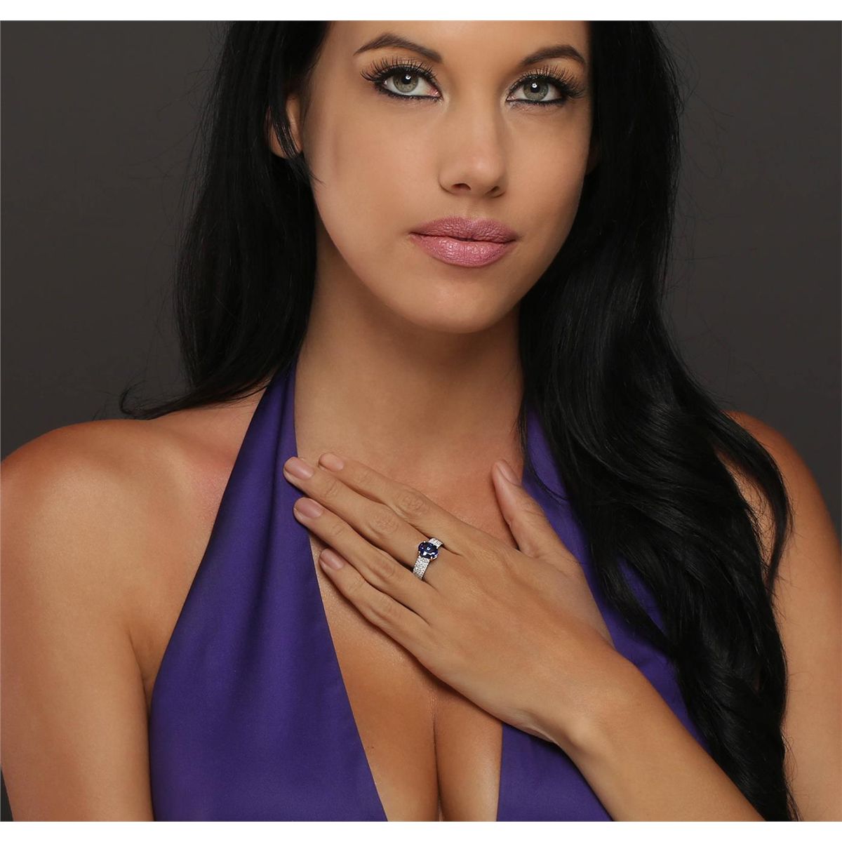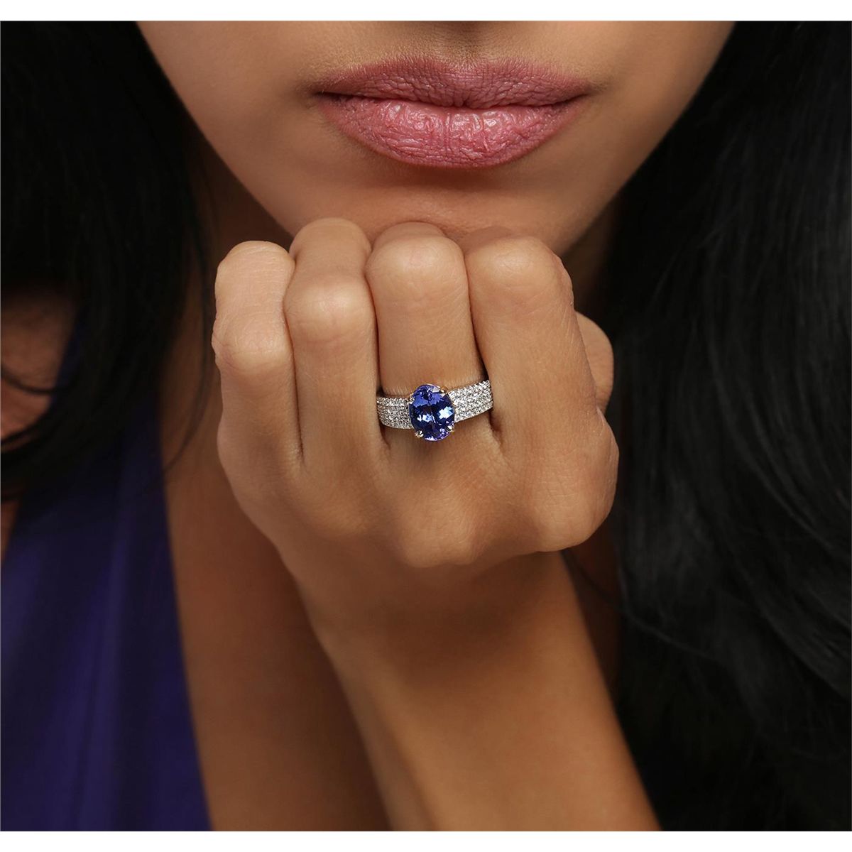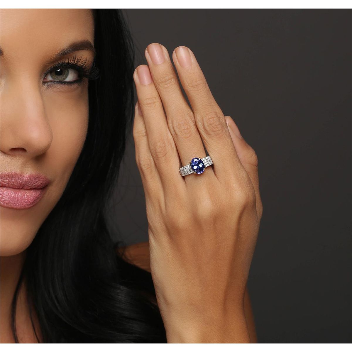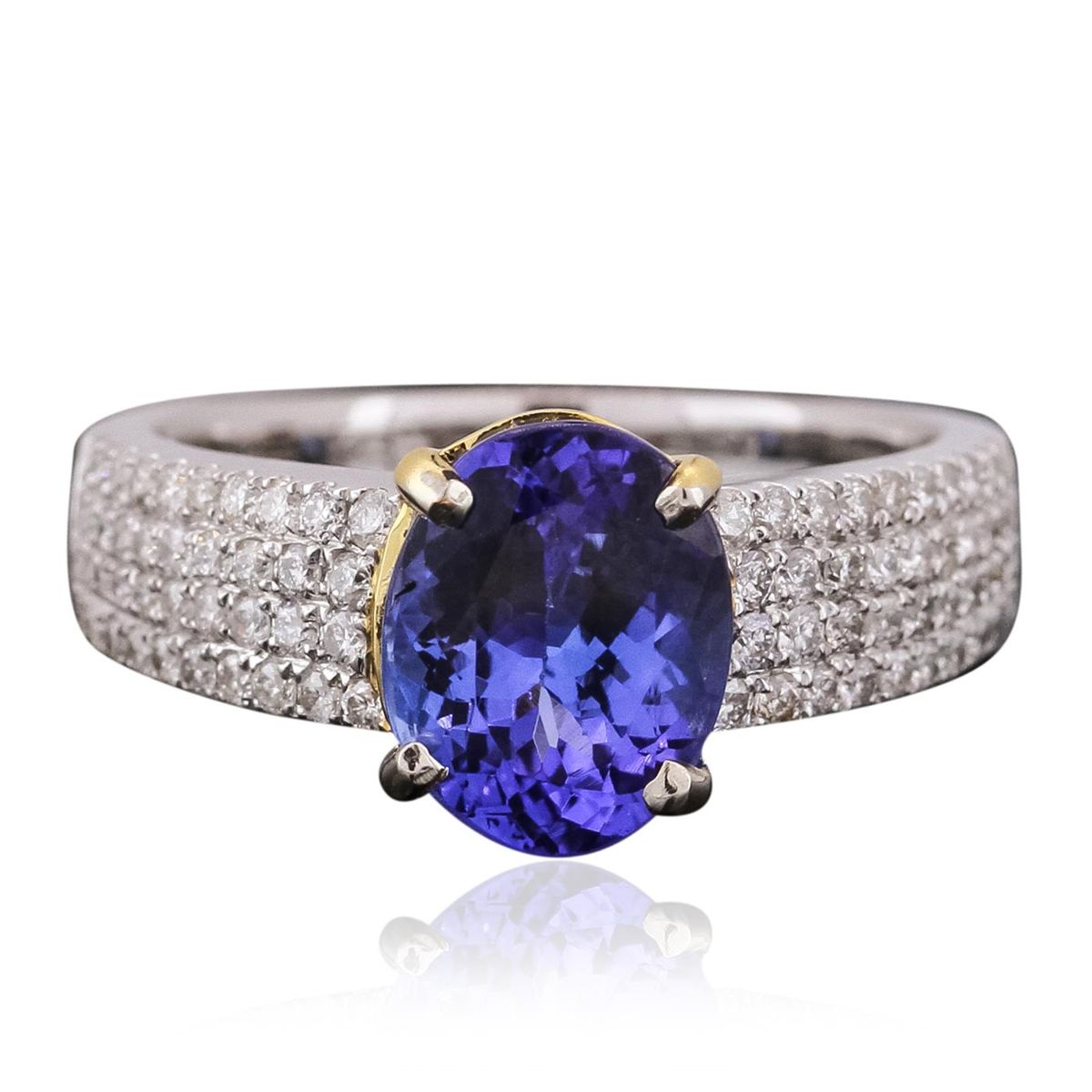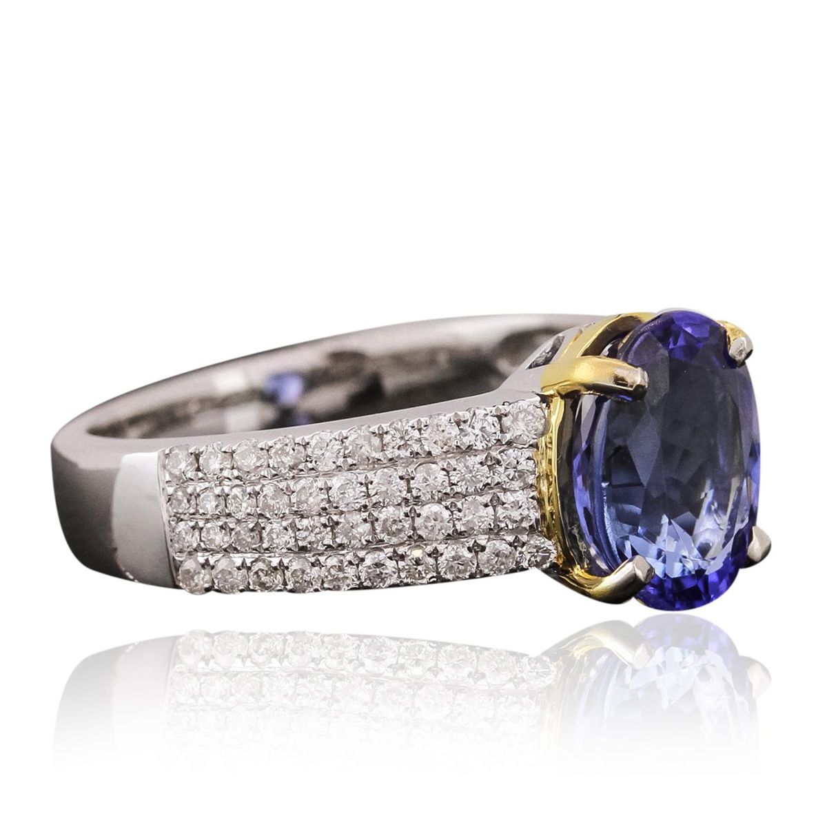 One electronically tested 14KT white gold ladies cast tanzanite and diamond ring. The featured tanzanite is supported by diamond set shoulders, completed by a three millimeter wide band. Bright polish finish with yellow gold accents. Identified with markings of "14K". Condition is new, good workmanship. Containing: One prong set oval brilliant cut natural tanzanite, measuring 9.60 x 7.50 x 5.10mm, 8% bulge factor, approximate weight of 2.70ct., clarity is eye clean, type I, medium dark, very slightly grayish, bluish violet color, (GIA bV 6/3), cut is good. Transmitting light with no distortion, transparent. Graded in the setting.Tanzanite is a very rare gemstone that is only found in the country of Tanzania. Originally discovered in 1967. Tiffany & Company, named the stone Tanzanite. It is found in the Usumburu Mountains that border the Umba Valley of northern Tanzania. Tanzanite occurs in gray, brown, violet, blue, reddish-purple, & green. The gem is interesting because of its exceptional pleochroism. Rotated in different directions a tanzanite will exhibit multiple changes of color. Tanzanite has a low tolerance to ultrasonic cleaning, and should not be cleaned using this method.Eighty prong set round brilliant cut diamonds, measuring 1.30 - 1.20 x 0.75mm (depth est.) approximate total weight of 80 Stones = 0.66ct. Graded in the setting. Clarity: SI-2 to I-2. Color: G - I. Total Weight of Colored Stones 2.70ct. Total Weight of Diamonds 0.66ct. Total Weight of Ring 5.27 grams. AIG Appraised at $9,010.00.
