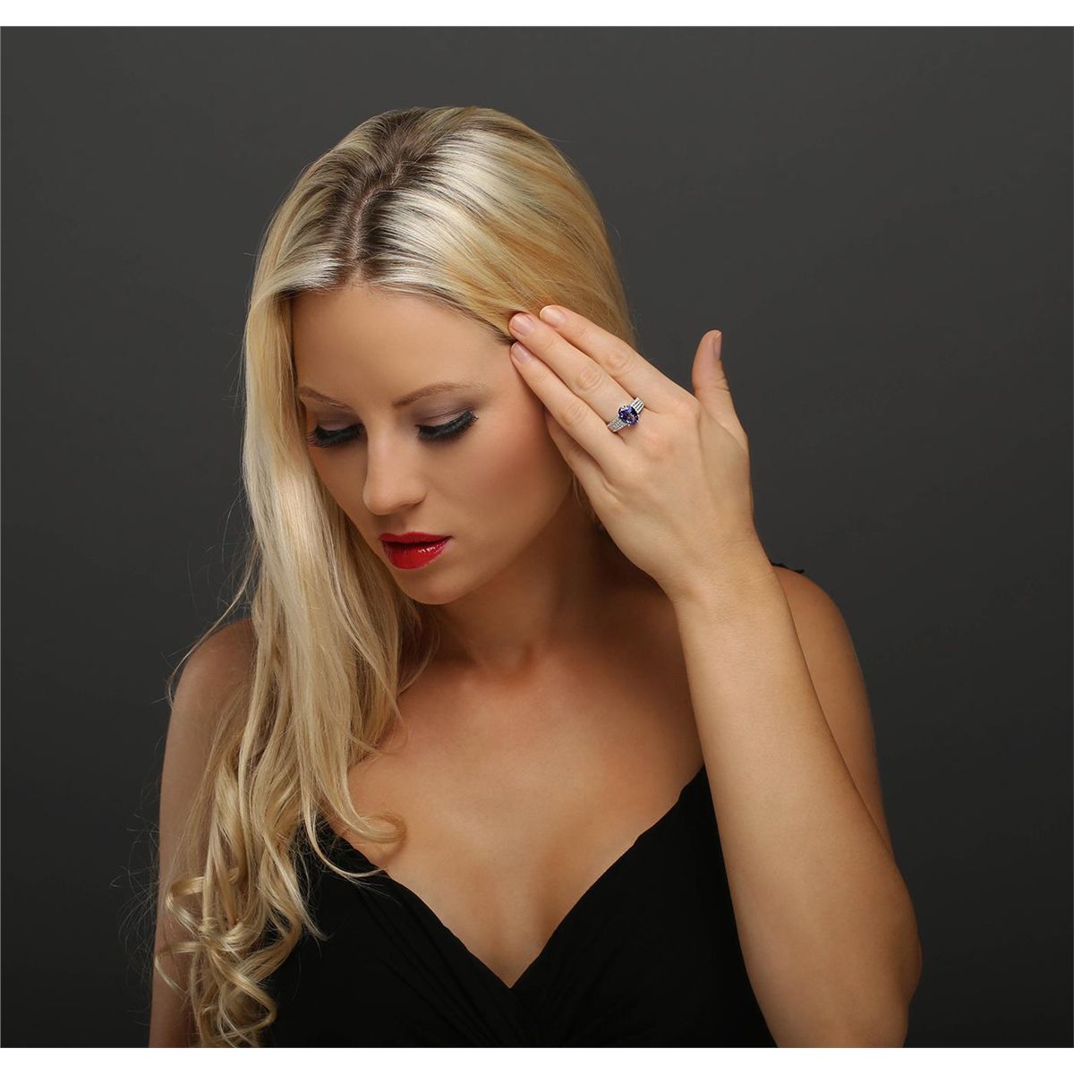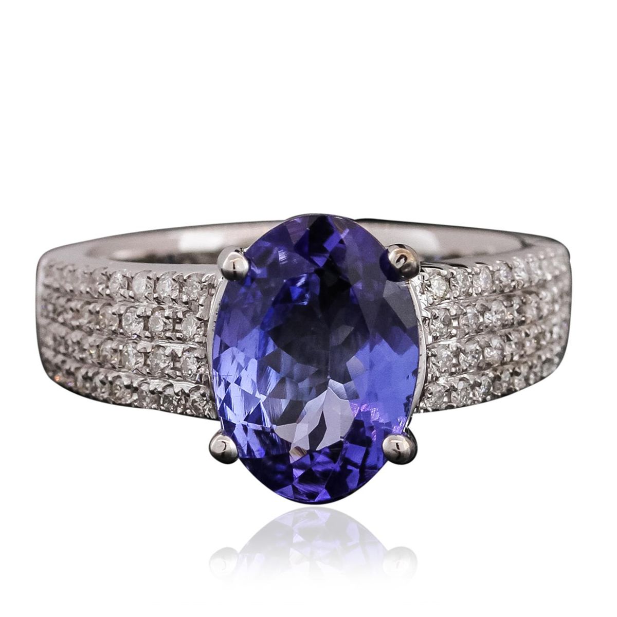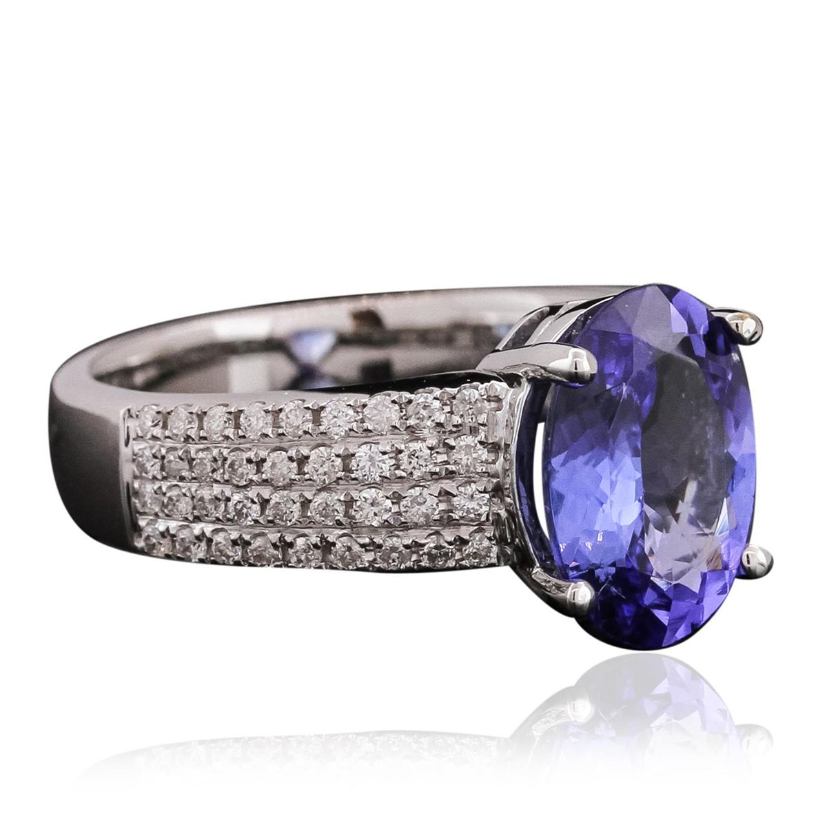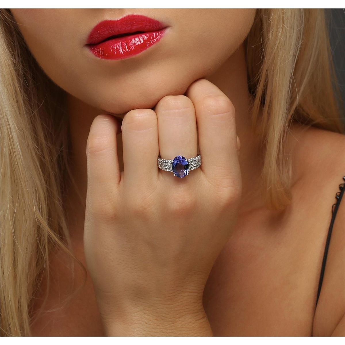 One electronically tested 14KT white gold ladies combination cast & assembled tanzanite and diamond ring with a flat shank with a bright polish finish. Identified with markings of "14K". Condition is new. Containing: One prong set oval modified brilliant cut natural tanzanite, measuring 11.31 x 8.04 x 4.30mm, approximate weight of 2.70ct., clarity is eye clean, type I, medium, moderately strong, bluish violet color, (GIA bV 5/4), cut is good. Seventy-Two prong set round brilliant cut diamonds, measuring 1.10 - 1.10 x 0.66mm (depth est.) stated total weight of 72 Stones = 0.35ct. Clarity: I-1 to I-2. Color: I - J, Cut is Good. Colored gemstones are presumed to have been subjected to commonly used enhancement processes. All diamonds and colored gemstones are graded in the mounting, unless otherwise stated total weight of Colored Stones 2.70ct. Total Weight of Diamonds 0.35ct. Total Weight of Ring 5.90 grams. GGL Appraised at $6,850.00.