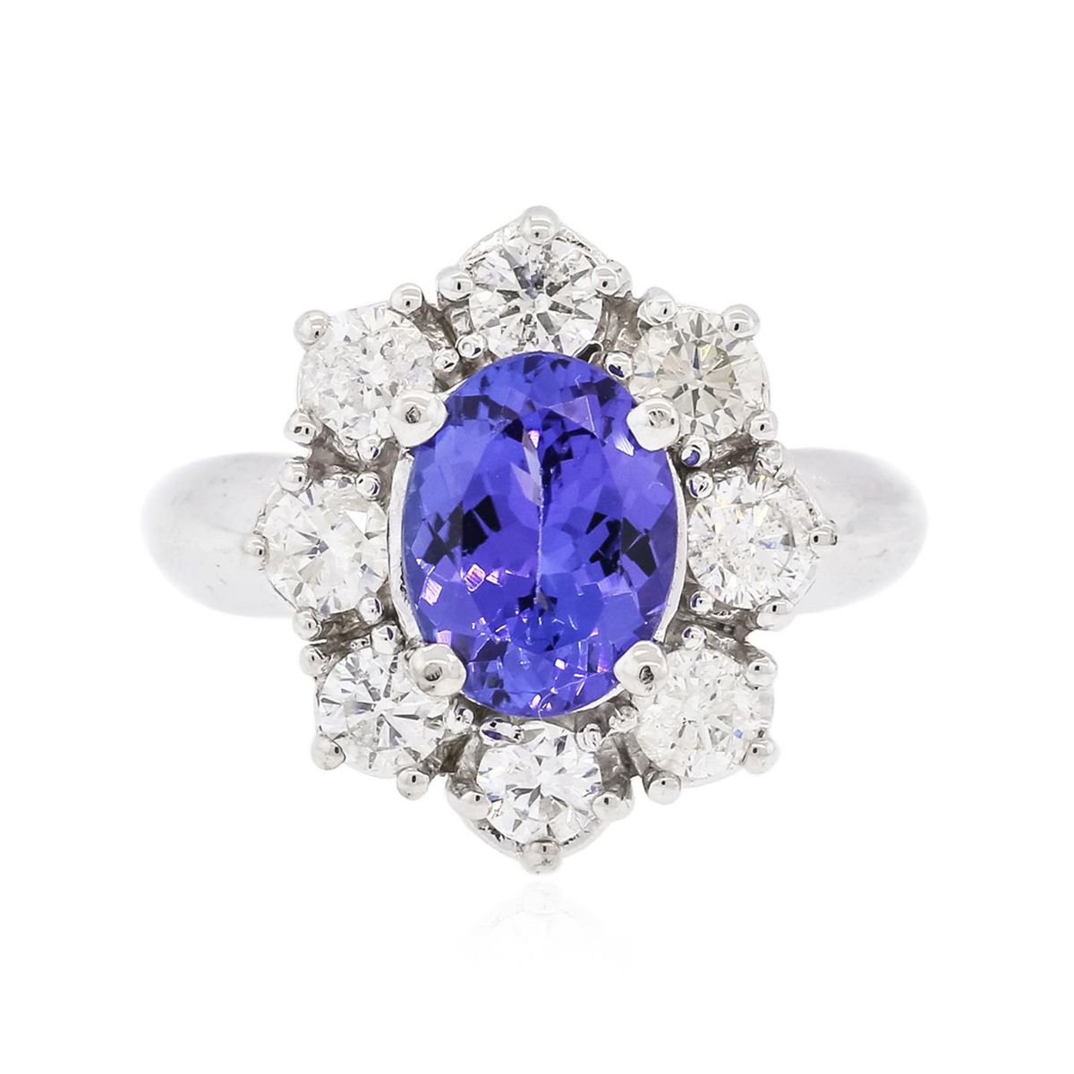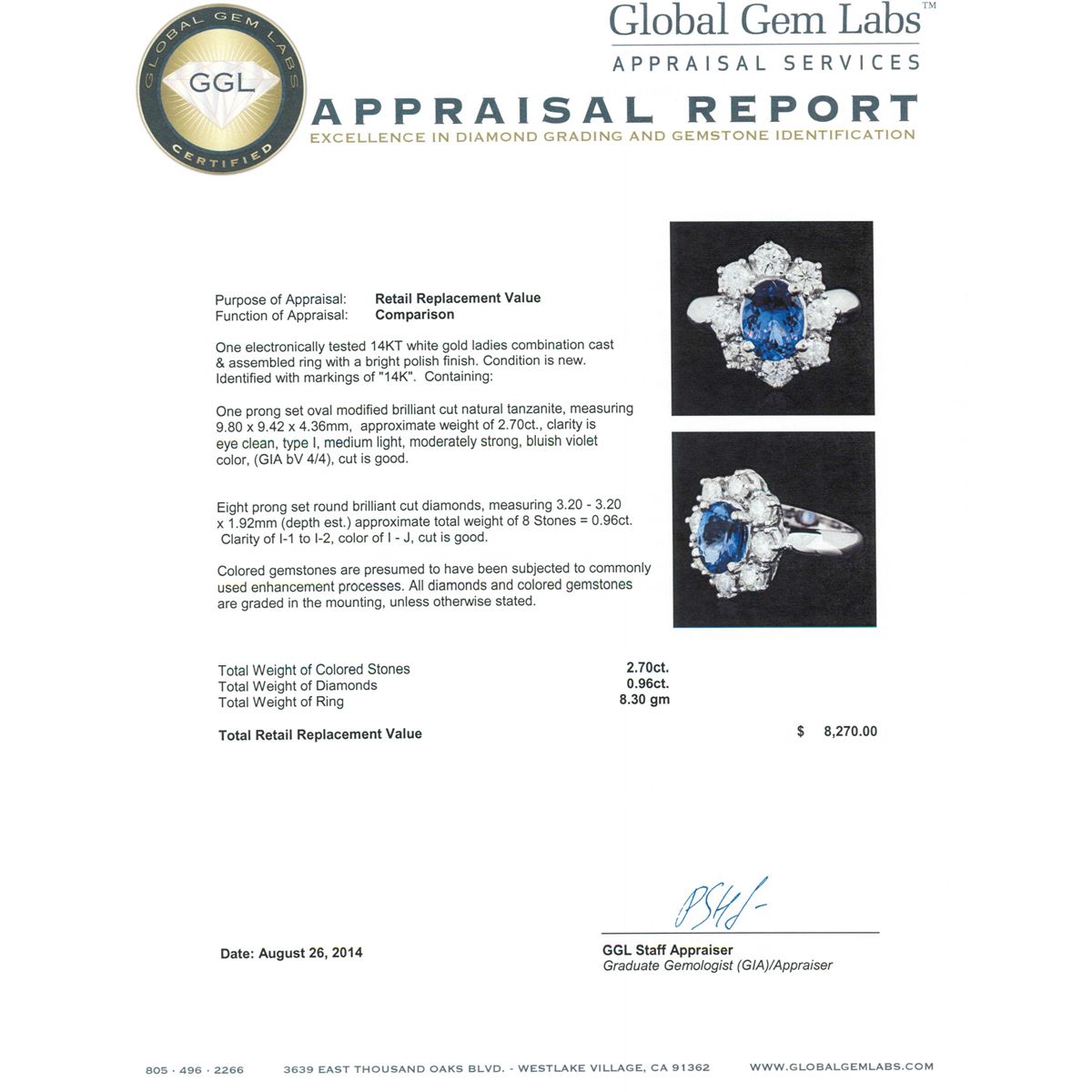 One electronically tested 14KT white gold ladies combination cast & assembled ring with a bright polish finish. Identified with markings of "14K". Condition is new. Containing: One prong set oval modified brilliant cut natural tanzanite, measuring 9.80 x 9.42 x 4.36mm, approximate weight of 2.70ct., clarity is eye clean, type I, medium light, moderately strong, bluish violet color, (GIA bV 4/4), cut is good. Eight prong set round brilliant cut diamonds, measuring 3.20 - 3.20 x 1.92mm (depth est.) approximate total weight of 8 Stones = 0.96ct. Clarity: I-1 to I-2. Color: I - J, Cut is Good. Colored gemstones are presumed to have been subjected to commonly used enhancement processes. All diamonds and colored gemstones are graded in the mounting, unless otherwise stated. Total Weight of Colored Stones 2.70ct. Total Weight of Diamonds 0.96ct. Total Weight of Ring 8.30 grams. GGL Appraised at $8,270.00.