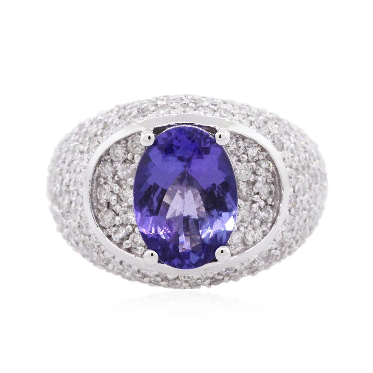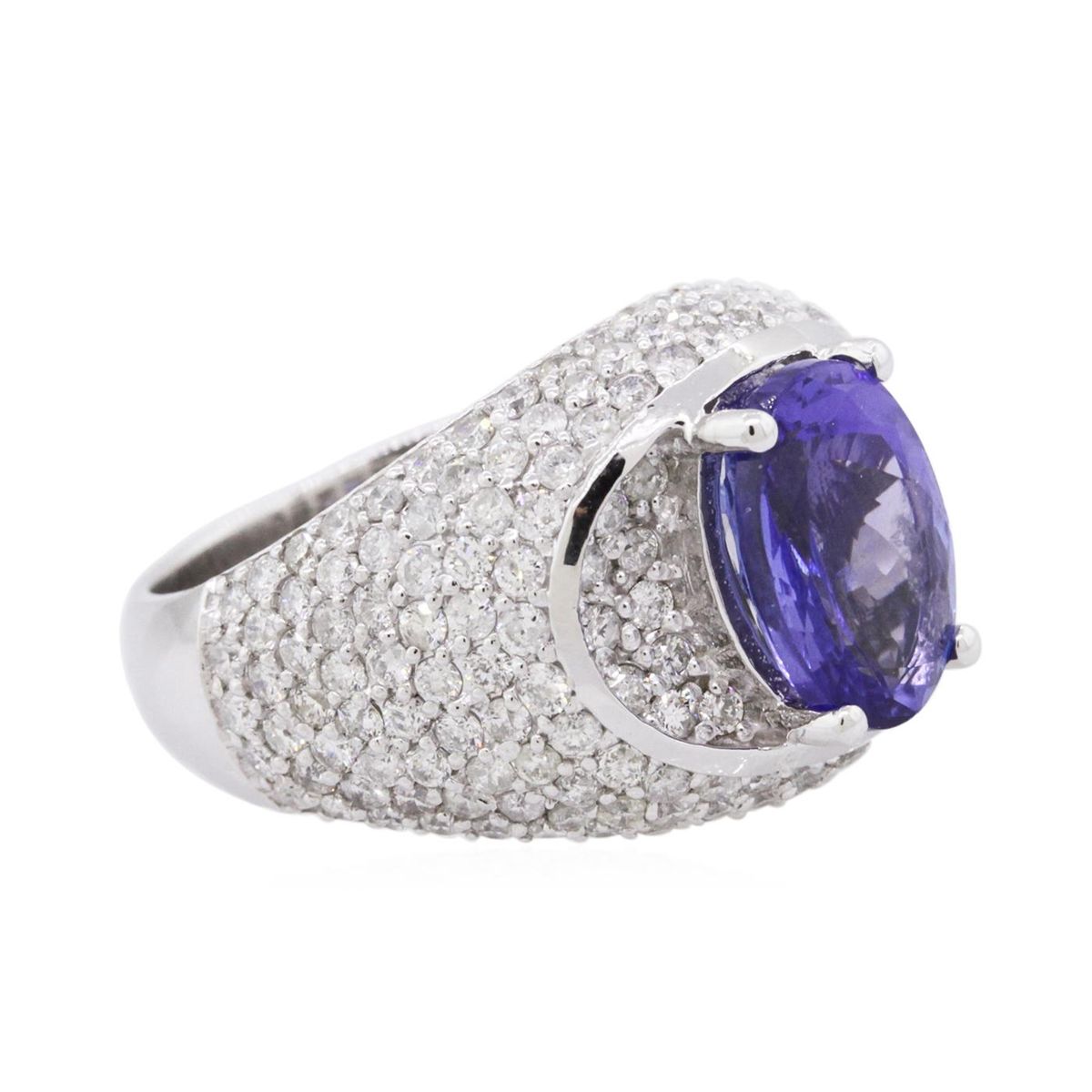 One electronically tested 14KT white gold ladies cast tanzanite and diamond ring with a bright polish finish. Condition is new, good workmanship. The featured tanzanite is set within an elaborate diamond set curvature, completed by a four and one-half millimeter wide band. Containing: One prong set oval mixed cut natural tanzanite, measuring 10.85 x 7.85 x 4.35mm, 6% bulge factor, approximate weight of 2.70ct., clarity is eye clean, type I, medium dark, very slightly grayish, bluish violet color, (GIA bV 6/3), cut is good. Transmitting light with no distortion, transparent. Graded in the setting. Tanzanite is a very rare gemstone that is only found in the country of Tanzania. Originally discovered in 1967. Tiffany & Company, named the stone Tanzanite. It is found in the Usumburu Mountains that border the Umba Valley of northern Tanzania. Tanzanite occurs in gray, brown, violet, blue, reddish-purple, & green. The gem is interesting because of its exceptional pleochroism. Rotated in different directions a tanzanite will exhibit multiple changes of color. Tanzanite has a low tolerance to ultrasonic cleaning, and should not be cleaned using this method. One Hundred Ninety-Four prong set round brilliant cut diamonds, measuring 1.60 - 1.40 x 0.90mm (depth est.) approximate total weight of 194 Stones = 2.48ct. Graded in the setting. Clarity: SI-1 to I-1. Color: G - I. Total Weight of Colored Stones 2.70ct. Total Weight of Diamonds 2.48ct. Total Weight of Watch 10.06 grams. AIG Appraised at $14,775.00.