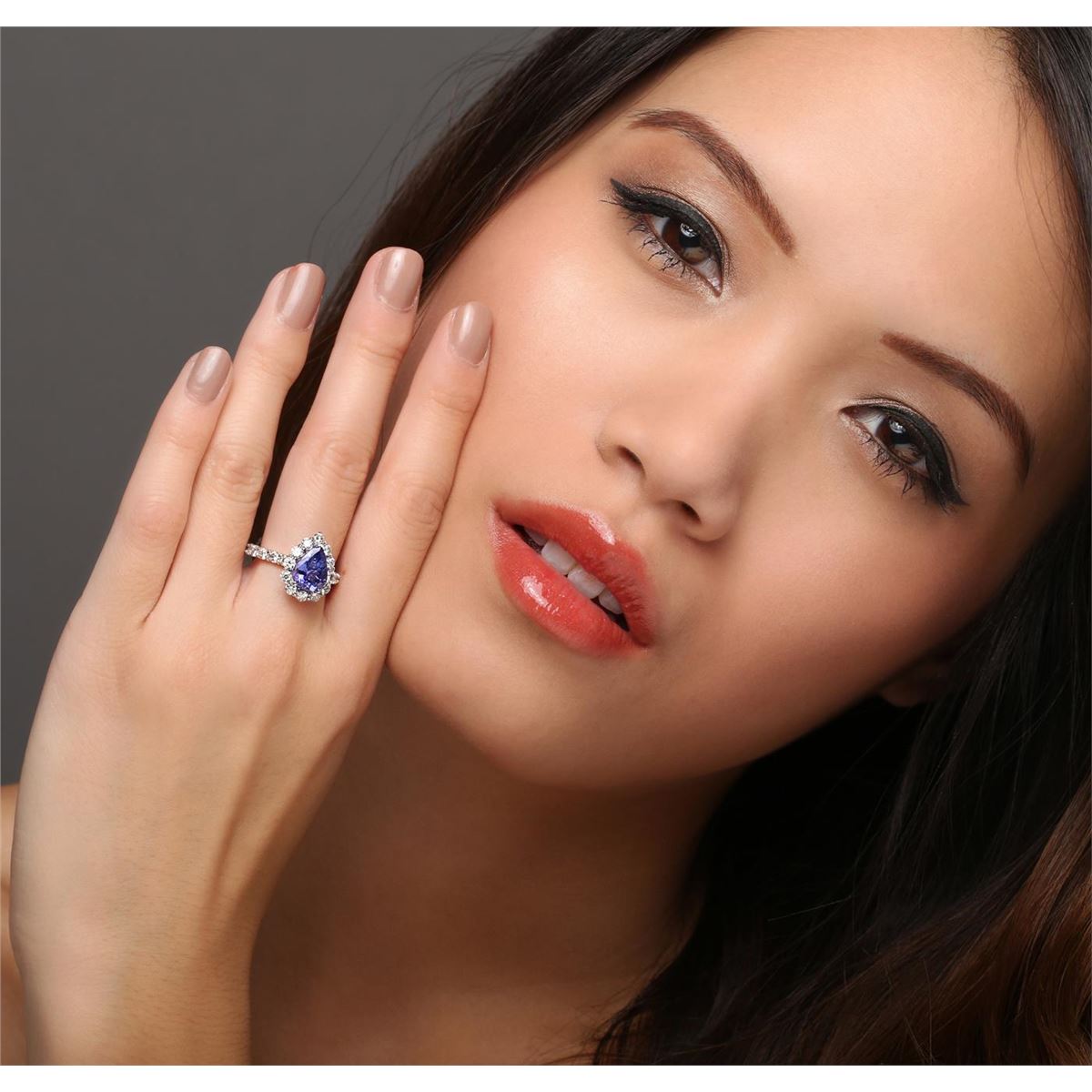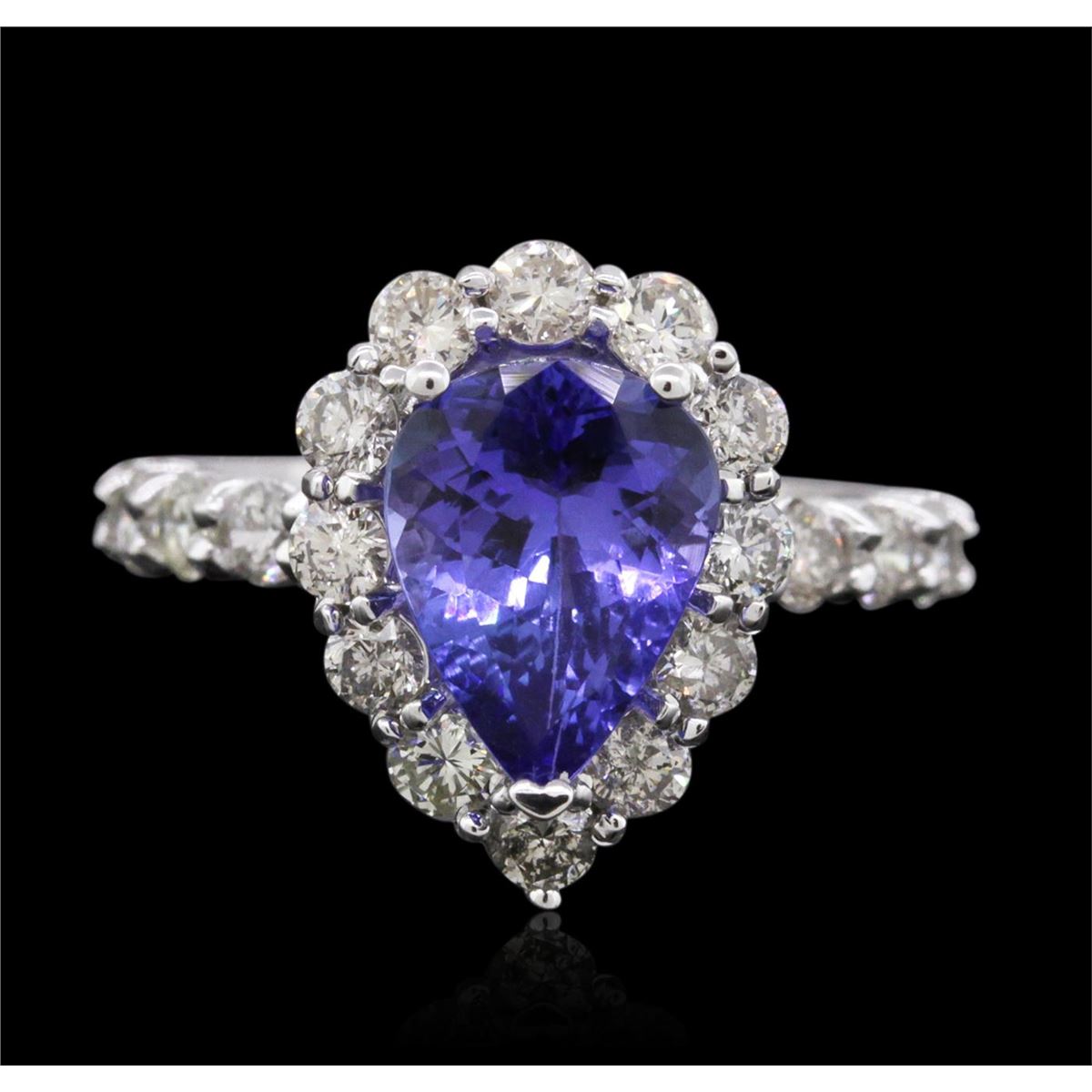 One electronically tested 14KT white gold ladies combination cast & assembled sapphire and diamond ring with a bright polish finish. Identified with markings of "14K". Condition is new. Containing: One prong set pear modified brilliant cut natural tanzanite, measuring 10.59 x 7.65 x 4.97mm, approximate weight of 2.70ct., clarity is eye clean, type I, medium, moderately strong, violet color, (GIA V 5/4), cut is good. Twenty-Two prong set round brilliant cut diamonds, measuring 2.50 - 2.50 x 1.50mm (depth est.) approximate total weight of 22 Stones = 1.26ct. Clarity: SI-2 to I-1. Color: J, Cut is Good. Colored gemstones are presumed to have been subjected to commonly used enhancement processes. All diamonds and colored gemstones are graded in the mounting, unless otherwise stated. Total Weight of Colored Stones 2.70ct. Total Weight of Diamonds 1.26ct. Total Weight of Ring 4.70 grams. GGL Appraised at $6,010.00.
