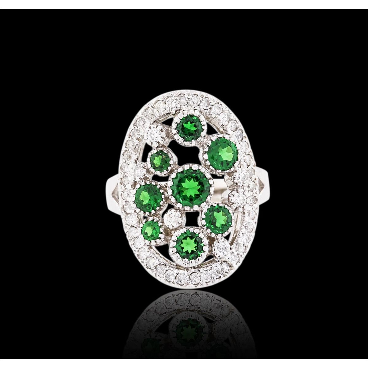 One electronically tested 14KT white gold ladies cast tsavorite and diamond ring with a bright finish. The ring features a series of round tsavorites, set within a diamond bezel, supported by tapering shoulders, completed by a three millimeter wide band. Identified with markings of "K14". Condition is good. Containing: Eight bezel set round mixed cut natural tsavorite garnets, measuring 4.70 - 2.60 x 2.03 mm, approximate total weight of 2.70ct., clarity is eye clean, type II, medium dark, strong, green color, (GIA G 6/5), cut is good. Transmitting light with no distortion, transparent. Graded in the setting. Forty-Six prong set round brilliant cut diamonds, measuring 1.80 - 1.30 x 0.95mm (depth est.) approximate total weight of 46 Stones = 0.64ct. Graded in the setting. Clarity I-1 to I-2. Color G - H. Total Weight of Colored Stones 2.70ct. Total Weight of Diamonds 0.64ct. Total Weight of Ring 8.58 grams. AIG Appraised at $6,880.00.