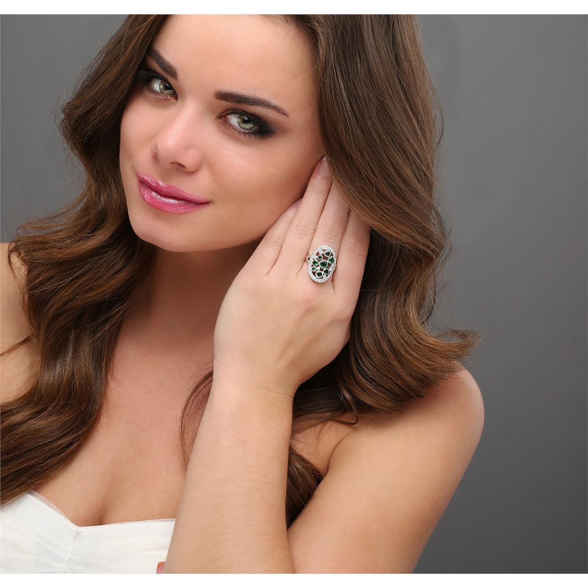 One electronically tested 14KT white gold ladies cast tsavorite and diamond ring with a bright finish. The ring features a series of round tsavorites, set within a diamond bezel, supported by tapering shoulders, completed by a three millimeter wide band. Identified with markings of "K14". Condition is good. Containing: Eight bezel set round mixed cut natural tsavorite garnets, measuring 4.70 - 2.60 x 2.03 mm, approximate total weight of 2.70ct., clarity is eye clean, type II, medium dark, strong, green color, (GIA G 6/5), cut is good. Transmitting light with no distortion, transparent. Graded in the setting. Forty-Six prong set round brilliant cut diamonds, measuring 1.80 - 1.30 x 0.95mm (depth est.) approximate total weight of 46 Stones = 0.64ct. Graded in the setting. Clarity I-1 to I-2. Color G - H. Total Weight of Colored Stones 2.70ct. Total Weight of Diamonds 0.64ct. Total Weight of Ring 8.58 grams. AIG Appraised at $6,880.00.