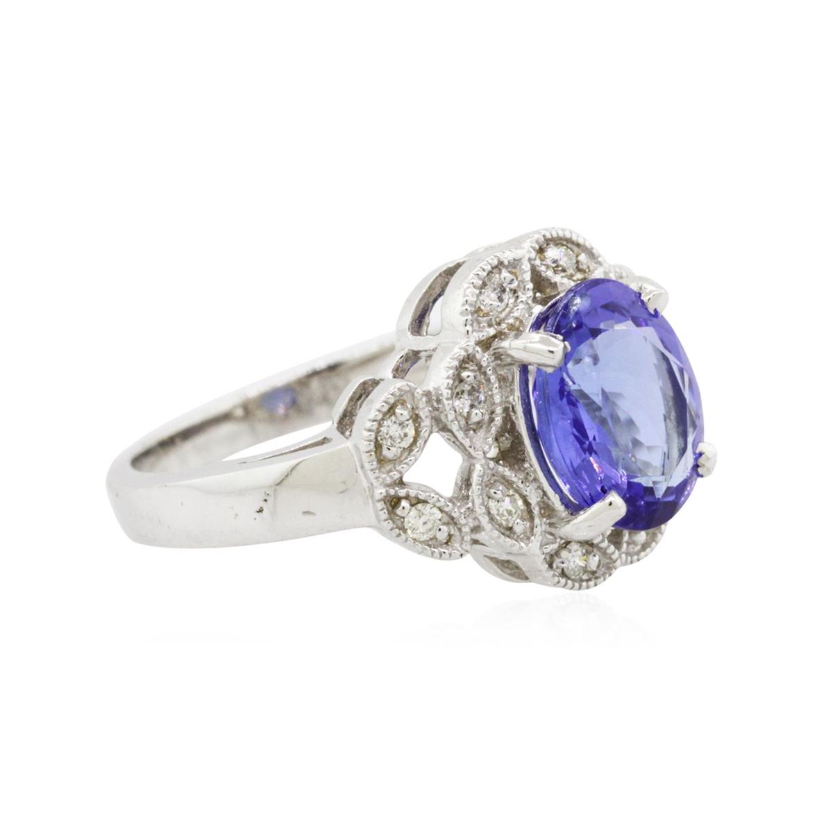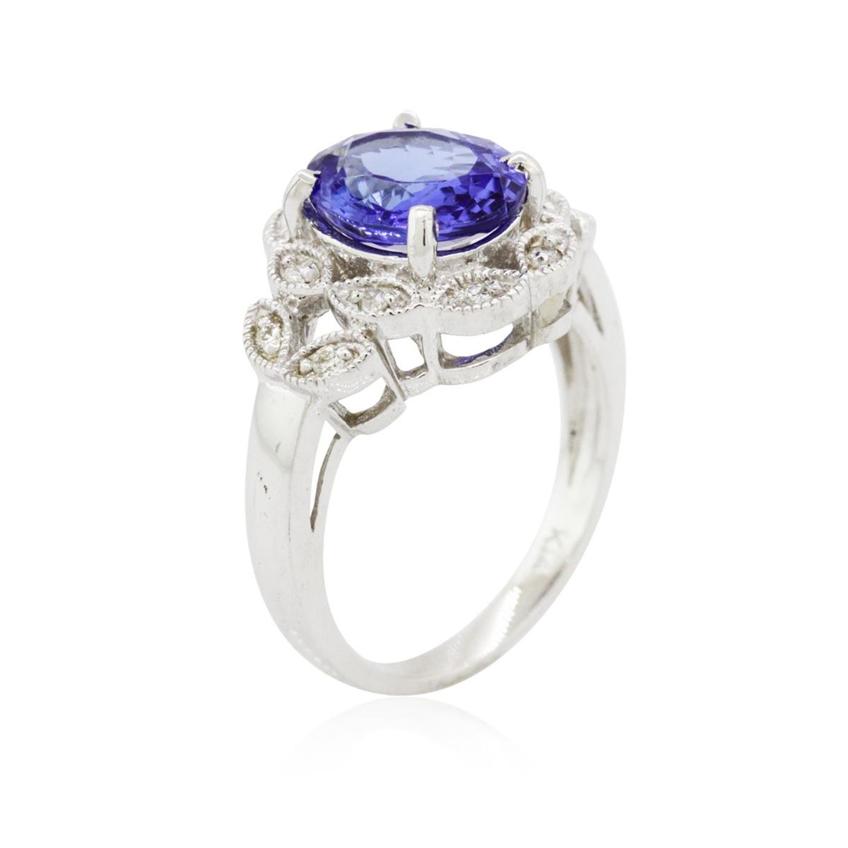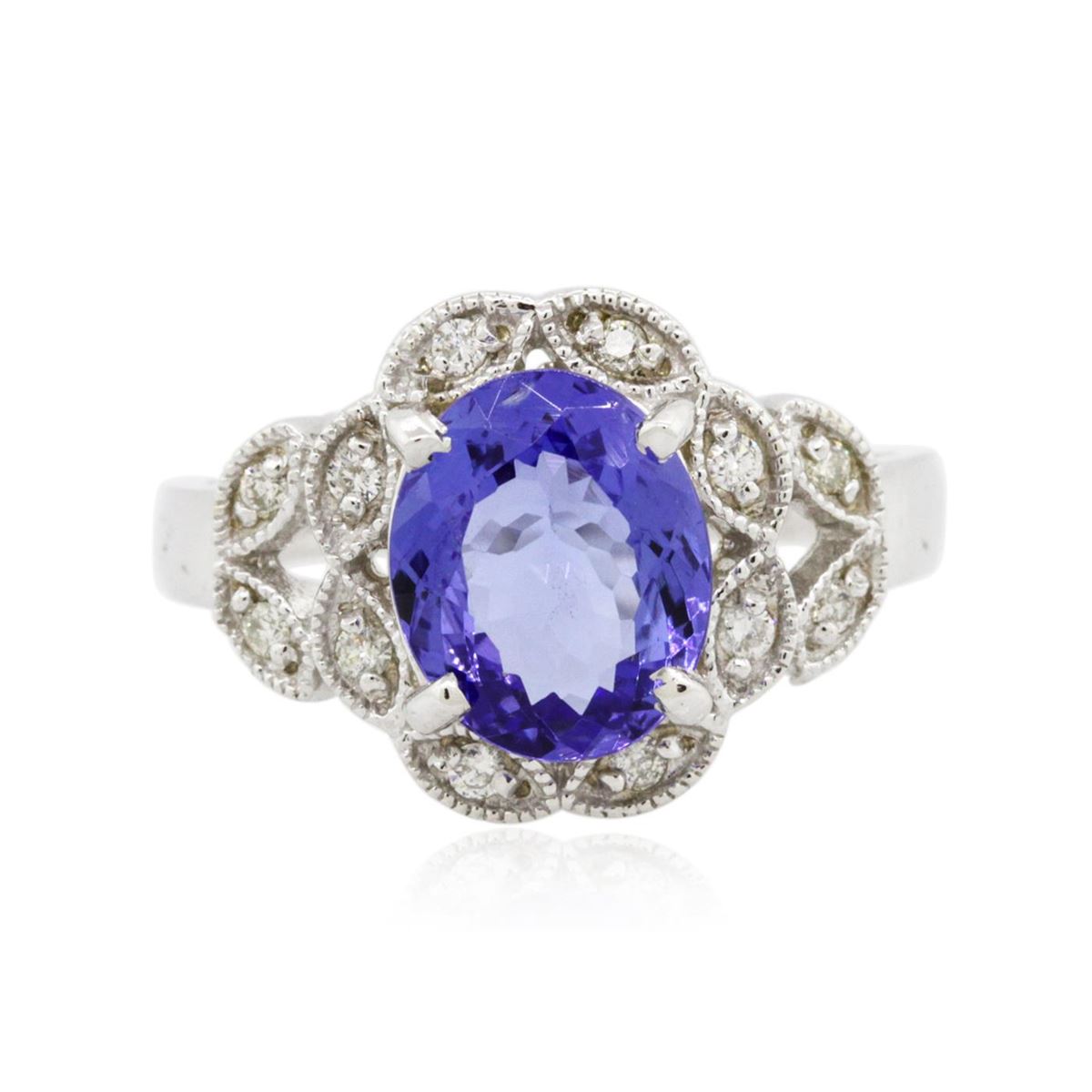 One electronically tested 14KT white gold ladies cast tanzanite and diamond ring. The featured tanzanite is set within a stylized diamond set floral bezel, completed by a two millimeter wide band. Bright polish finish with milgrain detailing. Identified with markings of "K14". Condition is new, good workmanship. Containing: One prong set oval mixed cut natural tanzanite, measuring 10.05 x 8.10 x 4.55mm, 8%. bulge factor, approximate weight of 2.71ct., clarity is eye clean, type I, medium dark, very slightly grayish, bluish violet color, (GIA bV 6/3), cut is good. Transmitting light with no distortion, transparent. Graded in the setting. Tanzanite is a very rare gemstone that is only found in the country of Tanzania. Originally discovered in 1967. Tiffany & Company, named the stone Tanzanite. It is found in the Usumburu Mountains that border the Umba Valley of northern Tanzania. Tanzanite occurs in gray, brown, violet, blue, reddish-purple, & green. The gem is interesting because of its exceptional pleochroism. Rotated in different directions a tanzanite will exhibit multiple changes of color. Tanzanite has a low tolerance to ultrasonic cleaning, and should not be cleaned using this method. Twelve bead set round brilliant cut diamonds, measuring 1.50 - 1.40 x 0.87mm (depth est.) approximate total weight of 12 Stones = 0.23ct. Graded in the setting. Clarity: SI-1 to I-1. Color: G - I. Total Weight of Colored Stones 2.71ct. Total Weight of Diamonds 0.23ct. Total Weight of Ring 5.44 grams. AIG Appraised at $7,780.00.