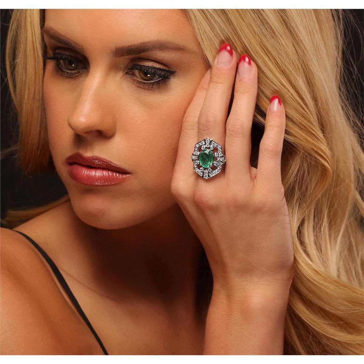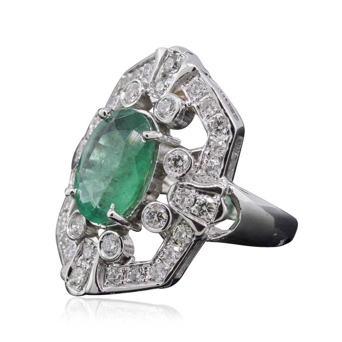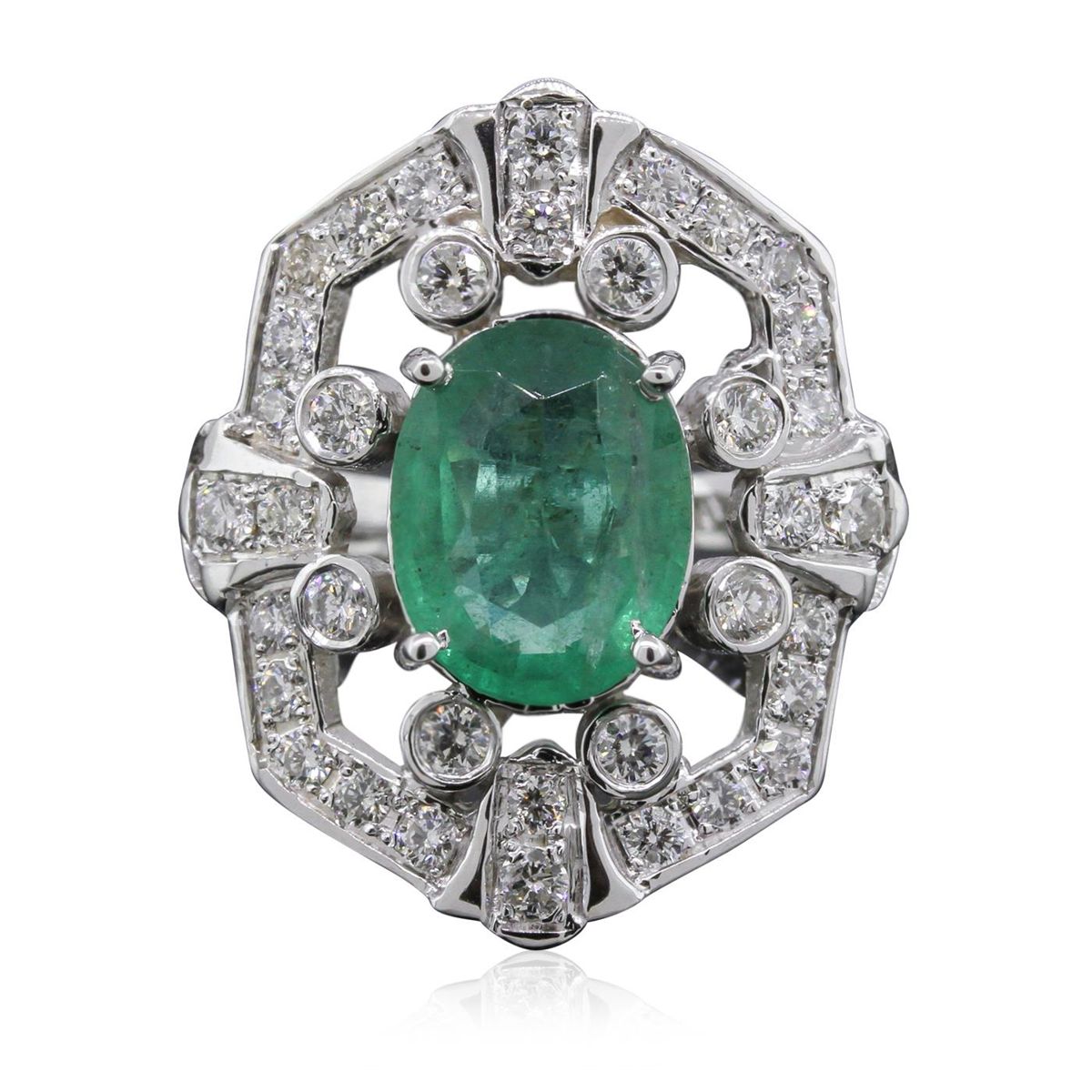 One electronically tested 14KT white gold Ladies combination cast & assembled fancy ring with a high polish finish. Condition is new. Identified with markings of "14K". Containing: One prong set oval modified brilliant cut natural emerald, measuring 11.40 x 9.20 x 4.70mm, approximate weight of 2.71ct., clarity is moderately included, type III, medium light, very slightly grayish, green color, (GIA G 4/3), cut is good. Colored gemstones are presumed to have been subjected to commonly used and possible undetectable color/clarity enhancement processes. Ten bezel set round brilliant cut diamonds, measuring 2.50 - 2.50 x 1.66mm (depth est.) approximate total weight of 10 Stones = 0.63ct. Clarity of SI-2 to I-1, Color of J, Cut is Good. Twenty-Seven bead set round brilliant cut diamonds, measuring 2.10 - 1.80 x 1.17mm (depth est.) approximate total weight of 27 Stones = 0.73ct. Clarity of SI-2 to I-1, Color of I - J, Cut is Good. Total Weight of Colored Stones 2.71ct. Total Weight of Diamonds 1.36ct. Total Weight of Ring 7.90 grams. GGL Appraised at $10,620.00.