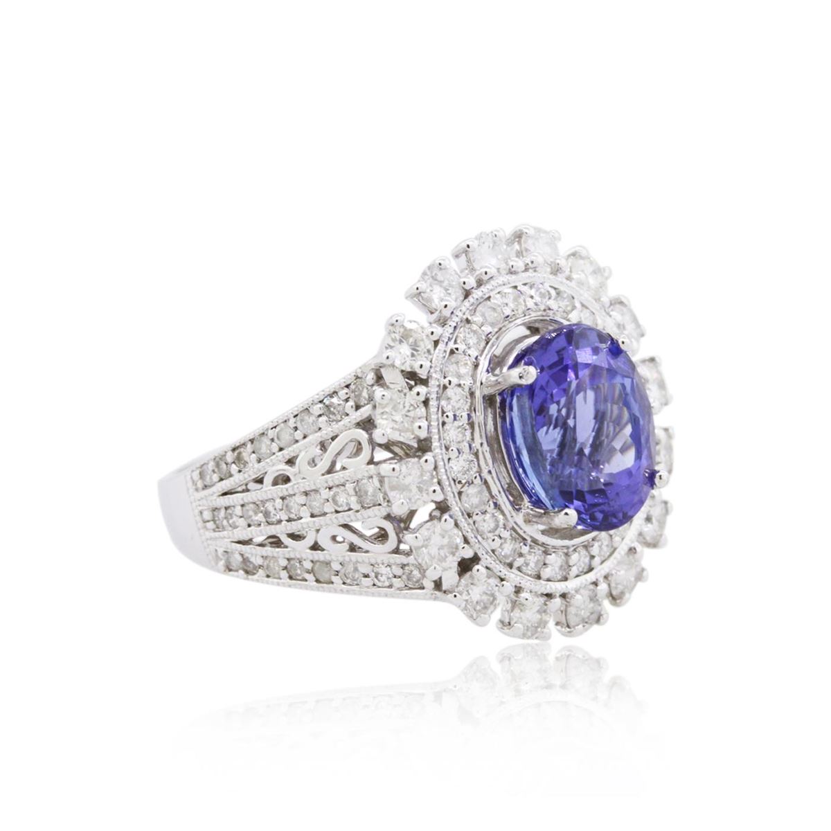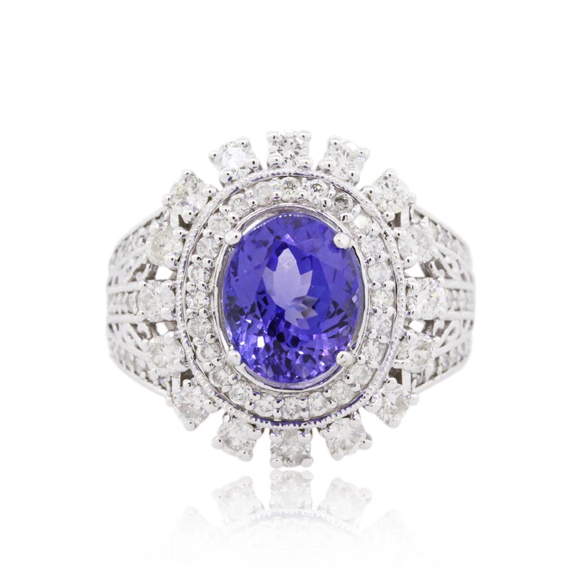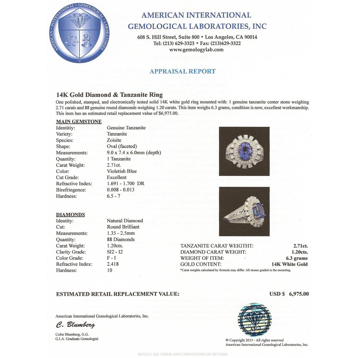 One polished, stamped, and electronically tested solid 14KT White Gold ring mounted with: 1 genuine tanzanite center stone weighing 2.71 carats and 88 genuine round diamonds weighing 1.20 carats. This item weighs 6.3 grams, condition is new, excellent workmanship. AIGL Appraised at $6,975.00.