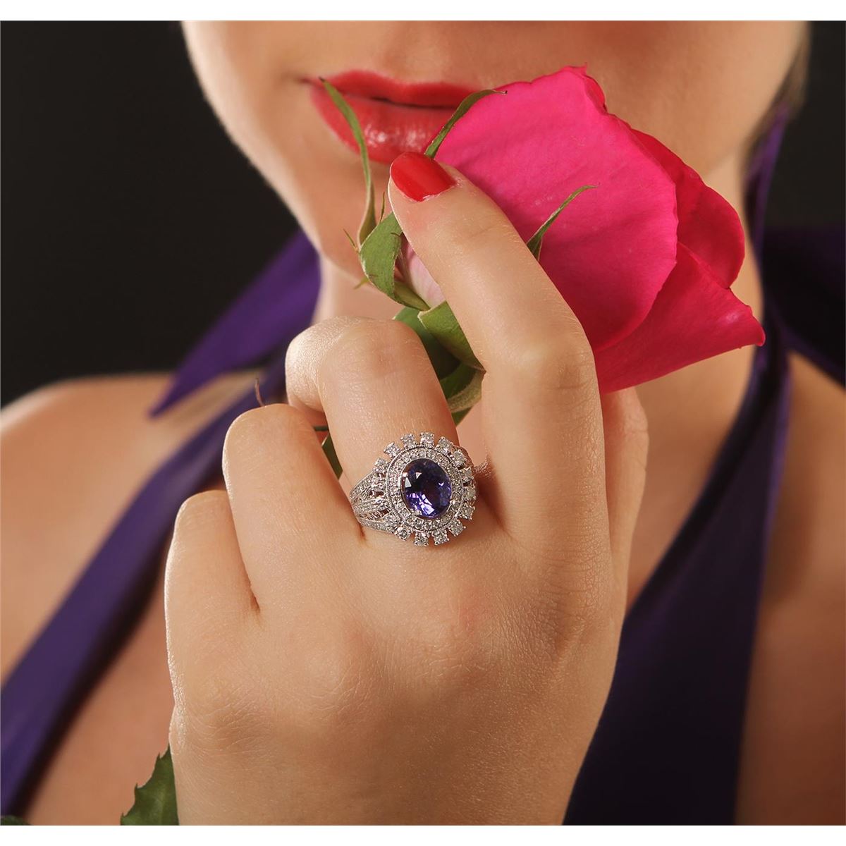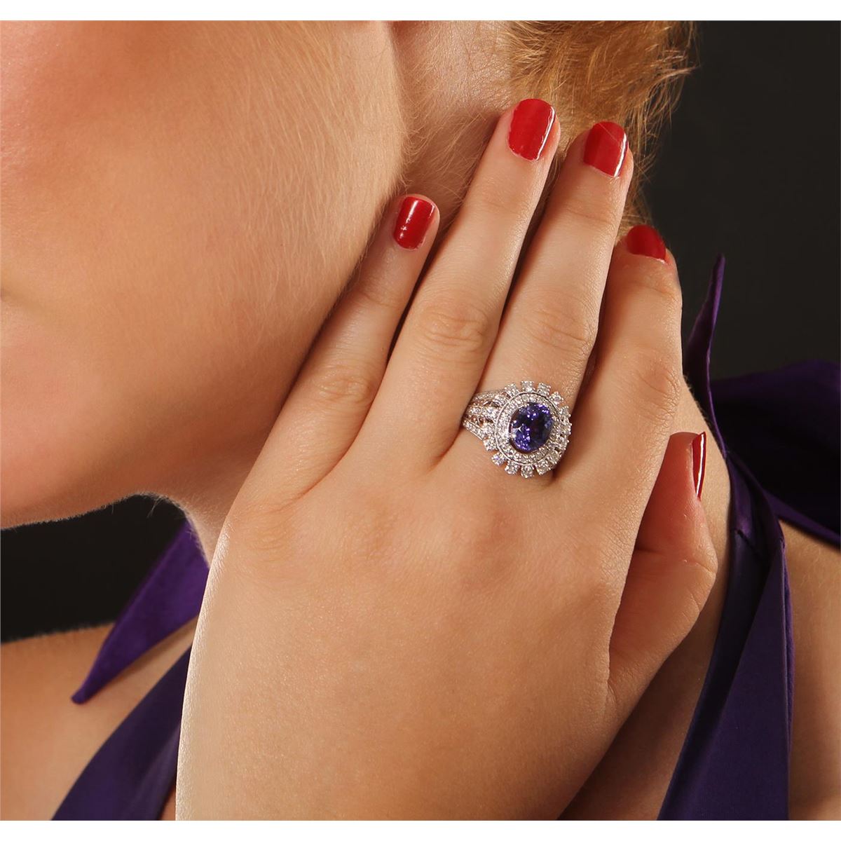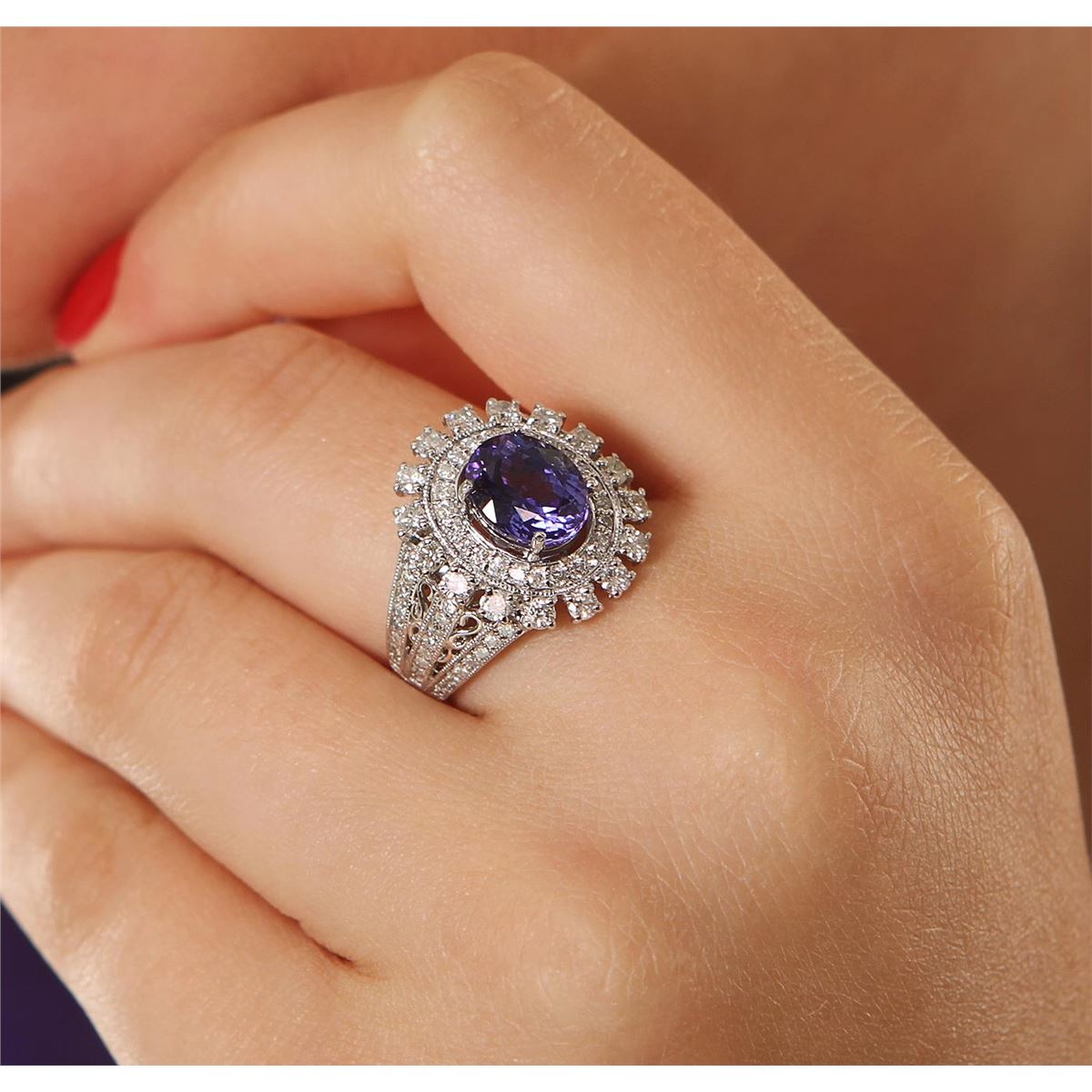 One polished, stamped, and electronically tested solid 14KT White Gold ring mounted with: 1 genuine tanzanite center stone weighing 2.71 carats and 88 genuine round diamonds weighing 1.20 carats. This item weighs 6.3 grams, condition is new, excellent workmanship. AIGL Appraised at $6,975.00.