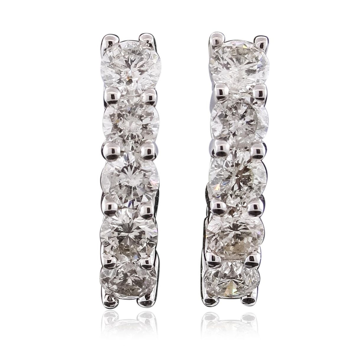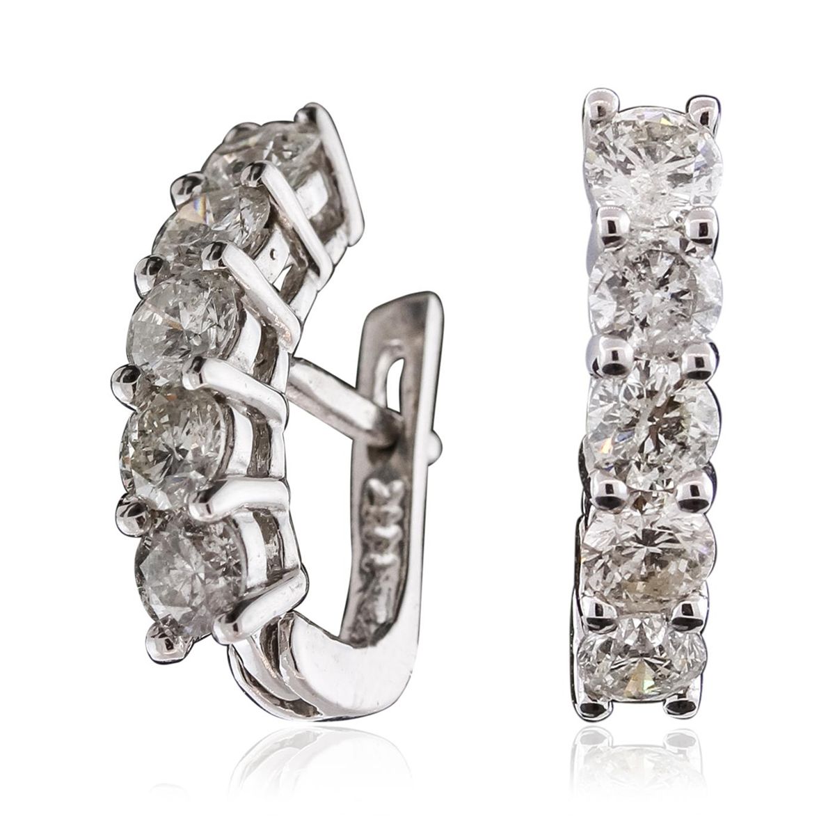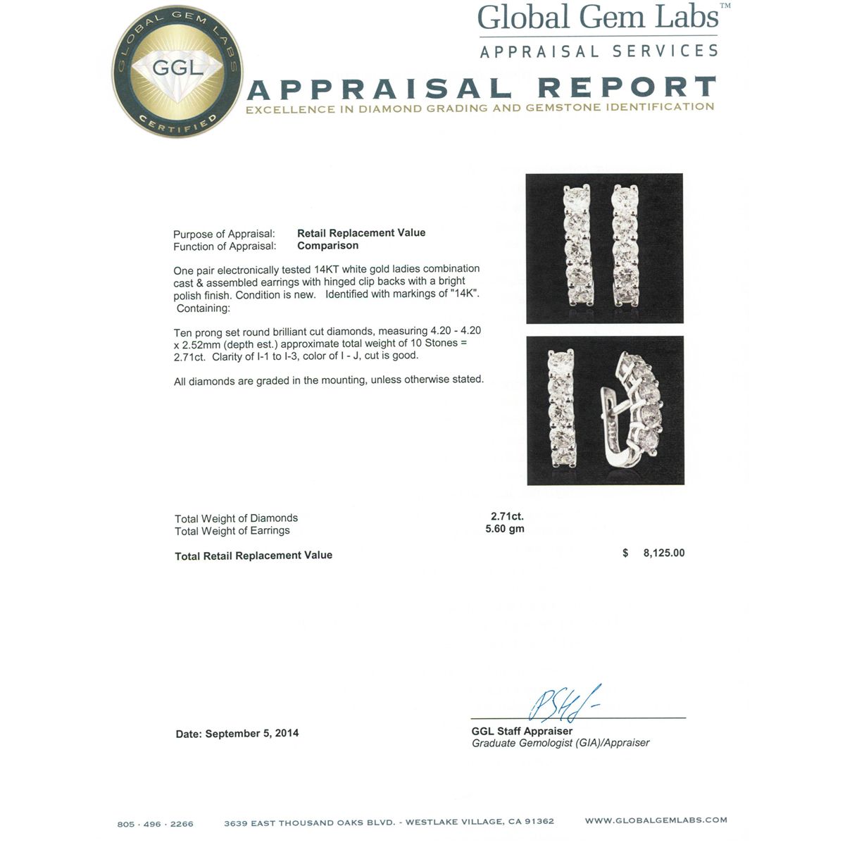 One pair electronically tested 14KT white gold ladies combination cast & assembled earrings with hinged clip backs with a bright polish finish. Identified with markings of "14K". Condition is new. Containing: Ten prong set round brilliant cut diamonds, measuring 4.20 - 4.20 x 2.52mm (depth est.) approximate total weight of 10 Stones = 2.71ct. Clarity: I-1 to I-3. Color: I - J, Cut is Good. All diamonds are graded in the mounting, unless otherwise stated. Total Weight of Diamonds 2.71ct. Total Weight of Earrings 5.60 grams. GGL Appraised at $8,125.00.