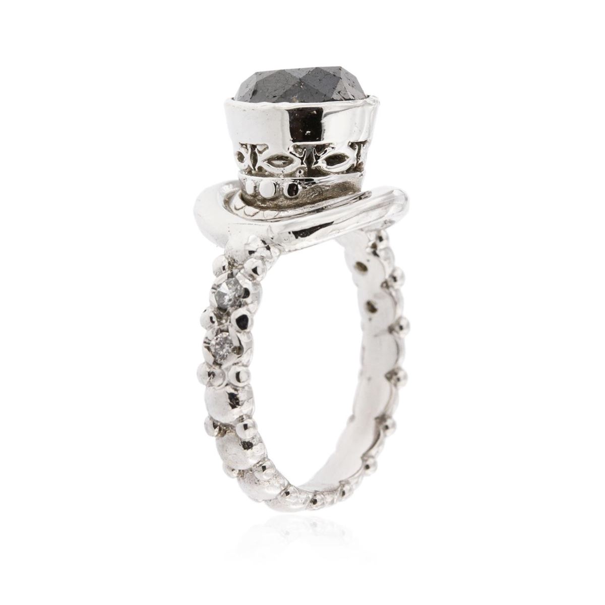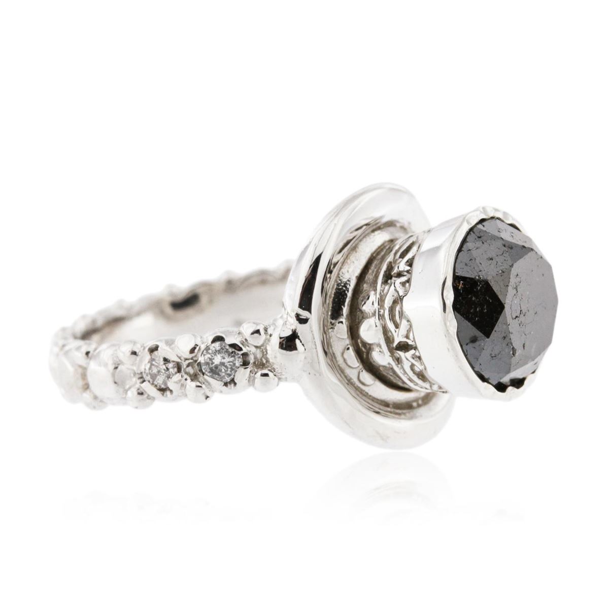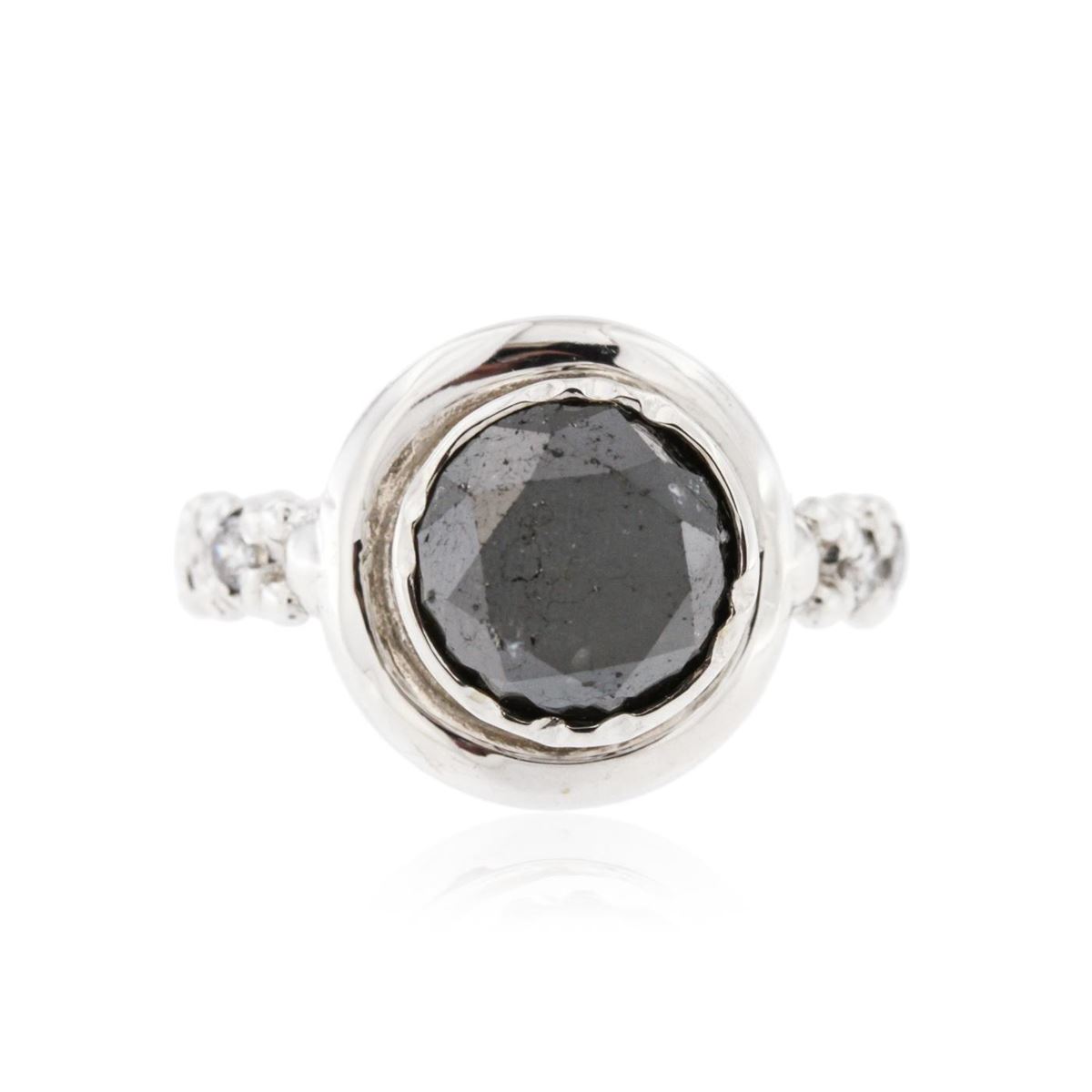 One electronically tested 14KT white gold ladies cast black and white diamond ring with a bright finish. Condition is new, good workmanship. The featured black diamond is set in a tall conical shaped setting, supported by diamond set shoulders and repeating pattern throughout the three and one half millimeter wide band. identified with markings of "14K". Containing: One prong set round brilliant cut diamond, measuring 8.80 - 8.70 x 5.25mm (depth est.), 11.00% GTCF approximate weight of 2.72ct. Indications of multiple laboratory enhancements. Graded in the setting. Clarity Declasse. Color Fancy Black; Irradiated. Depth 60.0%. Table 68.4%. Four prong set round brilliant cut diamonds, measuring 2.20 - 2.20 x 1.32mm (depth est.) approximate total weight of 4 Stones = 0.15ct. Graded in the setting. Clarity I-1 to I-2. Color H - I. Total Weight of Diamonds 2.87ct. Total Weight of Ring 8.53 gm. AIG Appraised at $4,180.00.
