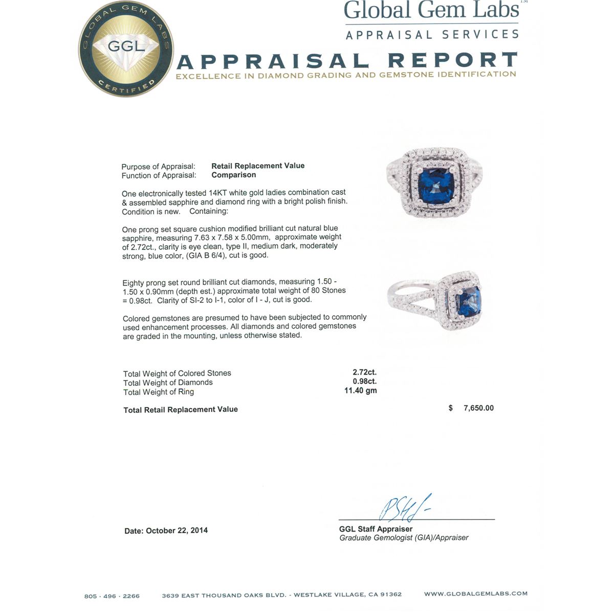 One electronically tested 14KT white gold ladies combination cast & assembled sapphire and diamond ring with a bright polish finish. Condition is new. Containing: One prong set square cushion modified brilliant cut natural blue sapphire, measuring 7.63 x 7.58 x 5.00mm, approximate weight of 2.72ct., clarity is eye clean, type II, medium dark, moderately strong, blue color, (GIA B 6/4), cut is good. Eighty prong set round brilliant cut diamonds, measuring 1.50 - 1.50 x 0.90mm (depth est.) approximate total weight of 80 Stones = 0.98ct. Clarity: SI-2 to I-1. Color: I - J, Cut is Good. Colored gemstones are presumed to have been subjected to commonly used enhancement processes. All diamonds and colored gemstones are graded in the mounting, unless otherwise stated. Total Weight of Colored Stones 2.72ct. Total Weight of Diamonds 0.98ct. Total Weight of Ring 11.40 grams. GGL Appraised at $7,650.00.