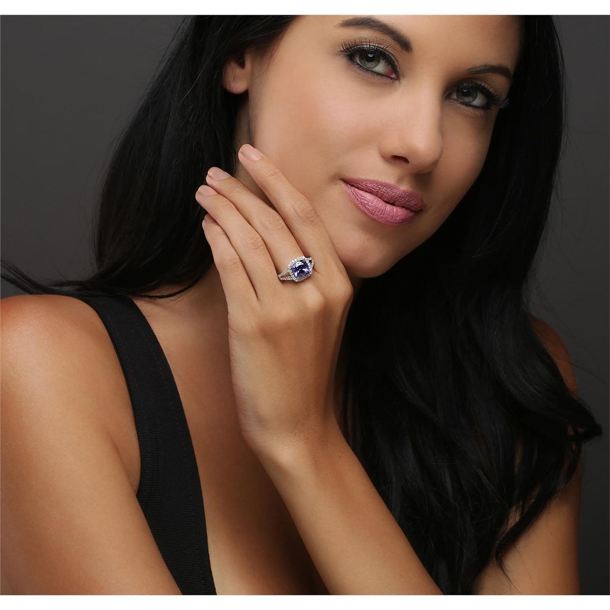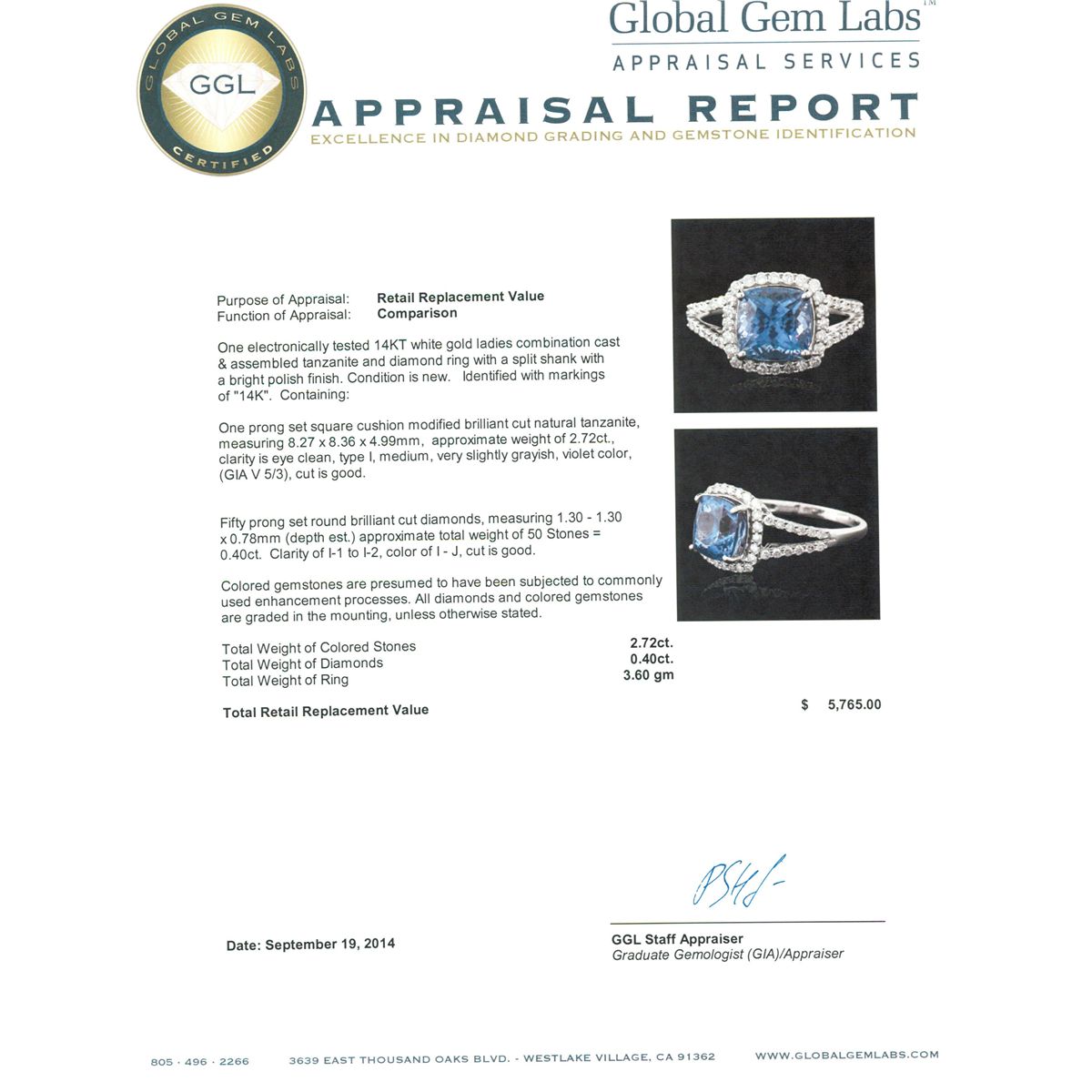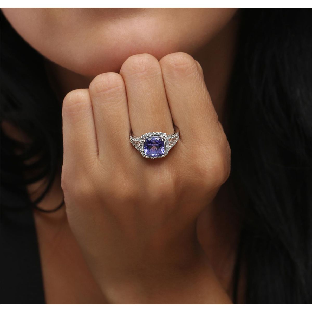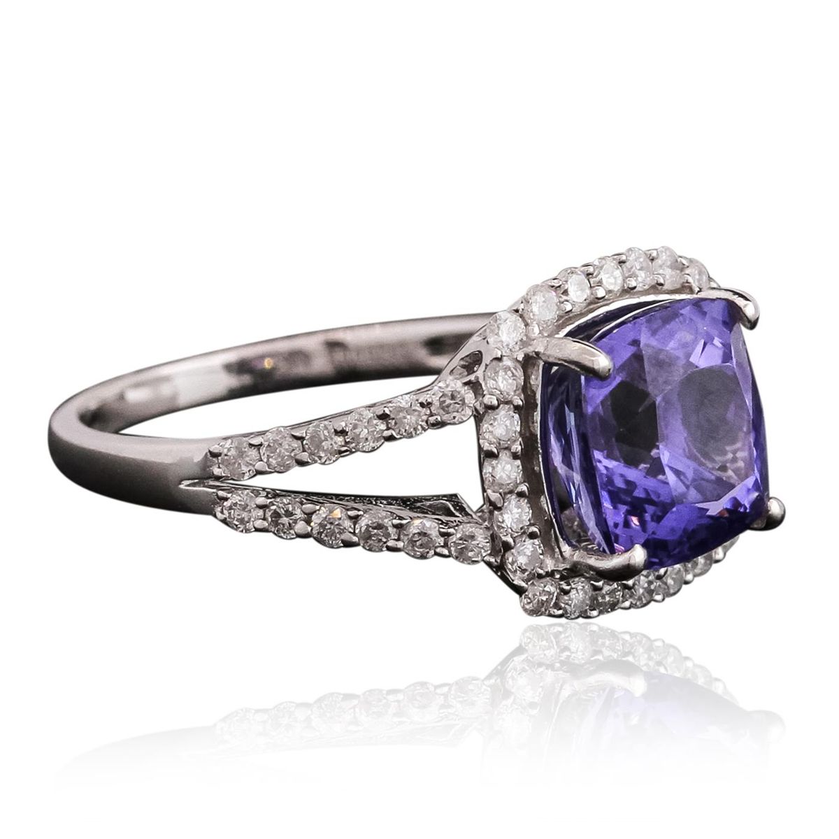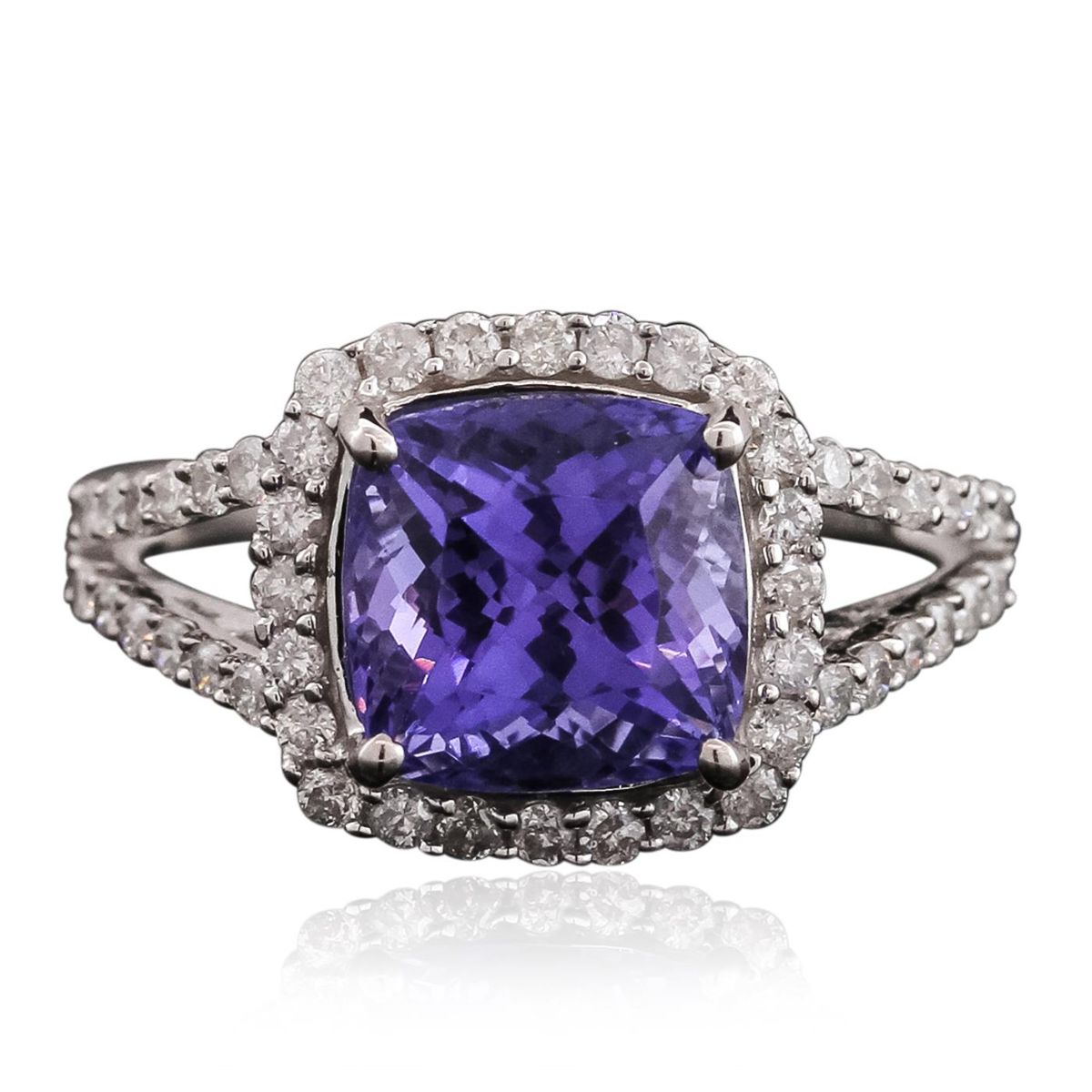 One electronically tested 14KT white gold ladies combination cast & assembled tanzanite and diamond ring with a split shank with a bright polish finish. Identified with markings of "14K". Condition is new. Containing: One prong set square cushion modified brilliant cut natural tanzanite, measuring 8.27 x 8.36 x 4.99mm, approximate weight of 2.72ct., clarity is eye clean, type I, medium, very slightly grayish, violet color, (GIA V 5/3), cut is good. Fifty prong set round brilliant cut diamonds, measuring 1.30 - 1.30 x 0.78mm (depth est.) approximate total weight of 50 Stones = 0.40ct. Clarity: I-1 to I-2. Color: I - J, Cut is Good. Colored gemstones are presumed to have been subjected to commonly used enhancement processes. All diamonds and colored gemstones are graded in the mounting, unless otherwise stated. Total Weight of Colored Stones 2.72ct. Total Weight of Diamonds 0.40ct. Total Weight of Ring 3.60 grams. GGL Appraised at $5,765.00.