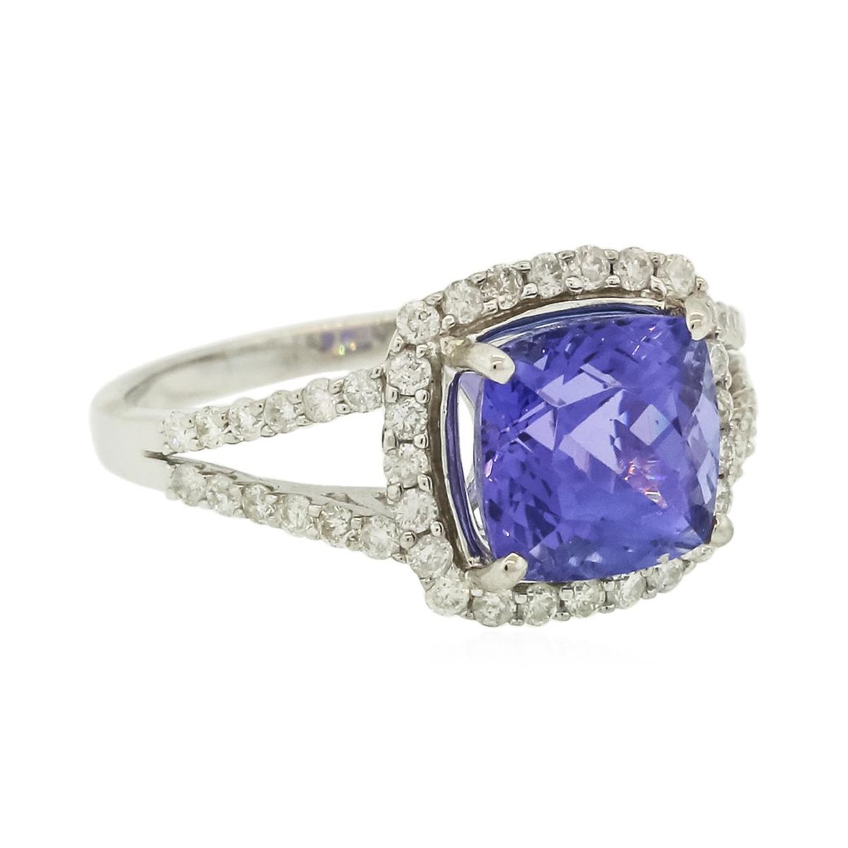 One electronically tested 14KT white gold ladies combination cast & assembled tanzanite and diamond ring with a split shank with a bright polish finish. Identified with markings of "14K". Condition is new. Containing: One prong set square cushion modified brilliant cut natural tanzanite, measuring 8.27 x 8.36 x 4.99mm, approximate weight of 2.72ct., clarity is eye clean, type I, medium, very slightly grayish, violet color, (GIA V 5/3), cut is good. Fifty prong set round brilliant cut diamonds, measuring 1.30 - 1.30 x 0.78mm (depth est.) approximate total weight of 50 Stones = 0.40ct. Clarity: I-1 to I-2. Color: I - J, Cut is Good. Colored gemstones are presumed to have been subjected to commonly used enhancement processes. All diamonds and colored gemstones are graded in the mounting, unless otherwise stated. Total Weight of Colored Stones 2.72ct. Total Weight of Diamonds 0.40ct. Total Weight of Ring 3.60 grams. GGL Appraised at $5,765.00.