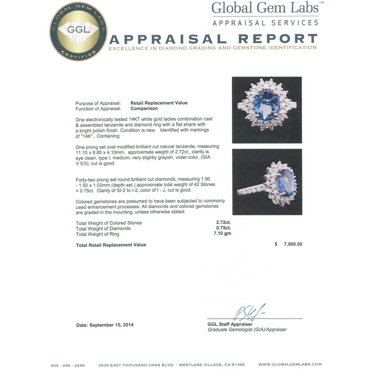 One electronically tested 14KT white gold ladies combination cast & assembled tanzanite and diamond ring with a flat shank with a bright polish finish. Identified with markings of "14K". Condition is new. Containing: One prong set oval modified brilliant cut natural tanzanite, measuring 11.10 x 8.80 x 4.10mm, approximate weight of 2.72ct., clarity is eye clean, type I, medium, very slightly grayish, violet color, (GIA V 5/3), cut is good. Forty-Two prong set round brilliant cut diamonds, measuring 1.90 - 1.50 x 1.02mm (depth est.) approximate total weight of 42 Stones = 0.75ct. Clarity: SI-2 to I-2. Color: I - J, Cut is Good. Colored gemstones are presumed to have been subjected to commonly used enhancement processes. All diamonds and colored gemstones are graded in the mounting, unless otherwise stated total weight of Colored Stones 2.72ct. Total Weight of Diamonds 0.75ct. Total Weight of Ring 7.10 grams. GGL Appraised at $7,900.00.