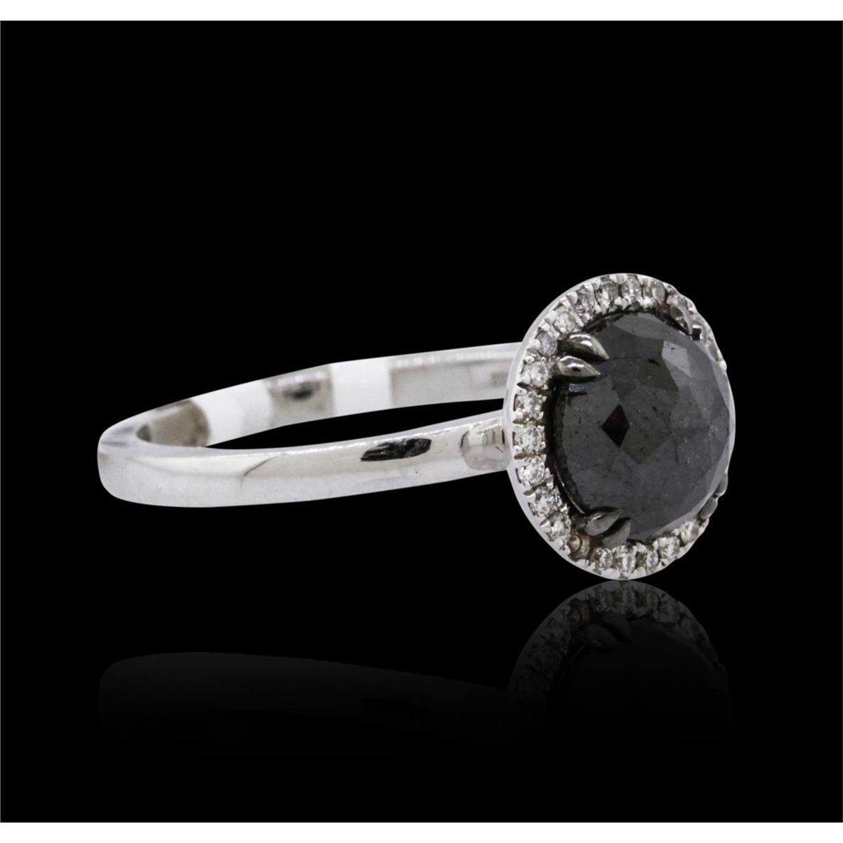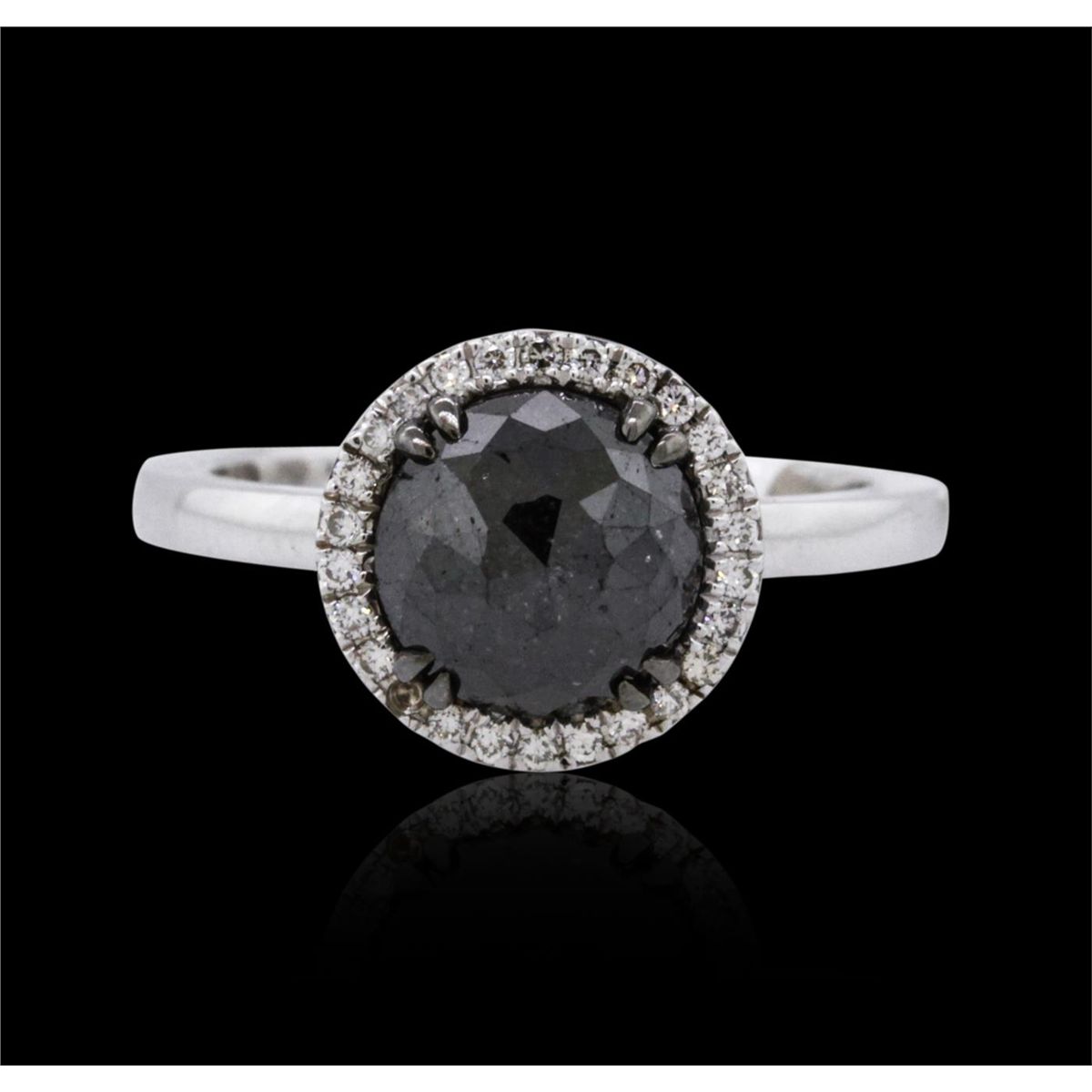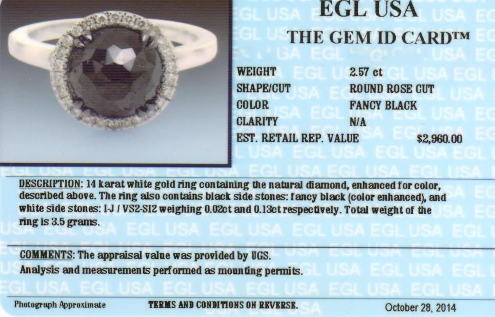 One 14KT white gold ring containing one natural round rose cut fancy black diamond, enhanced for color, with a total weight of 2.57ct. The ring also contains black side stones: fancy black (color enhanced), and white side stones: I-J / VS2-SI2 weighing 0.02ct and 0.13ct respectively. Total weight of the ring is 3.50 grams. EGL USA Appraised.