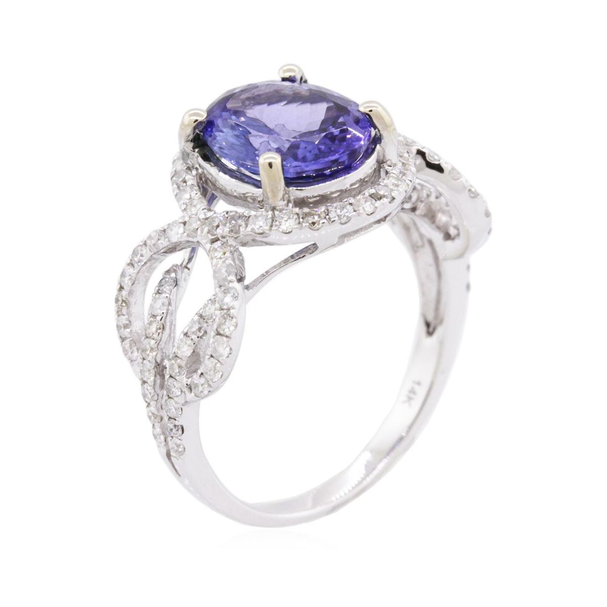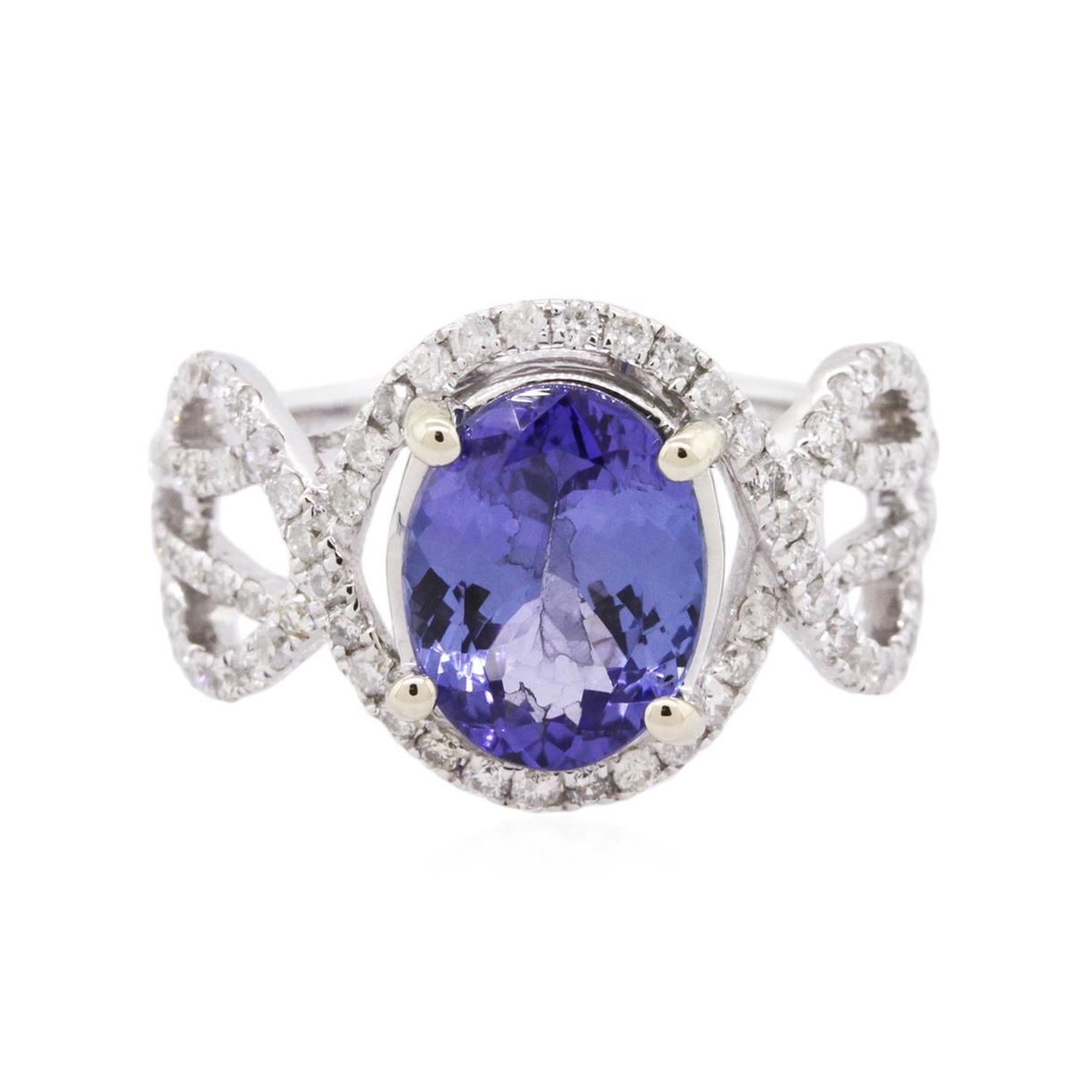 One electronically tested 14KT white gold ladies combination cast & assembled tanzanite and diamond ring with a split shank with a bright polish finish. Identified with markings of "14K". Condition is new. Containing: One prong set oval modified brilliant cut natural tanzanite, measuring 10.00 x 7.88 x 5.09mm, approximate weight of 2.73ct., clarity is eye clean, type I, medium light, very slightly grayish, violet color, (GIA V 4/3), cut is good. Seventy-Four prong set round brilliant cut diamonds, measuring 1.10 - 1.10 x 0.66mm (depth est.) approximate total weight of 74 Stones = 0.36ct. Clarity: I-1 to I-2. Color: I - J, Cut is Good. Colored gemstones are presumed to have been subjected to commonly used enhancement processes. All diamonds and colored gemstones are graded in the mounting, unless otherwise stated. Total Weight of Colored Stones 2.73ct. Total Weight of Diamonds 0.36ct. Total Weight of Ring 4.20 grams. GGL Appraised at $6,160.00.