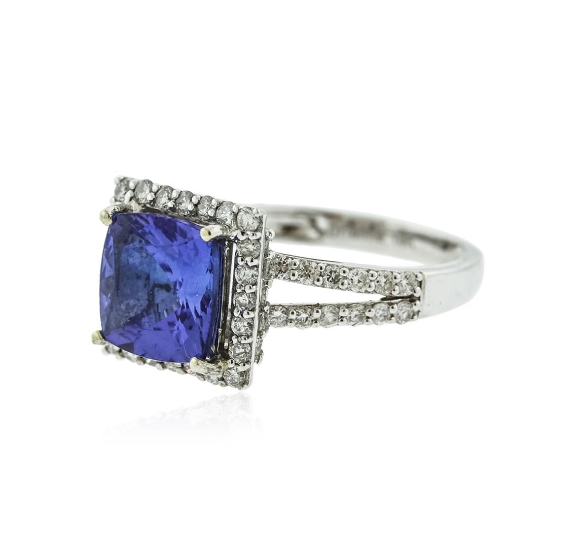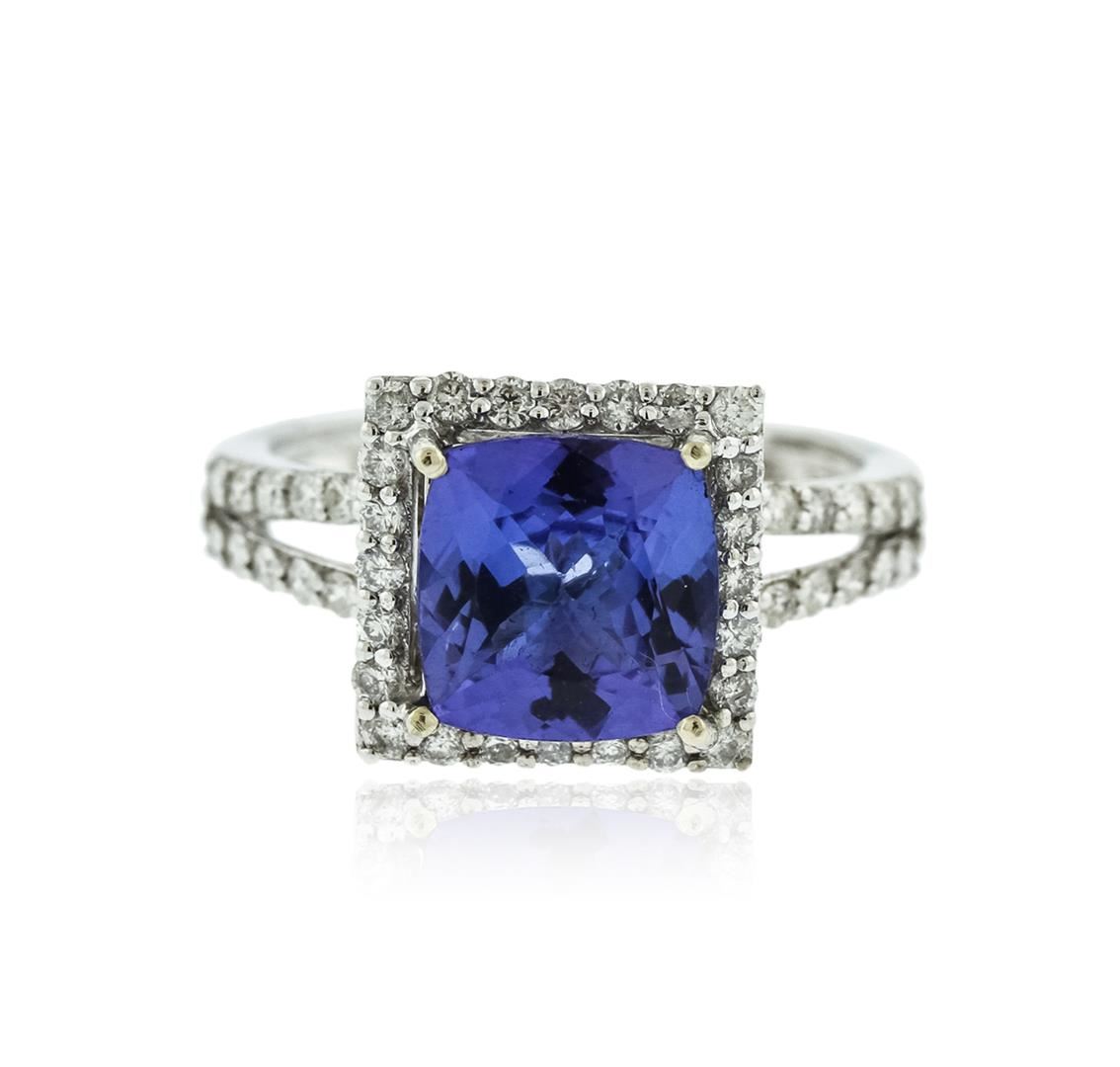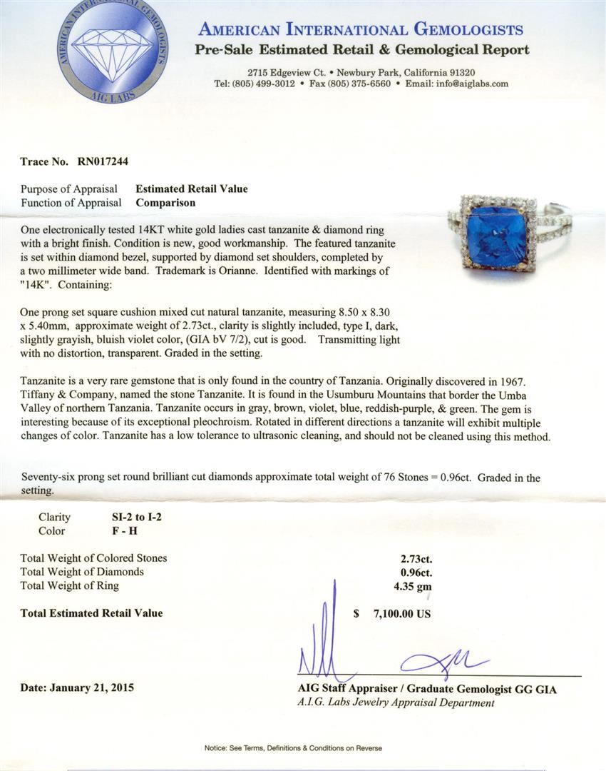 One electronically tested 14KT white gold ladies cast tanzanite & diamond ring with a bright finish. The featured tanzanite is set within diamond bezel, supported by diamond set shoulders, completed by a two millimeter wide band. Trademark is Orianne. Identified with markings of "14K". Condition is new, good workmanship. Containing: One prong set square cushion mixed cut natural tanzanite, measuring 8.50 x 8.30 x 5.40mm, approximate weight of 2.73ct., clarity is slightly included, type I, dark, slightly grayish, bluish violet color, (GIA bV 7/2), cut is good. Transmitting light with no distortion, transparent. Graded in the setting. Tanzanite is a very rare gemstone that is only found in the country of Tanzania. Originally discovered in 1967. Tiffany & Company, named the stone Tanzanite. It is found in the Usumburu Mountains that border the Umba Valley of northern Tanzania. Tanzanite occurs in gray, brown, violet, blue, reddish-purple, & green. The gem is interesting because of its exceptional pleochroism. Rotated in different directions a tanzanite will exhibit multiple changes of color. Tanzanite has a low tolerance to ultrasonic cleaning, and should not be cleaned using this method. Seventy-Six prong set round brilliant cut diamonds approximate total weight of 76 Stones = 0.96ct. Graded in the setting. Clarity: SI-2 to I-2. Color: F - H. Total Weight of Colored Stones 2.73ct. Total Weight of Diamonds 0.96ct. Total Weight of Ring 4.35gm. AIG Appraised at $7,100.00.