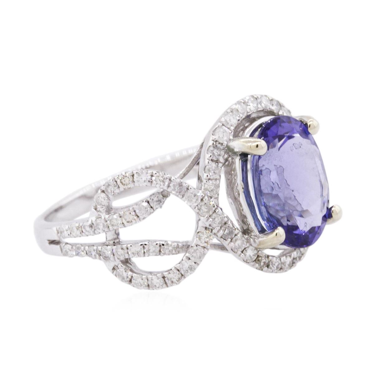 One electronically tested 14KT white gold ladies combination cast & assembled tanzanite and diamond ring with a split shank with a bright polish finish. Identified with markings of "14K". Condition is new. Containing: One prong set oval modified brilliant cut natural tanzanite, measuring 10.00 x 7.88 x 5.09mm, approximate weight of 2.73ct., clarity is eye clean, type I, medium light, very slightly grayish, violet color, (GIA V 4/3), cut is good. Seventy-Four prong set round brilliant cut diamonds, measuring 1.10 - 1.10 x 0.66mm (depth est.) approximate total weight of 74 Stones = 0.36ct. Clarity: I-1 to I-2. Color: I - J, Cut is Good. Colored gemstones are presumed to have been subjected to commonly used enhancement processes. All diamonds and colored gemstones are graded in the mounting, unless otherwise stated. Total Weight of Colored Stones 2.73ct. Total Weight of Diamonds 0.36ct. Total Weight of Ring 4.20 grams. GGL Appraised at $6,160.00.