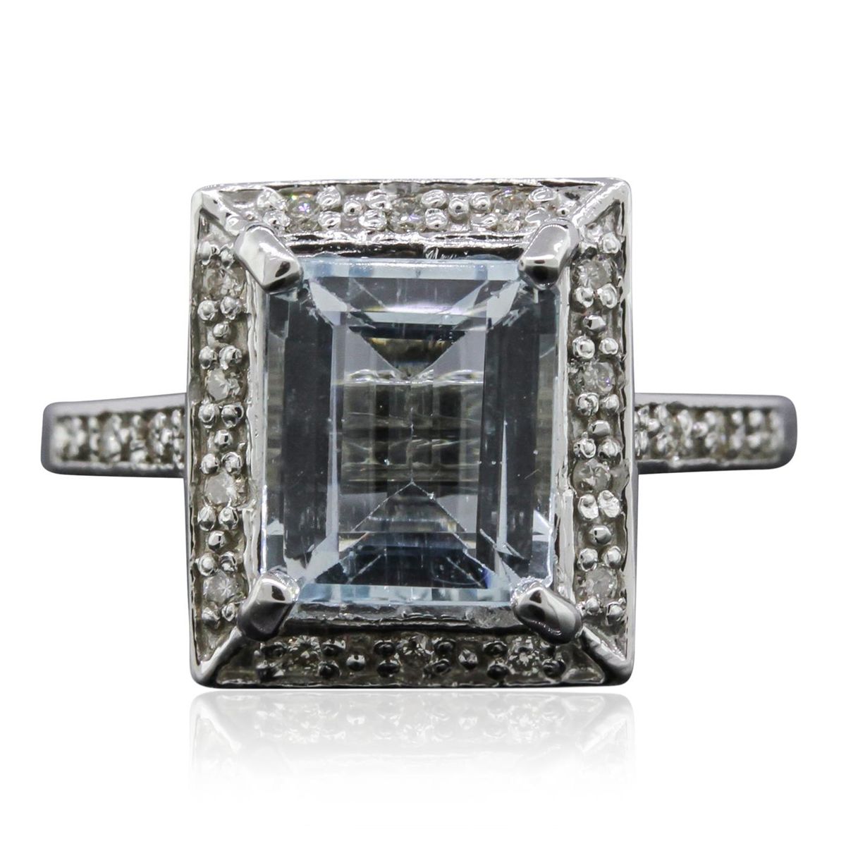One electronically tested 14KT white gold ladies cast aquamarine and diamond ring with a bright polish finish. Condition is new, very good workmanship. The featured aquamarine is set within a diamond bezel, supported by diamond set shoulders and completed by a two millimeter wide band. Identified with markings of "14K". Containing: One prong set rectangular step cut natural aquamarine, measuring 8.70 x 7.40 x 4.81mm, 8%. bulge factor, approximate weight of 2.73ct., clarity is eye clean, type I, medium light, very slightly grayish, blue color, (GIA B 4/3), cut is good. Transmitting light with no distortion, transparent. Refractive index testing results of 1.56 to 1.57. This is a conclusive result for Aquamarine (Beryl). Graded in the setting. Twenty-Four bead set round brilliant cut diamonds, measuring 1.60 - 1.40 x 0.90mm (depth est.) approximate. Total Weight of 24 Stones = 0.35ct. Graded in the setting. Clarity: SI-2 to I-1. Color: H - J. Total Weight of Colored Stones 2.73ct. Total Weight of Diamonds 0.35ct. Total Weight of Ring 4.60 grams. AIG Appraised at $3,050.00.