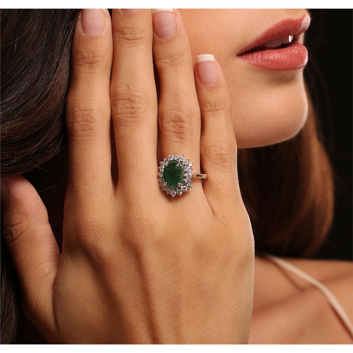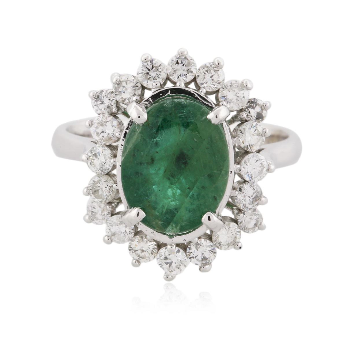 One electronically tested 14KT white gold ladies cast emerald and diamond ring with a bright polish finish. Condition is new, good workmanship. The featured emerald is set within a floral diamond bezel, completed by a two and one-half millimeter wide band. Identified with markings of "K14". Containing: One prong set oval mixed cut natural emerald, measuring 10.50 x 8.40 x 5.20mm, 8% bulge factor, approximate weight of 2.73ct, clarity is heavily included, type III, medium, very slightly grayish, very slightly bluish green color, (GIA vslbG 5/3), cut is good. Transmitting light with a minimum of distortion, transparent to translucent. Naturally occurring internal & external characteristics are present. Indications of oil residue. Graded in the setting. Twenty prong set round brilliant cut diamonds, measuring 2.20 - 1.90 x 1.23mm (depth est.) approximate total weight of 20 Stones = 0.73ct. Graded in the setting. Clarity SI-2 to I-1 Color F - H Total Weight of Colored Stones 2.73ct. Total Weight of Diamonds 0.73ct. Total Weight of Ring 4.80 grams. AIG Appraised at $5,100.00.