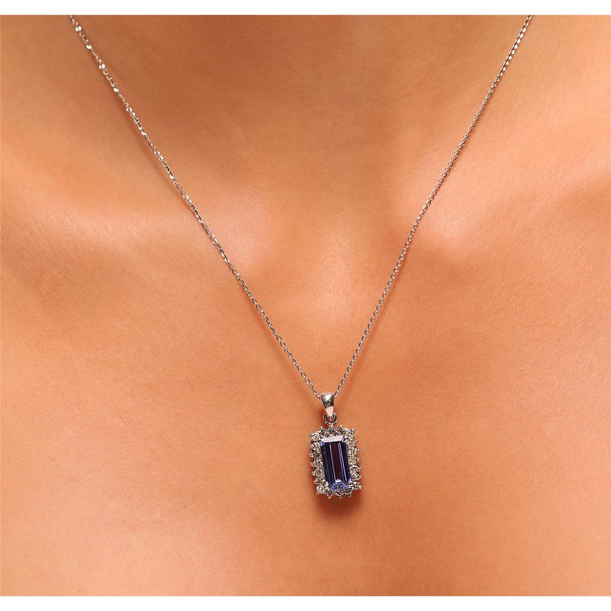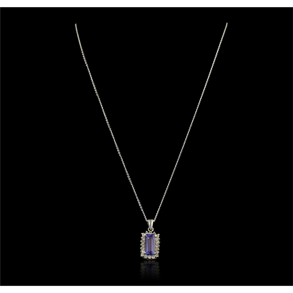 One electronically tested 14KT white gold Ladies combination cast & die struck pendant & chain 16.0" long, light open cable link with a spring ring clasp with a bright polish finish. Condition is new. Identified with markings of "14K". Containing: One prong set rectangular standard step cut natural tanzanite, measuring 11.89 x 5.71 x 4.00mm, approximate weight of 2.73ct., clarity is eye clean, type I, medium light, very slightly grayish, violet color, (GIA V 4/3), cut is very good. Colored gemstones are presumed to have been subjected to commonly used color/clarity enhancement processes. Twenty prong set round brilliant cut diamonds, measuring 1.50 - 1.50 x 0.90mm (depth est.) approximate. Total Weight of 20 Stones = 0.25ct. Clarity: I-1 to I-2. Color: L - M, Cut is Good. Total Weight of Colored Stones 2.73ct. Total Weight of Diamonds 0.25ct. Total Weight of Pendant & Chain 5.40 grams. GGL Appraised at $6,140.00.
