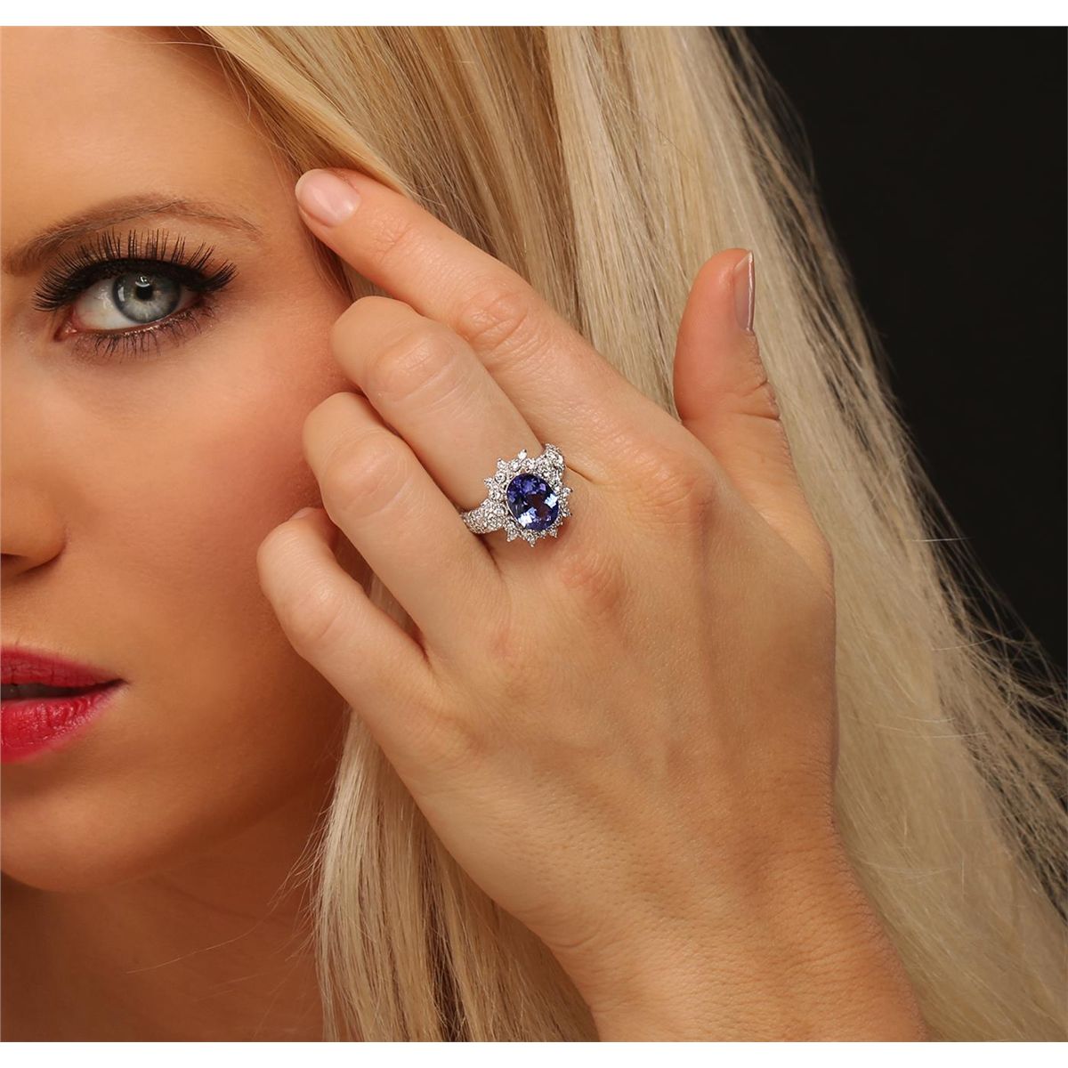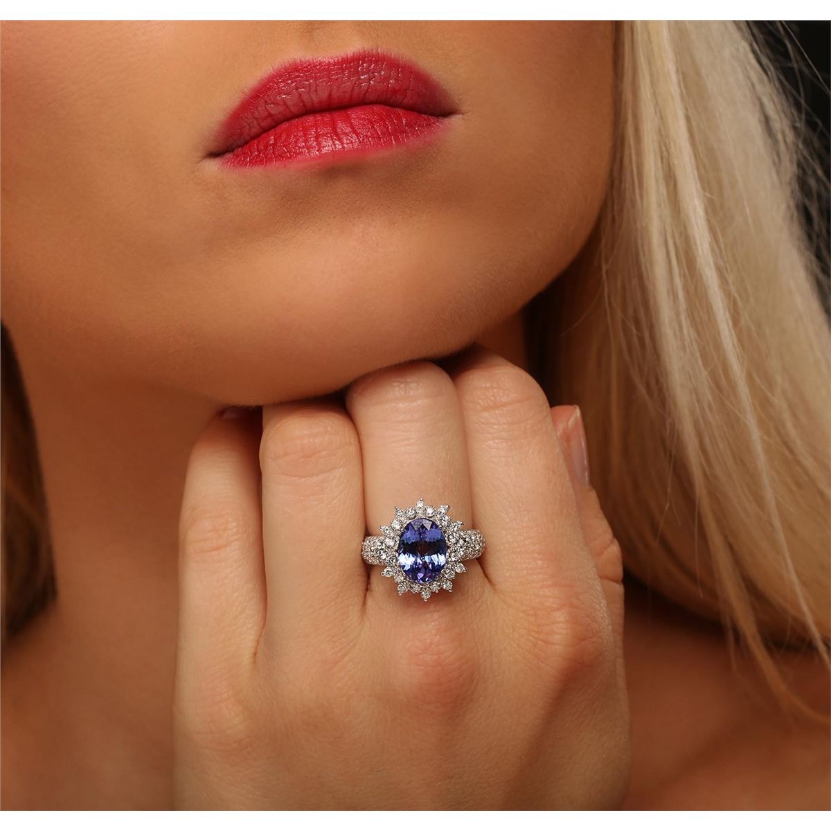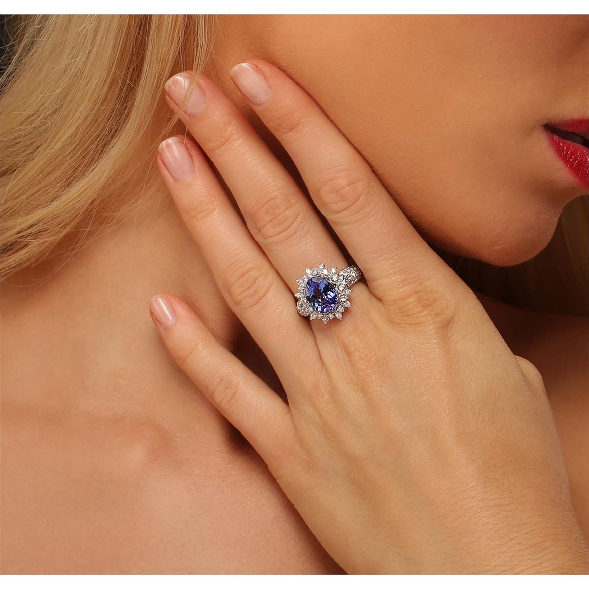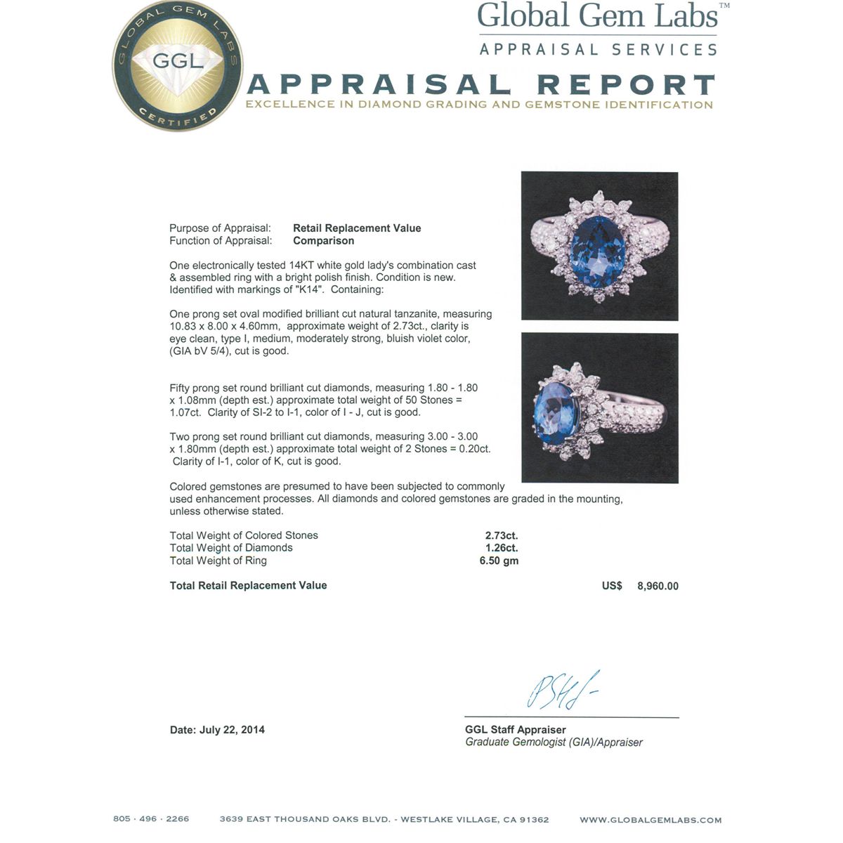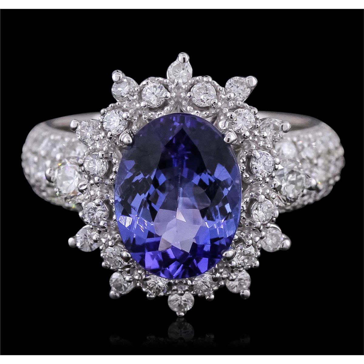 One electronically tested 14KT white gold ladies combination cast & assembled ring with a bright polish finish. Condition is new. Identified with markings of "K14". Containing: One prong set oval modified brilliant cut natural tanzanite, measuring 10.83 x 8.00 x 4.60mm, approximate weight of 2.73ct., clarity is eye clean, type I, medium, moderately strong, bluish violet color, (GIA bV 5/4), cut is good. Fifty prong set round brilliant cut diamonds, measuring 1.80 - 1.80 x 1.08mm (depth est.) approximate total weight of 50 Stones = 1.07ct. Clarity: SI-2 to I-1. Color: I - J, Cut is Good. Two prong set round brilliant cut diamonds, measuring 3.00 - 3.00 x 1.80mm (depth est.) approximate total weight of 2 Stones = 0.20ct. Clarity: I-1. Color: K, Cut is Good. Colored gemstones are presumed to have been subjected to commonly used enhancement processes. All diamonds and colored gemstones are graded in the mounting, unless otherwise stated. Total Weight of Colored Stones 2.73ct. Total Weight of Diamonds 1.26ct. Total Weight of Ring 6.50 grams. GGL Appraised at $8,960.00.