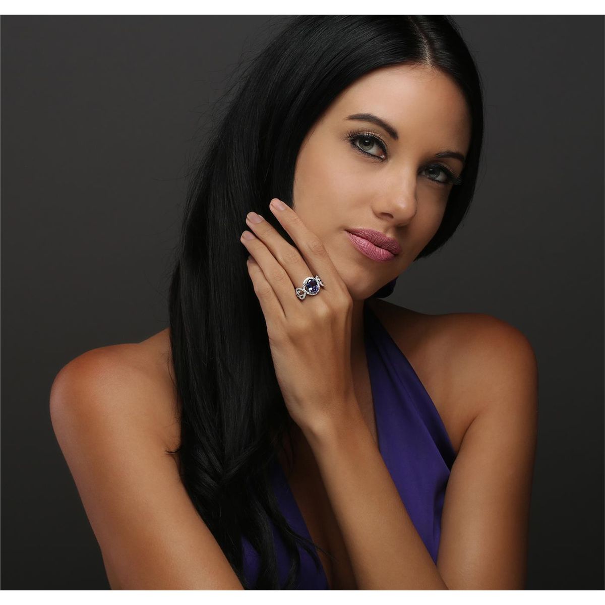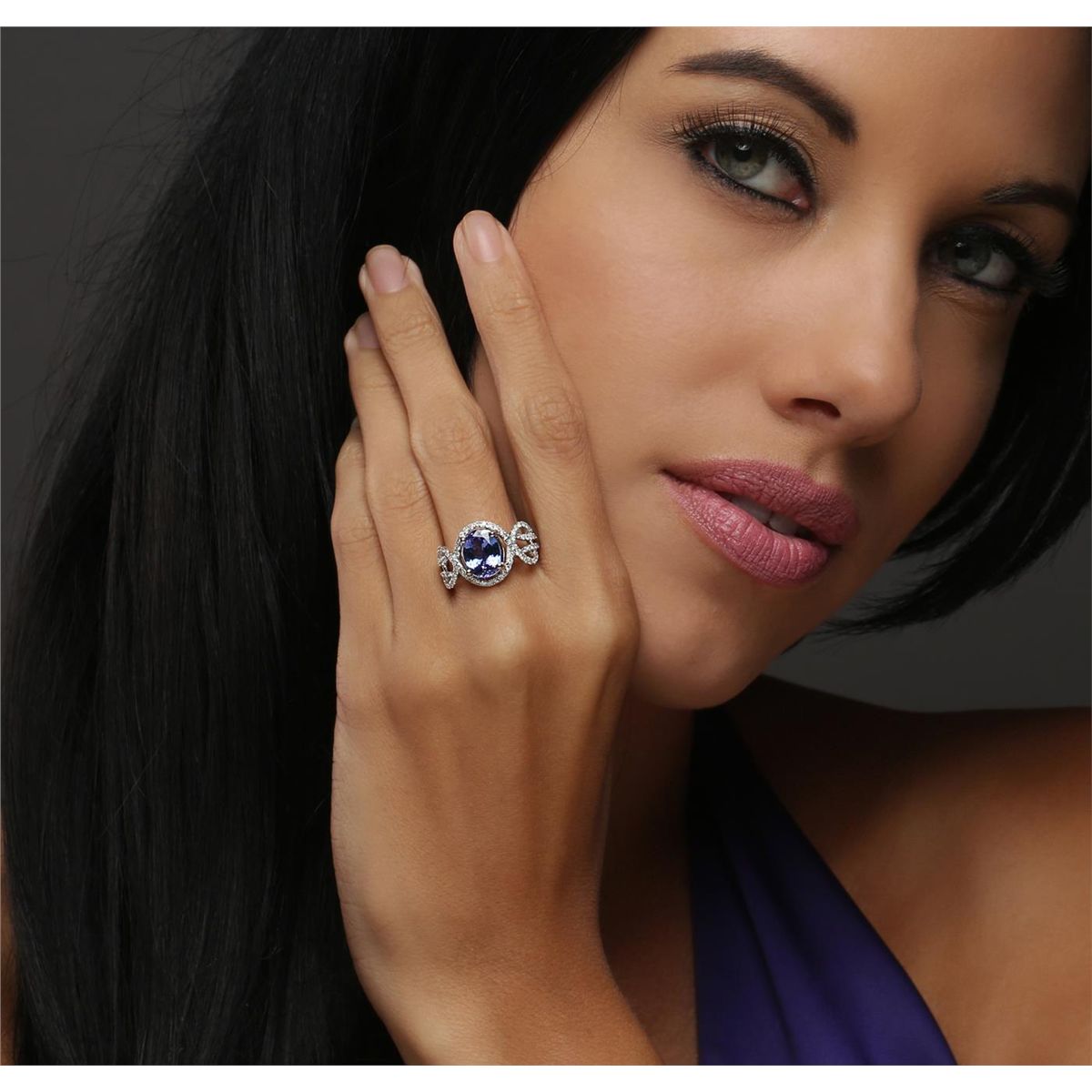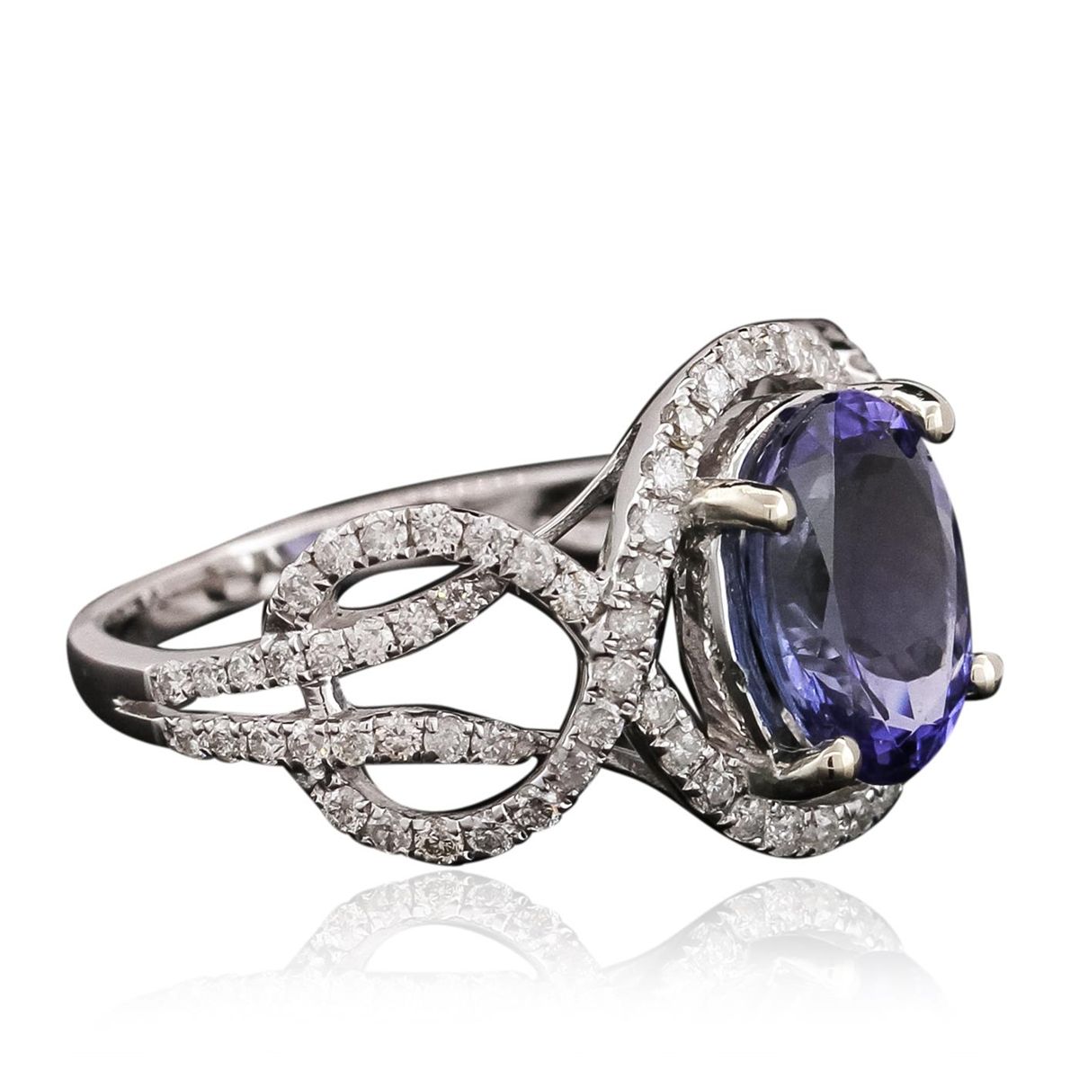 One electronically tested 14KT white gold ladies combination cast & assembled tanzanite and diamond ring with a split shank with a bright polish finish. Identified with markings of "14K". Condition is new. Containing: One prong set oval modified brilliant cut natural tanzanite, measuring 10.00 x 7.88 x 5.09mm, approximate weight of 2.73ct., clarity is eye clean, type I, medium light, very slightly grayish, violet color, (GIA V 4/3), cut is good. Seventy-Four prong set round brilliant cut diamonds, measuring 1.10 - 1.10 x 0.66mm (depth est.) approximate total weight of 74 Stones = 0.36ct. Clarity: I-1 to I-2. Color: I - J, Cut is Good. Colored gemstones are presumed to have been subjected to commonly used enhancement processes. All diamonds and colored gemstones are graded in the mounting, unless otherwise stated. Total Weight of Colored Stones 2.73ct. Total Weight of Diamonds 0.36ct. Total Weight of Ring 4.20 grams. GGL Appraised at $6,160.00.