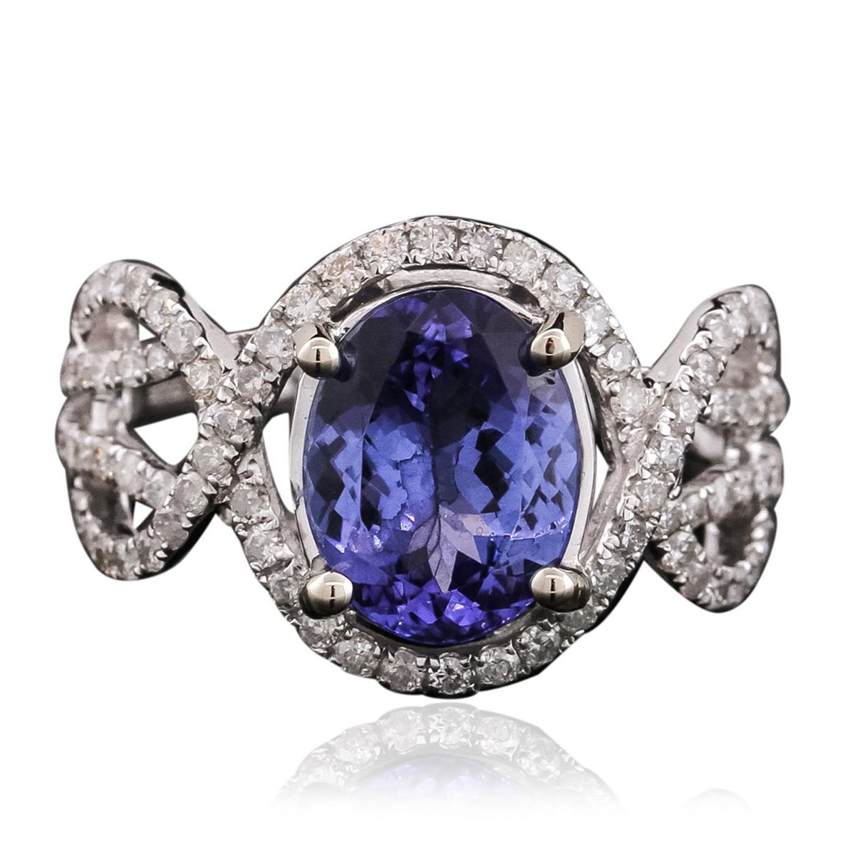 One electronically tested 14KT white gold ladies combination cast & assembled tanzanite and diamond ring with a split shank with a bright polish finish. Identified with markings of "14K". Condition is new. Containing: One prong set oval modified brilliant cut natural tanzanite, measuring 10.00 x 7.88 x 5.09mm, approximate weight of 2.73ct., clarity is eye clean, type I, medium light, very slightly grayish, violet color, (GIA V 4/3), cut is good. Seventy-Four prong set round brilliant cut diamonds, measuring 1.10 - 1.10 x 0.66mm (depth est.) approximate total weight of 74 Stones = 0.36ct. Clarity: I-1 to I-2. Color: I - J, Cut is Good. Colored gemstones are presumed to have been subjected to commonly used enhancement processes. All diamonds and colored gemstones are graded in the mounting, unless otherwise stated. Total Weight of Colored Stones 2.73ct. Total Weight of Diamonds 0.36ct. Total Weight of Ring 4.20 grams. GGL Appraised at $6,160.00.