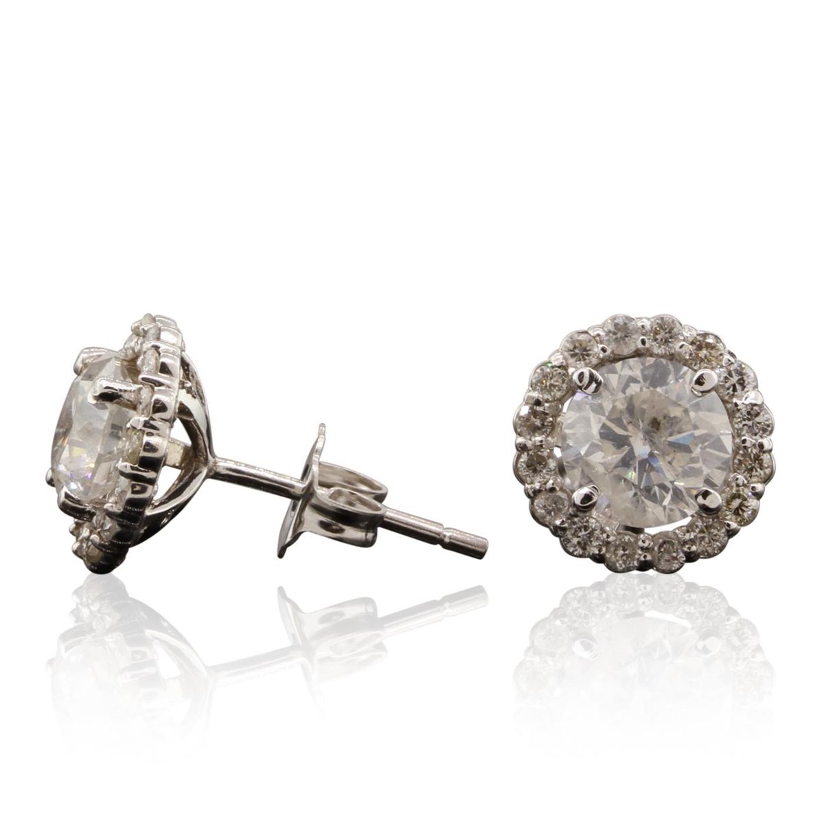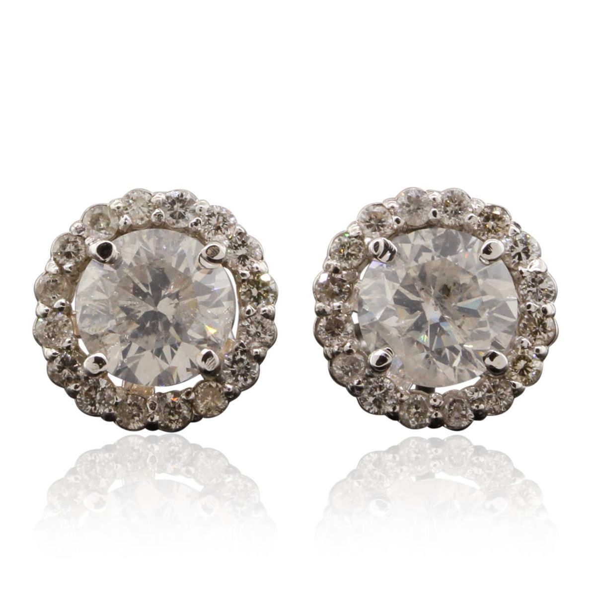 One pair electronically tested 14KT White Gold ladies cast & assembled diamond earrings with standard backs. Condition is good. Bright polish finish. Identified with markings of "585". Containing: Two prong set round brilliant cut diamonds, measuring 6.60 - 6.50 x 3.93mm (depth est.) approximate. Total Weight of 2 Stones = 2.24ct. The color grade reflects the average for the pair. Graded in the setting. Clarity: I-1 to I-2. Color: I. Thirty-Two prong set round brilliant cut diamonds, measuring 1.50 - 1.40 x 0.87mm (depth est.) approximate. Total Weight of 32 Stones = 0.49ct. Graded in the setting. Clarity: SI-2 to I-1. Color: H - I. Total Weight of Diamonds 2.73ct. AIG Appraised at $29,575.00.