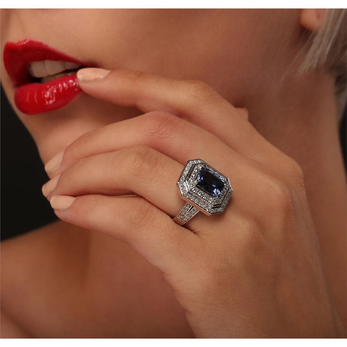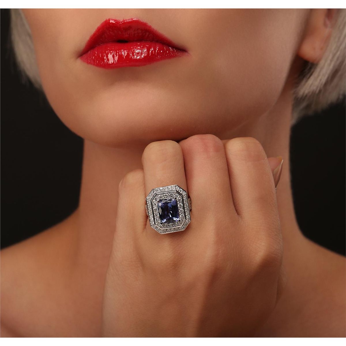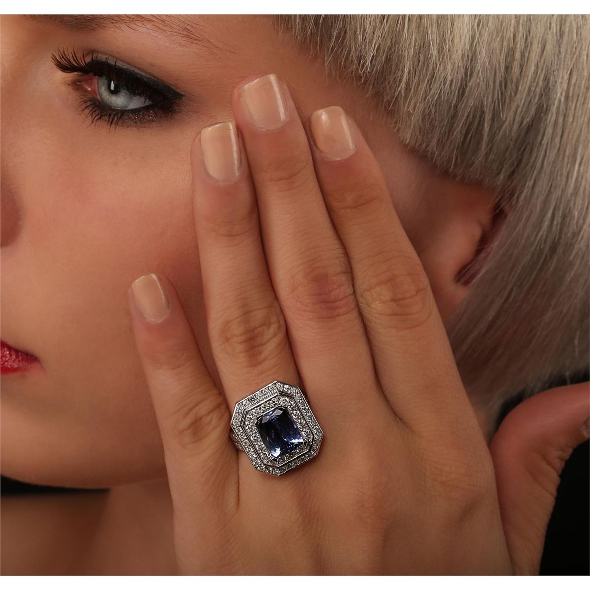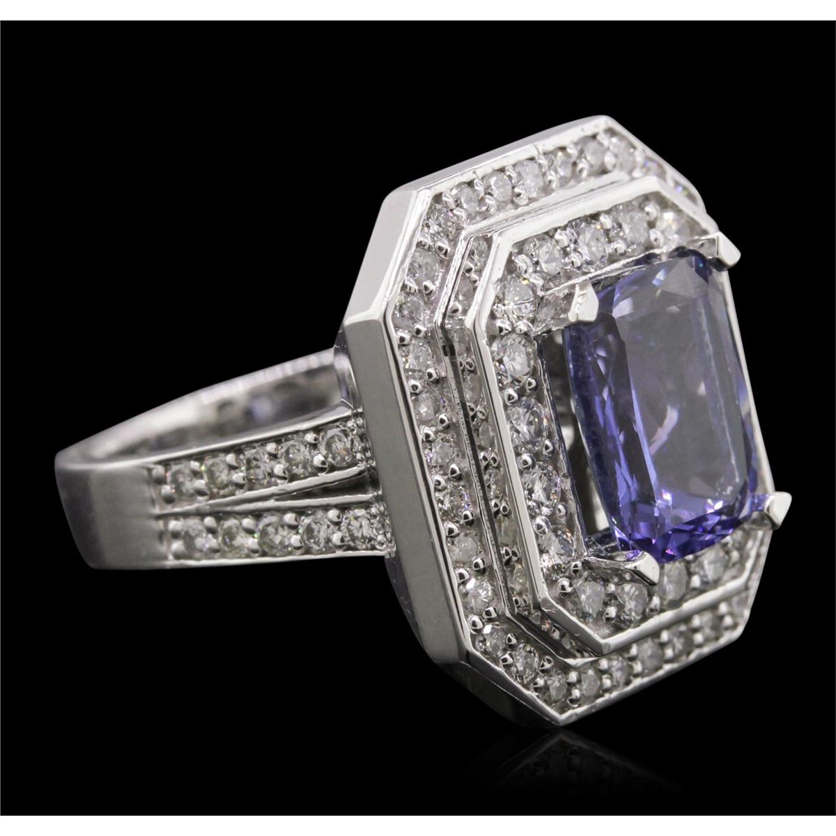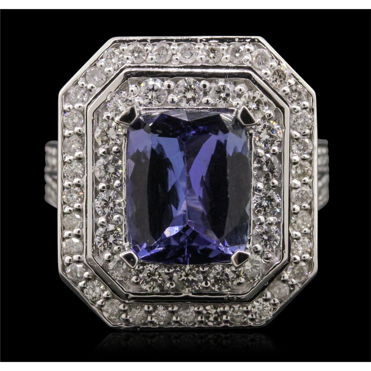 One electronically tested 14KT white gold Ladies combination cast & assembled ring with a bright polish finish. Condition is new. Identified with markings of "14K". Containing: One prong set rectangular cushion modified brilliant cut natural tanzanite, measuring 10.00 x 8.10 x 4.30mm, approximate weight of 2.74ct., clarity is eye clean, type I, medium light, very slightly grayish, violet color, (GIA V 4/3), cut is good. Colored gemstones are presumed to have been subjected to commonly used color/clarity enhancement processes. Seventy-Two prong set round brilliant cut diamonds, measuring 1.80 - 1.50 x 0.99mm (depth est.) approximate. Total Weight of 72 Stones = 1.18ct. Clarity: I-1 to I-2. Color: I - J, Cut is Good. Total Weight of Colored Stones 2.74ct. Total Weight of Diamonds 1.18ct. Total Weight of Ring 12.50 grams. GGL Appraised at $10,705.00.