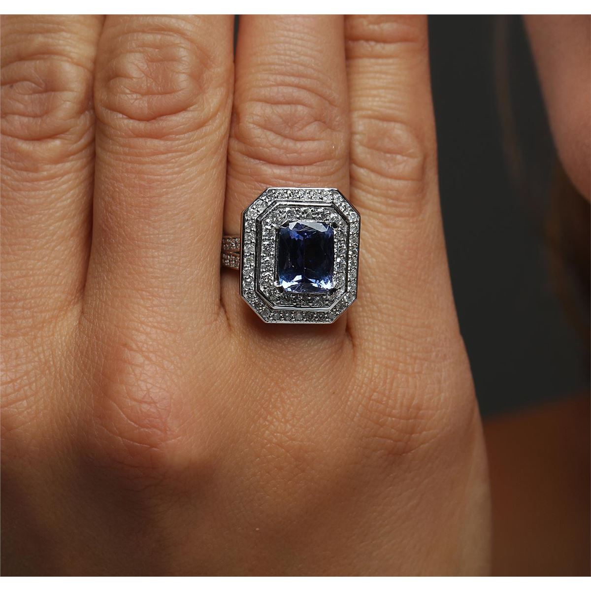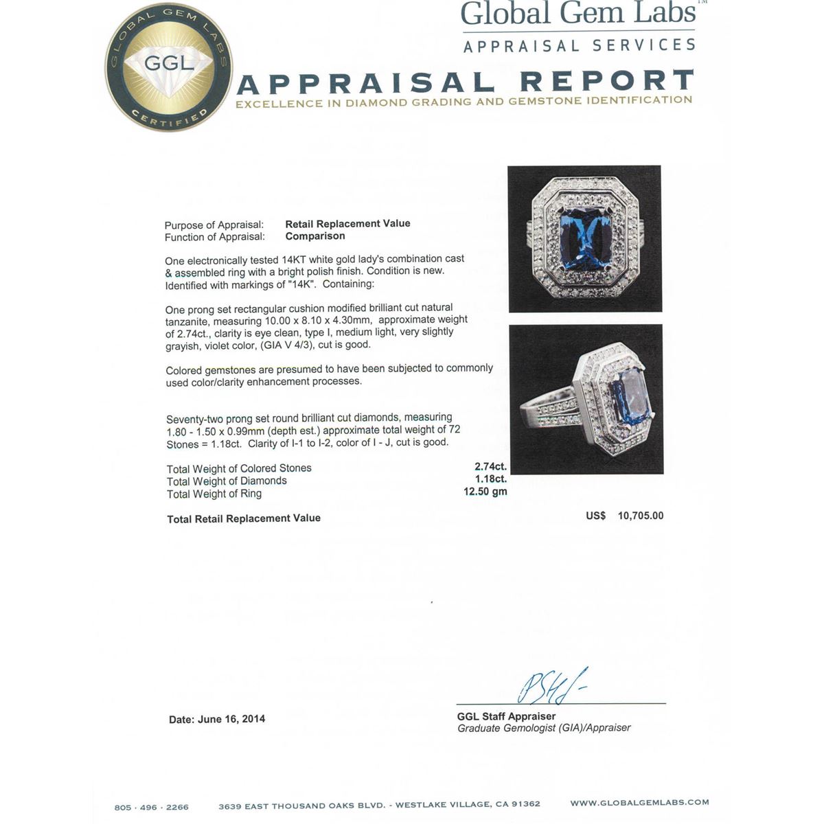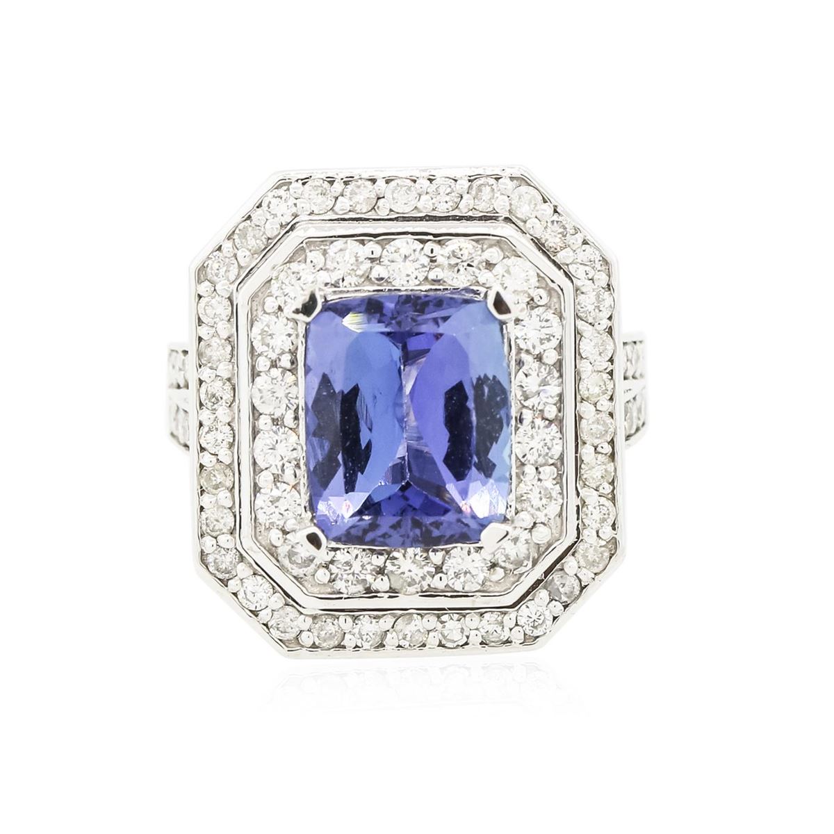 One electronically tested 14KT white gold Ladies combination cast & assembled ring with a bright polish finish. Condition is new. Identified with markings of "14K". Containing: One prong set rectangular cushion modified brilliant cut natural tanzanite, measuring 10.00 x 8.10 x 4.30mm, approximate weight of 2.74ct., clarity is eye clean, type I, medium light, very slightly grayish, violet color, (GIA V 4/3), cut is good. Colored gemstones are presumed to have been subjected to commonly used color/clarity enhancement processes. Seventy-Two prong set round brilliant cut diamonds, measuring 1.80 - 1.50 x 0.99mm (depth est.) approximate. Total Weight of 72 Stones = 1.18ct. Clarity: I-1 to I-2. Color: I - J, Cut is Good. Total Weight of Colored Stones 2.74ct. Total Weight of Diamonds 1.18ct. Total Weight of Ring 12.50 grams. GGL Appraised at $10,705.00.