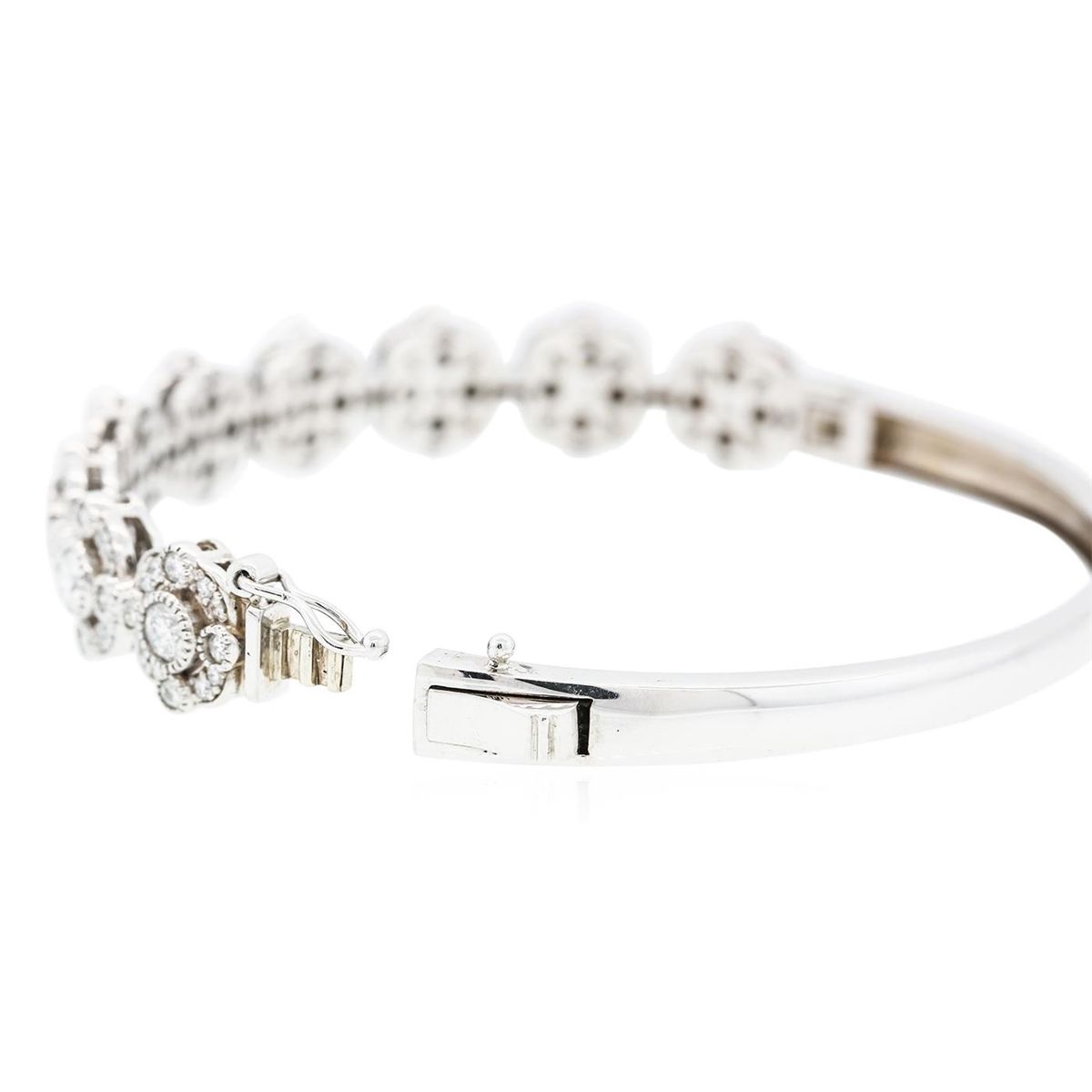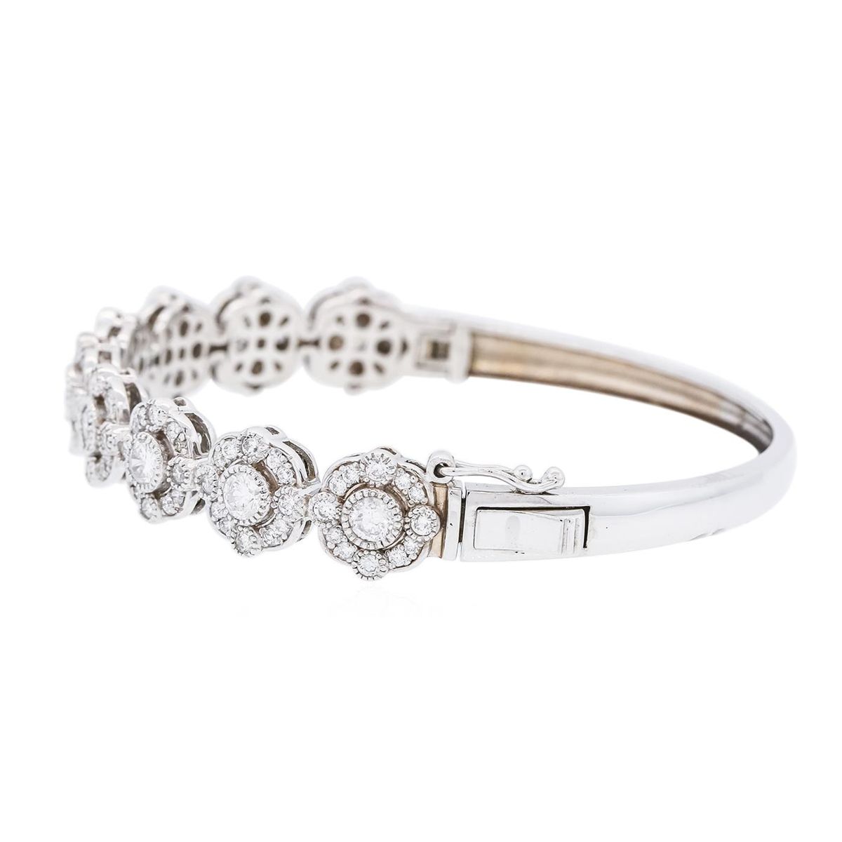 One electronically tested 14KT white gold ladies cast diamond bangle bracelet with a hidden box clasp with a bright polish finish. Identified with markings of "K14". Condition is new. Containing: One Hundred Eight prong set round brilliant cut diamonds, measuring 1.50 - 1.50 x 0.90mm (depth est.) approximate total weight of 108 Stones = 1.33ct. Clarity: SI-2 to I-1. Color: H - I, Cut is Good. Nine gypsy set round brilliant cut diamonds, measuring 3.50 - 3.50 x 2.10mm (depth est.) approximate total weight of 9 Stones = 1.41ct. Clarity: SI-1 to I-1. Color: H - I, Cut is Good. All diamonds are graded in the mounting, unless otherwise stated. Total Weight of Diamonds 2.74ct. Total Weight of Bangle Bracelet 18.20 grams. GGL Appraised at $13,790.00.