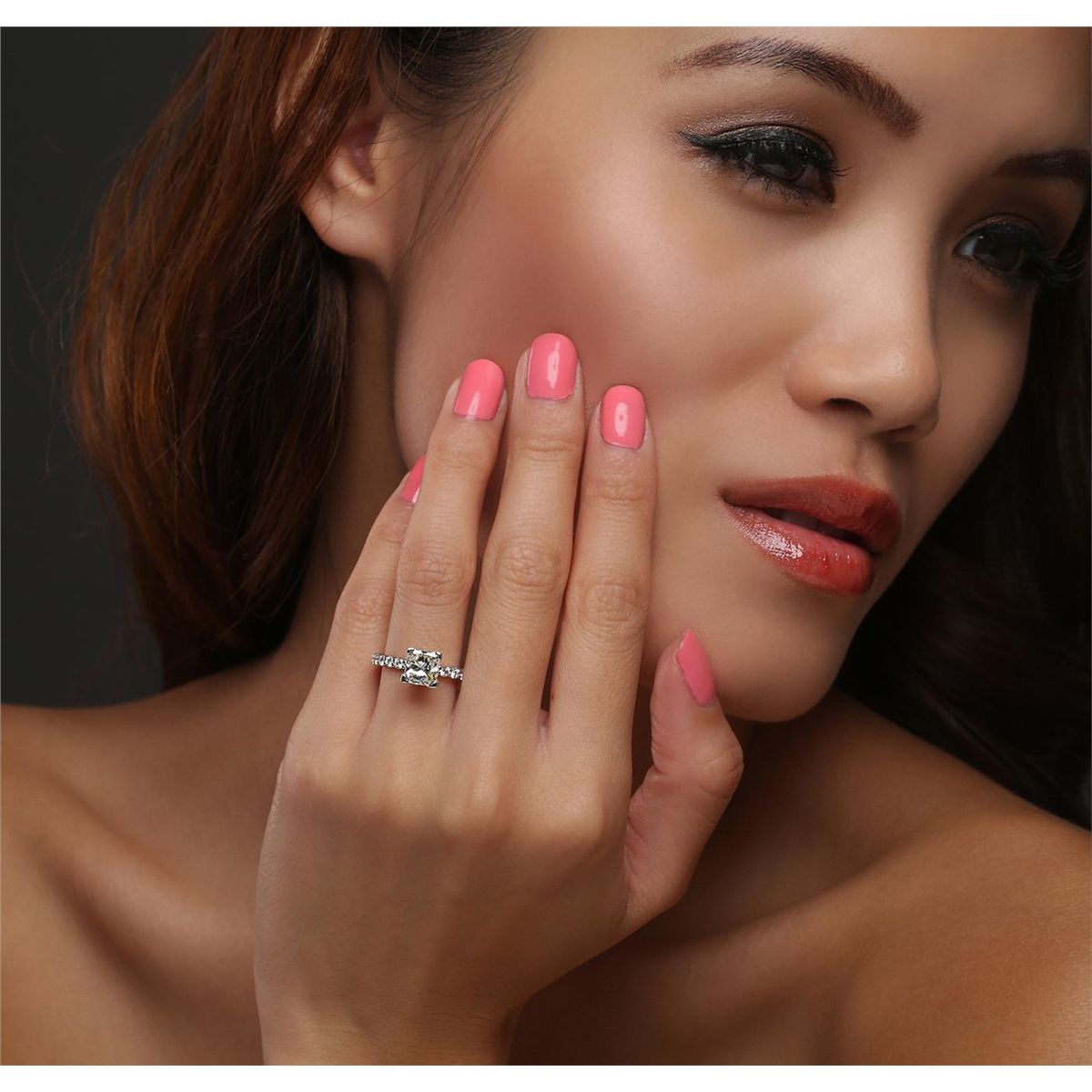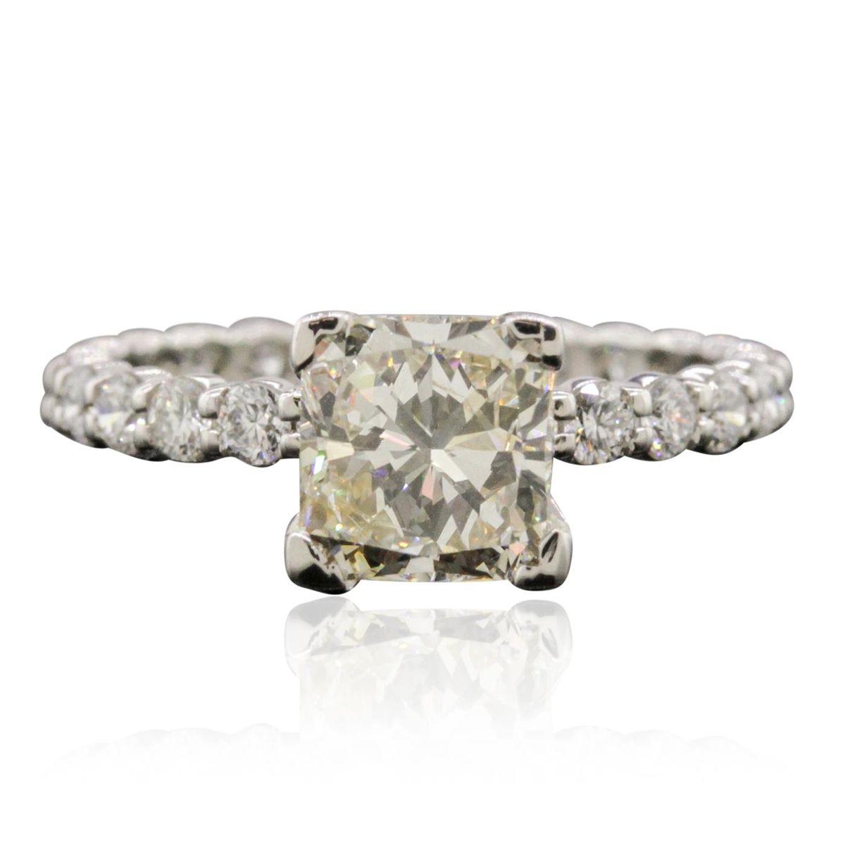 One electronically tested 14KT white gold ladies combination cast & assembled engagement ring with a bright polish finish. Condition is new. Containing: One prong set princess cut diamond, measuring 6.80 x 6.50 x 4.88mm (depth est.) approximate weight of 1.77ct. Clarity: SI-2. Color: M, Cut is Good. Twenty-Five prong set round brilliant cut diamonds, measuring 2.20 - 2.20 x 1.32mm (depth est.) approximate. Total Weight of 25 Stones = 0.97ct. Clarity: SI-1 to SI-2. Color: J - K, Cut is Good. All diamonds are graded in the mounting, unless otherwise stated. Total Weight of Diamonds 2.74ct. Total Weight of Ring 3.30 grams. GGL Appraised at $15,775.00.