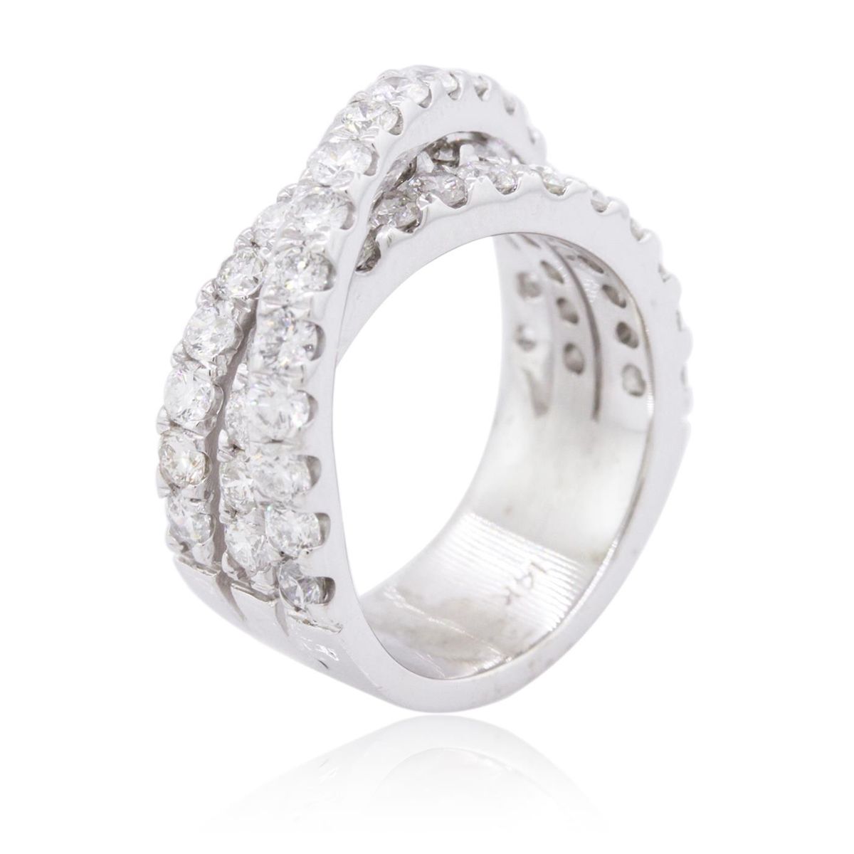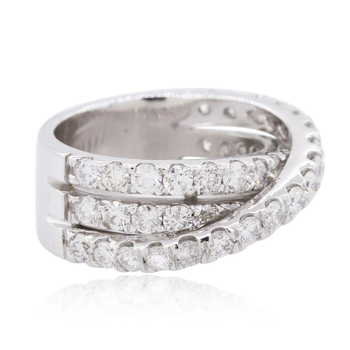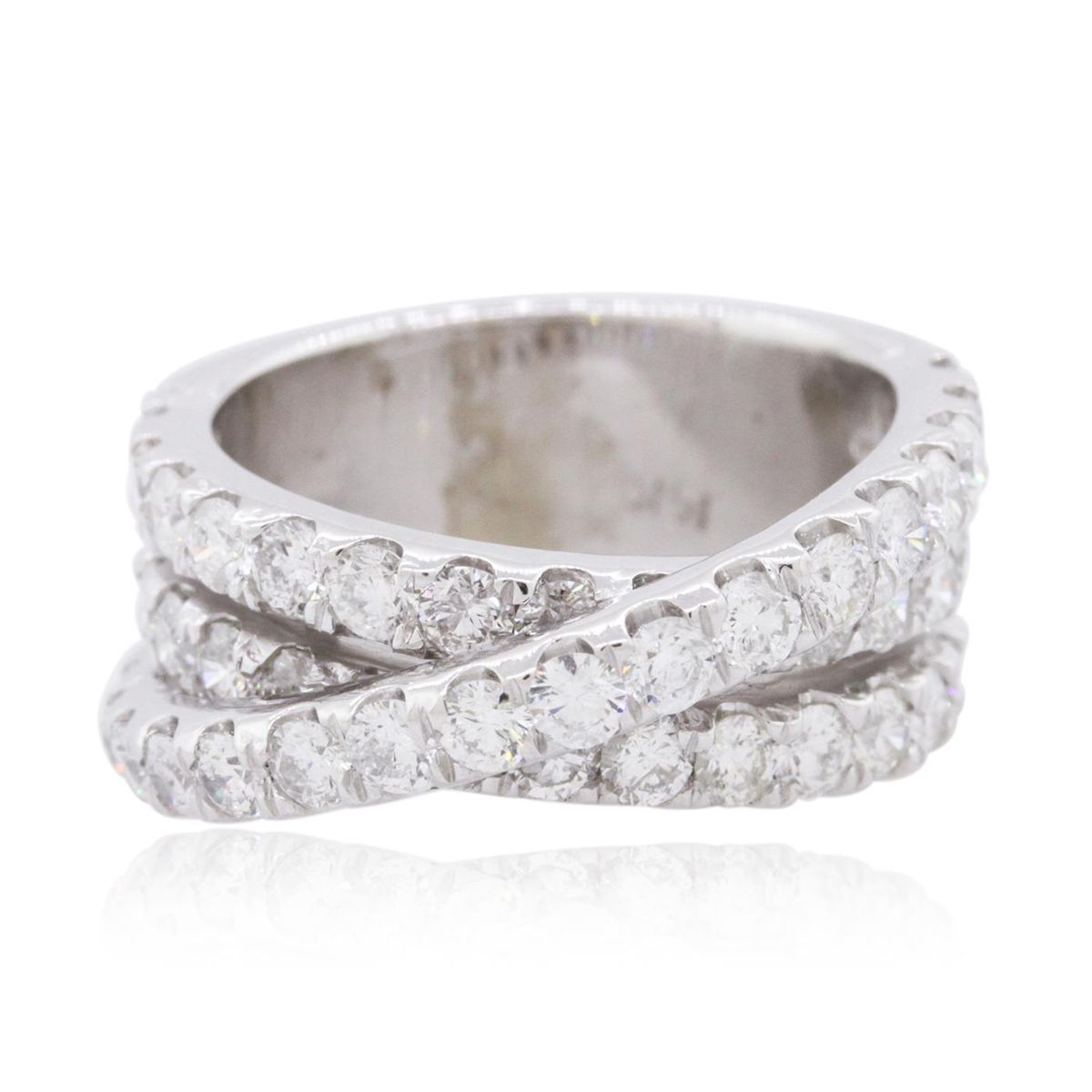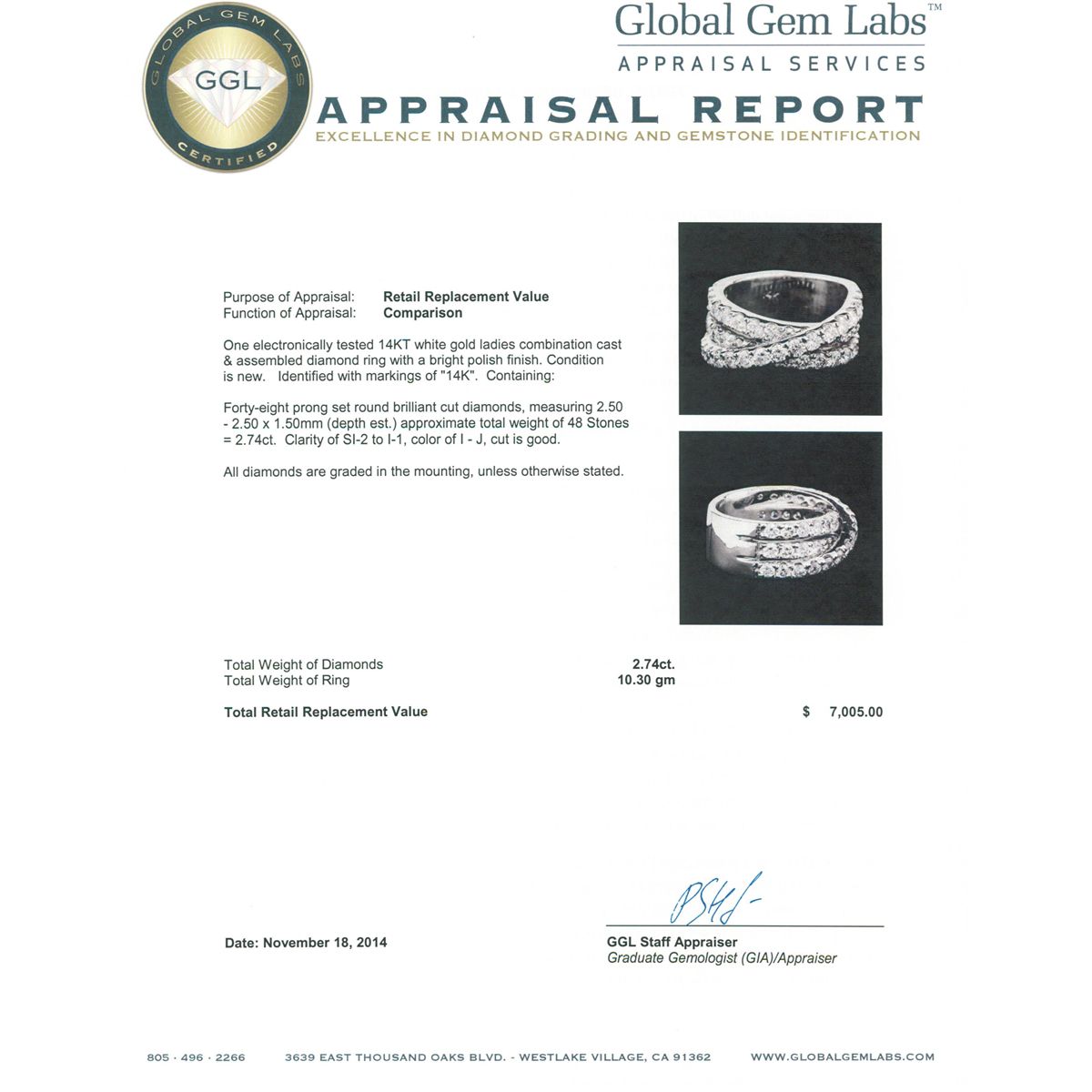 One electronically tested 14KT white gold ladies combination cast & assembled diamond ring with a bright polish finish. Identified with markings of "14K". Condition is new. Containing: Forty-Eight prong set round brilliant cut diamonds, measuring 2.50 - 2.50 x 1.50mm (depth est.) approximate total weight of 48 Stones = 2.74ct. Clarity: SI-2 to I-1. Color: I - J, Cut is Good. All diamonds are graded in the mounting, unless otherwise stated. Total Weight of Diamonds 2.74ct. Total Weight of Ring 10.30 grams. GGL Appraised at $7,005.00.