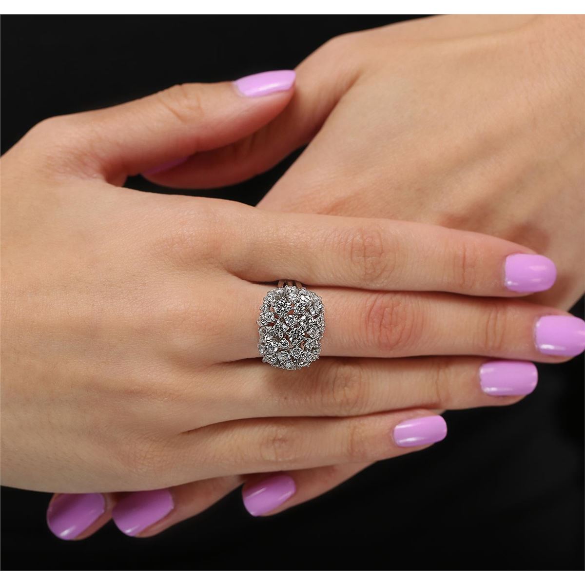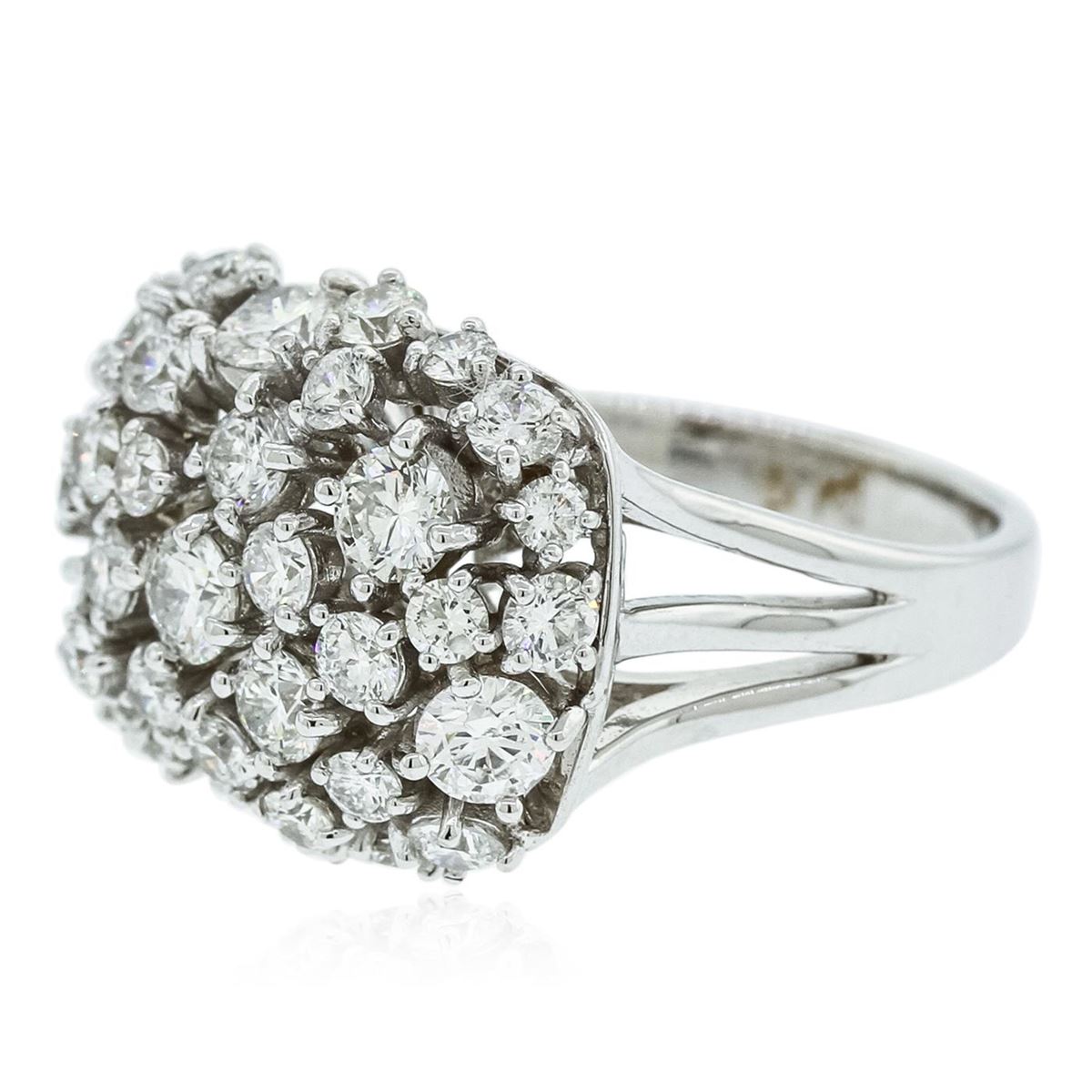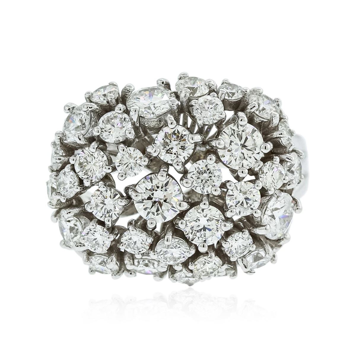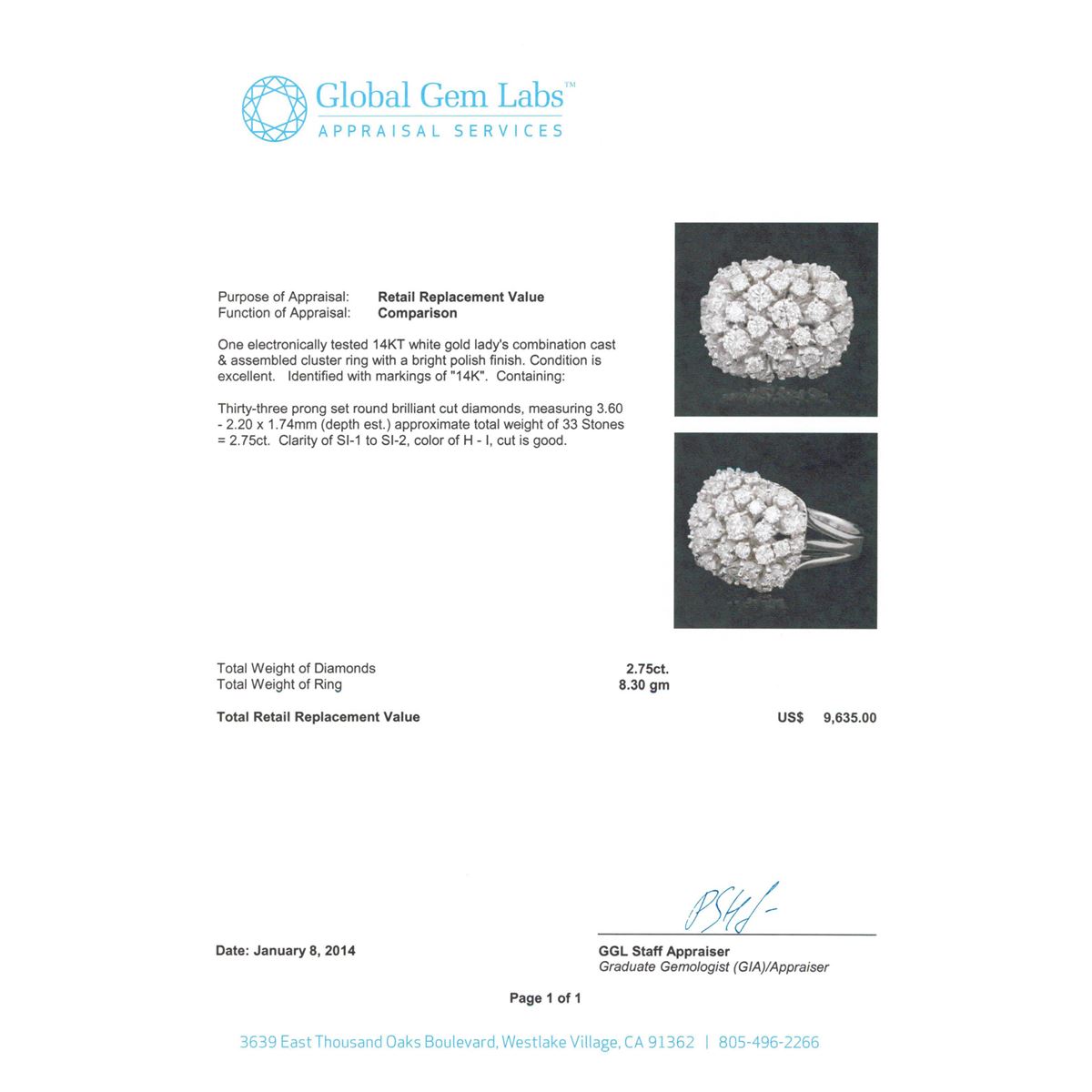 One electronically tested 14KT white gold Ladies combination cast & assembled cluster ring with a bright polish finish. Identified with markings of "14K". Condition is excellent. Containing: Thirty-Three prong set round brilliant cut diamonds, measuring 3.60 - 2.20 x 1.74mm (depth est.) approximate total weight of 33 Stones = 2.75ct. Clarity of SI-1 to SI-2, Color of H - I, Cut is Good. Total Weight of Diamonds 2.75ct. Total Weight of Ring 8.30gm. GGL Appraised at $9,635.00.