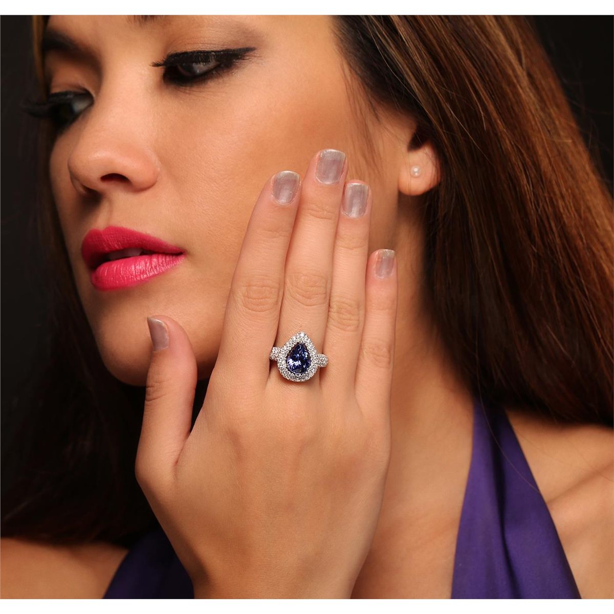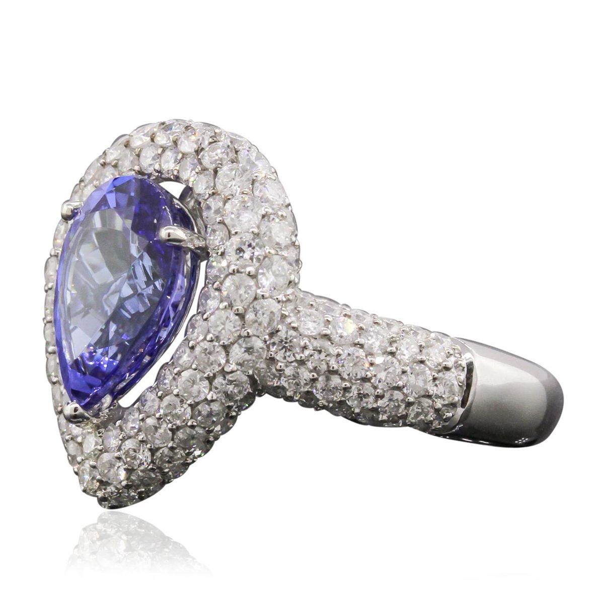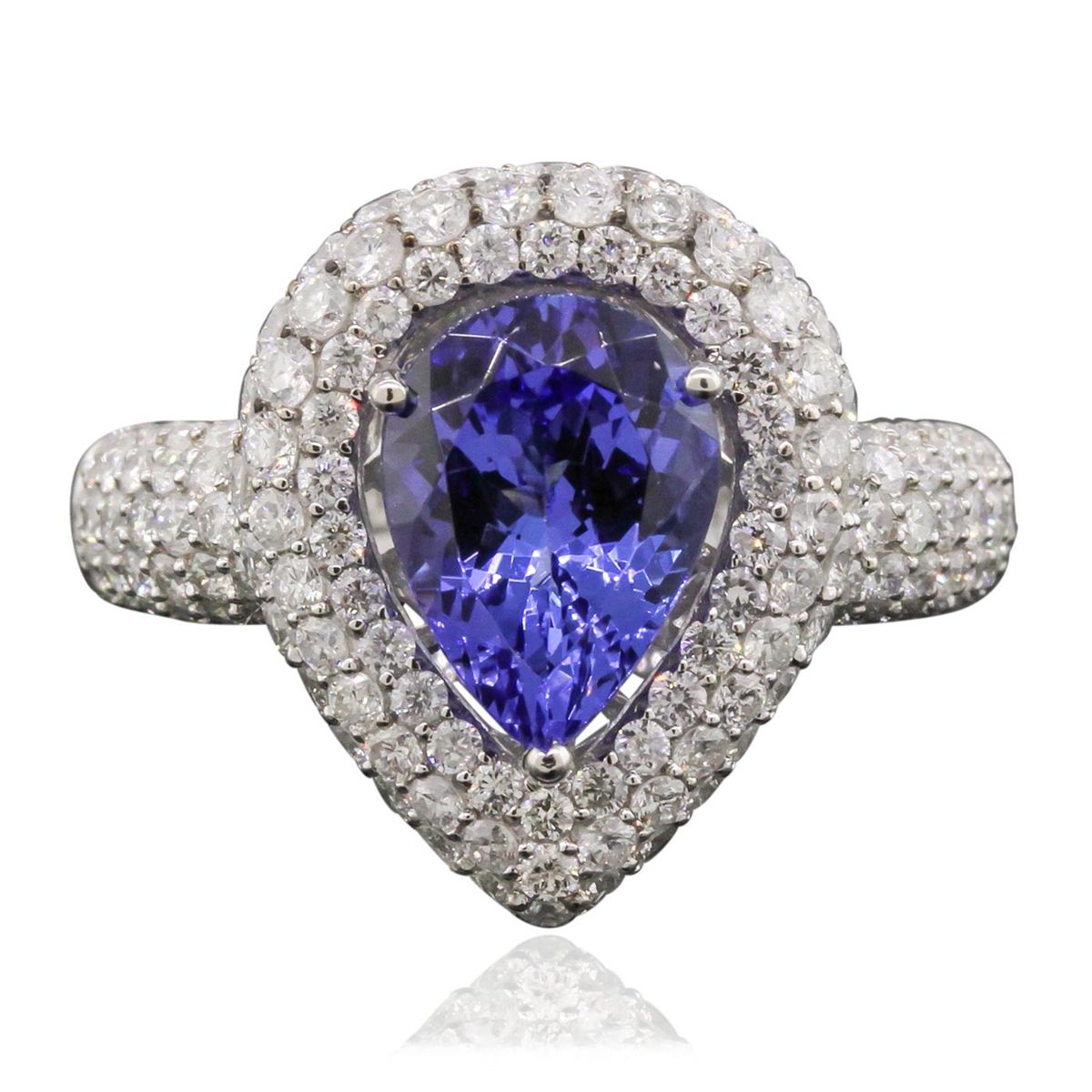 One electronically tested 14KT white gold Ladies combination cast & assembled ring with a bright polish finish. Condition is new. Identified with markings of "14K". Containing: One prong set pear modified brilliant cut natural tanzanite, measuring 11.00 x 8.00 x 5.20mm, approximate weight of 2.75ct., clarity is eye clean, type I, medium, moderately strong, bluish violet color, (GIA bV 5/4), cut is very good. Colored gemstones are presumed to have been subjected to commonly used color/clarity enhancement processes. Eighty-Two prong set round brilliant cut diamonds, measuring 1.30 - 1.30 x 0.86mm (depth est.) approximate. Total Weight of 82 Stones = 0.82ct. Clarity: I-1 to I-2. Color: H - I, Cut is Good. Eighty-Four prong set round brilliant cut diamonds, measuring 1.40 - 1.40 x 0.84mm (depth est.) approximate. Total Weight of 84 Stones = 1.17ct. Clarity: I-1 to I-2. Color: H - I, Cut is Good. Total Weight of Colored Stones 2.75ct. Total Weight of Diamonds 1.99ct. Total Weight of Ring 6.50 grams. GGL Appraised at $9,595.00.