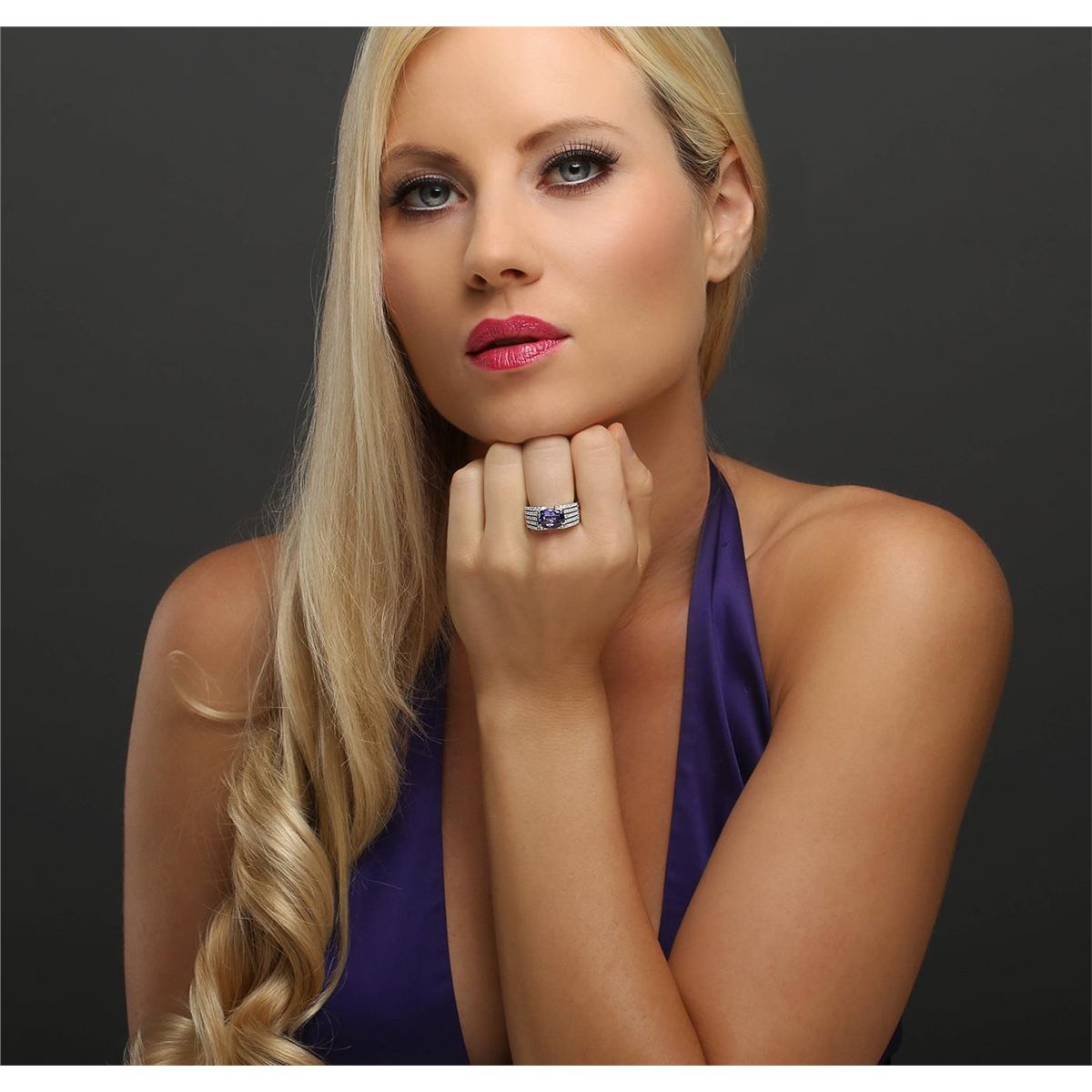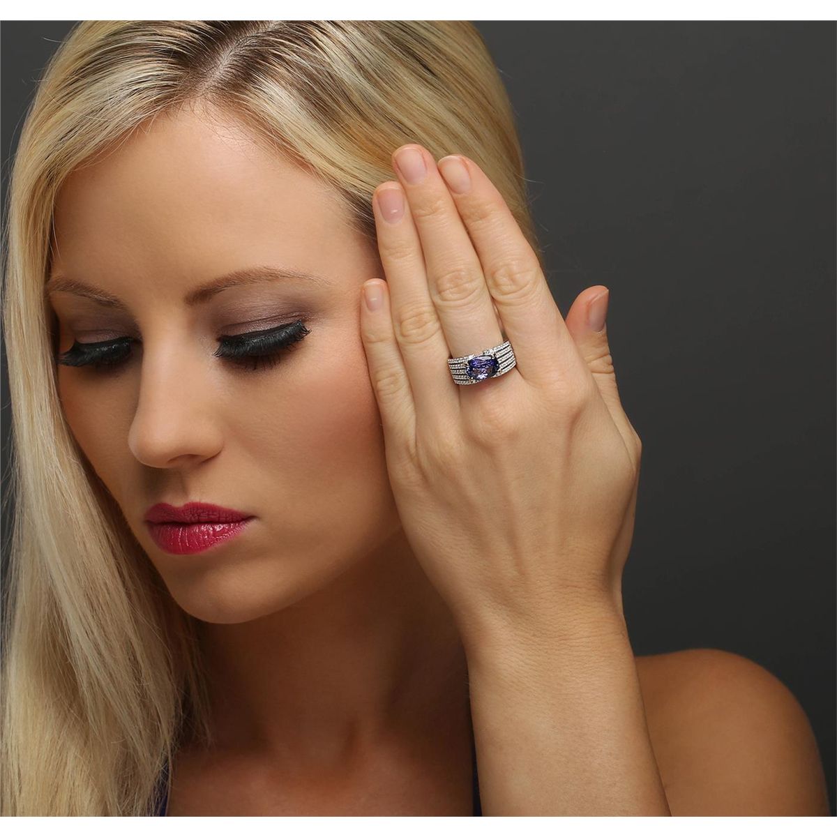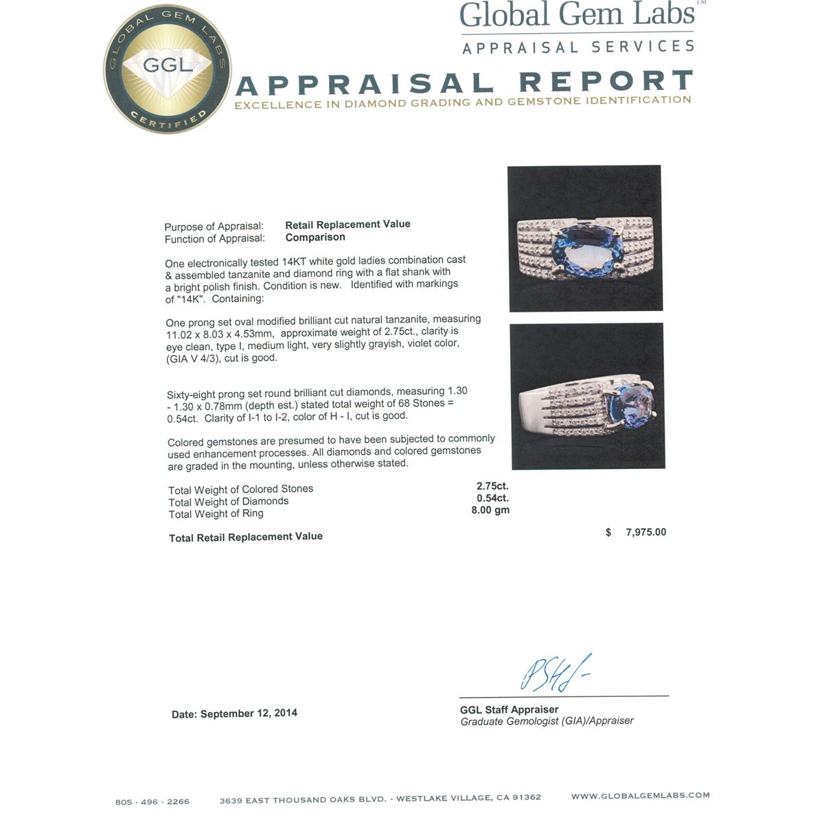 One electronically tested 14KT white gold ladies combination cast & assembled tanzanite and diamond ring with a flat shank with a bright polish finish. Identified with markings of "14K". Condition is new. Containing: One prong set oval modified brilliant cut natural tanzanite, measuring 11.02 x 8.03 x 4.53mm, approximate weight of 2.75ct., clarity is eye clean, type I, medium light, very slightly grayish, violet color, (GIA V 4/3), cut is good. Sixty-Eight prong set round brilliant cut diamonds, measuring 1.30 - 1.30 x 0.78mm (depth est.) stated total weight of 68 Stones = 0.54ct. Clarity: I-1 to I-2. Color: H - I, Cut is Good. Colored gemstones are presumed to have been subjected to commonly used enhancement processes. All diamonds and colored gemstones are graded in the mounting, unless otherwise stated total weight of Colored Stones 2.75ct. Total Weight of Diamonds 0.54ct. Total Weight of Ring 8.00 grams. GGL Appraised at $7,975.00.