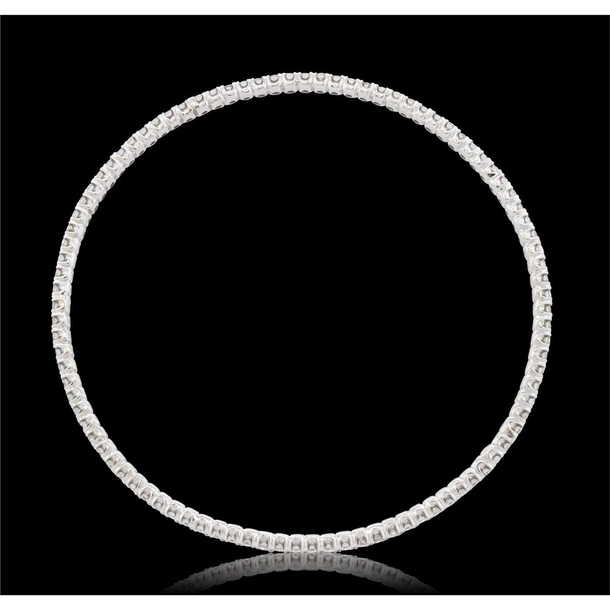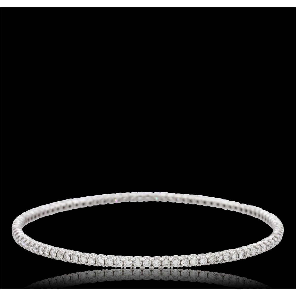 One electronically tested 14KT white gold ladies cast diamond bangle with a bright polish finish. Seven and one-half inch wearable length bangle features a two and one-half millimeter wide continuous diamond ribbon. Condition is new, good workmanship. Containing: Ninety-Five prong set round brilliant cut diamonds, measuring 2.00 - 1.90 x 1.17mm (depth est.) approximate total weight of 95 Stones = 2.75ct. Graded in the setting. Clarity: VS-2 to SI-2. Color: H - J. Total Weight of Diamonds 2.75ct. Total Weight of Bangle 9.59 grams. AIG Appraised at $10,820.00.