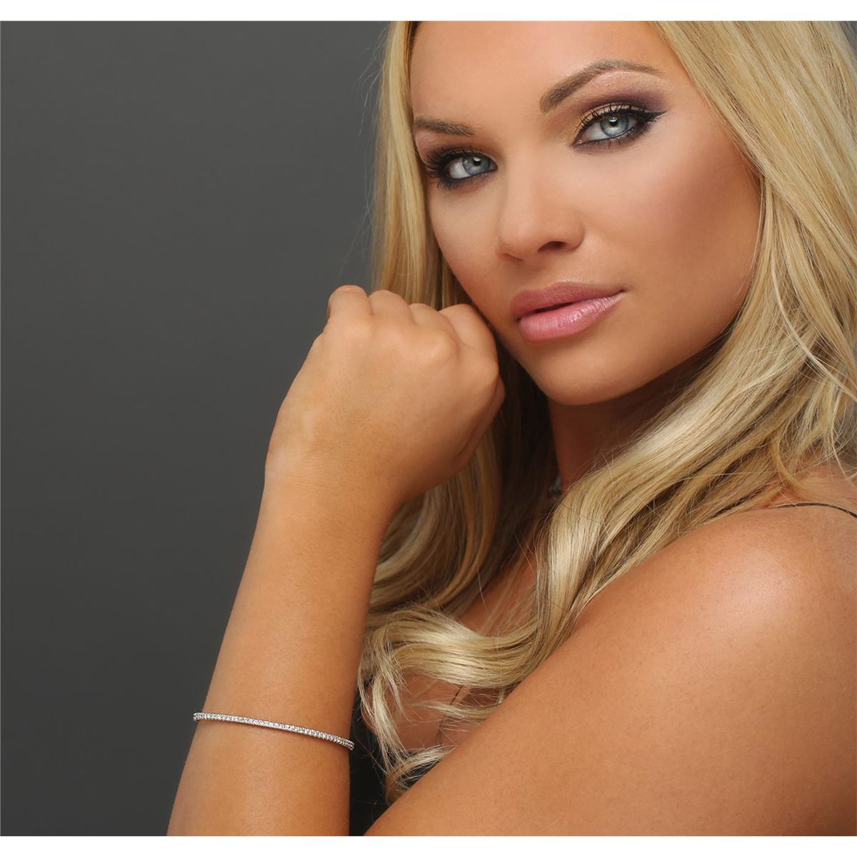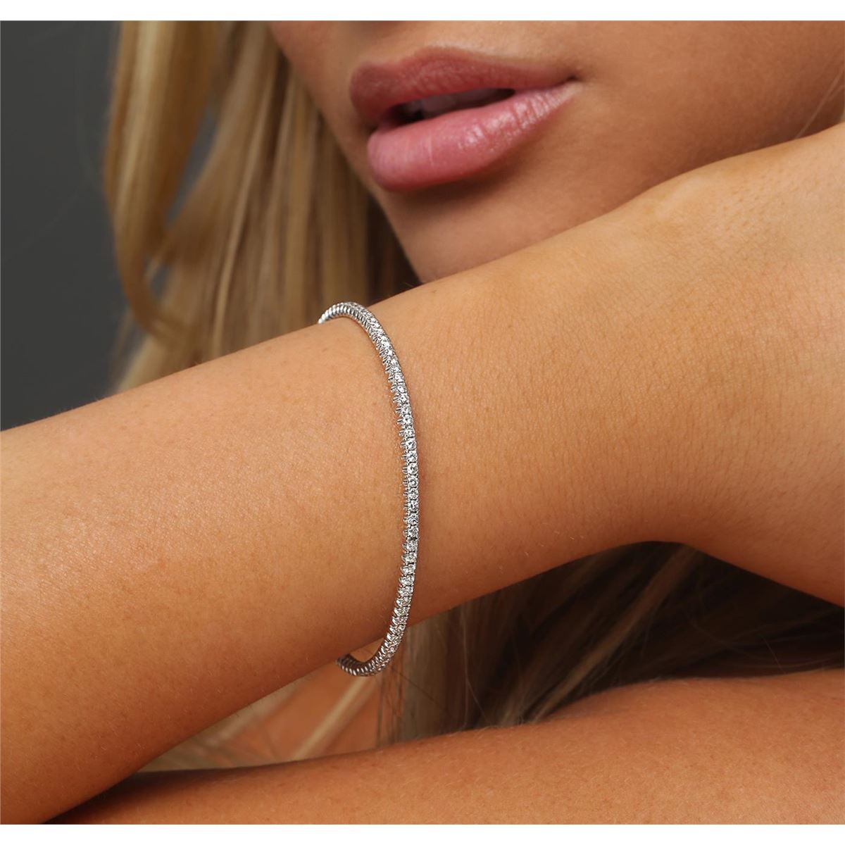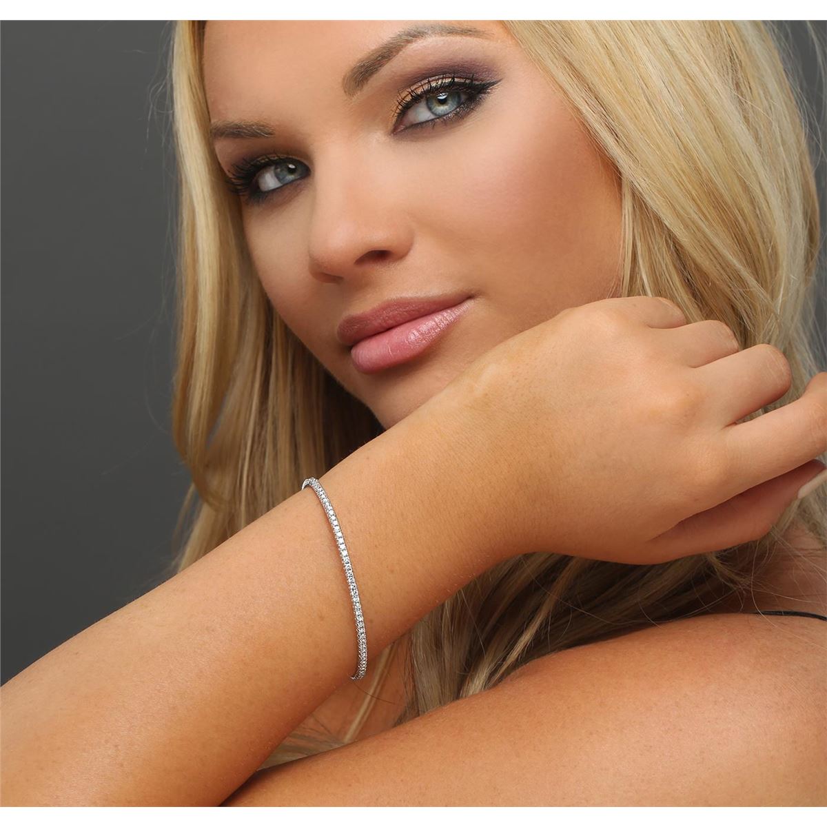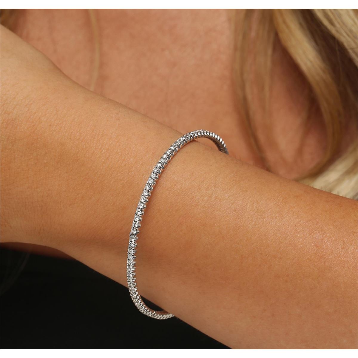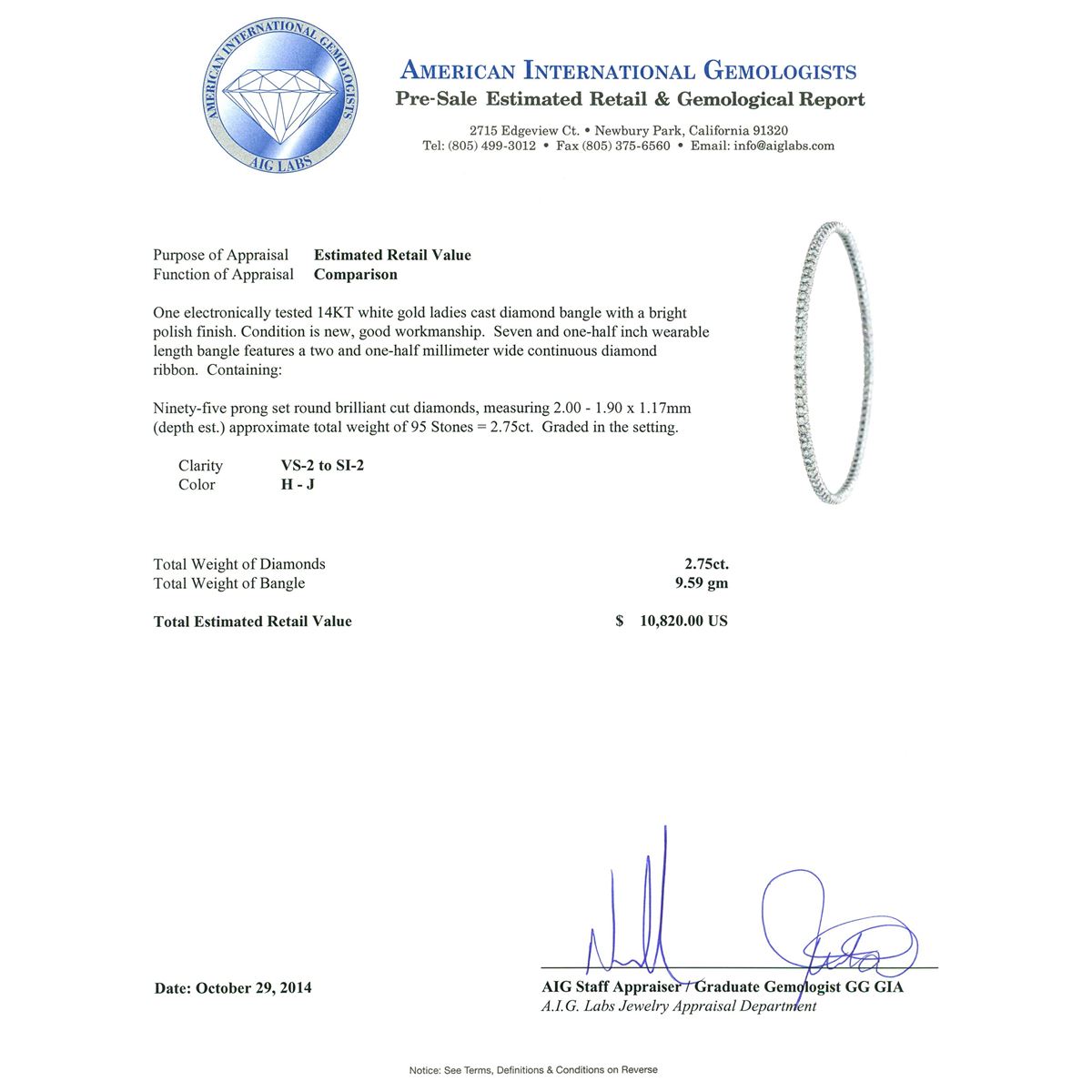 One electronically tested 14KT white gold ladies cast diamond bangle with a bright polish finish. Seven and one-half inch wearable length bangle features a two and one-half millimeter wide continuous diamond ribbon. Condition is new, good workmanship. Containing: Ninety-Five prong set round brilliant cut diamonds, measuring 2.00 - 1.90 x 1.17mm (depth est.) approximate total weight of 95 Stones = 2.75ct. Graded in the setting. Clarity: VS-2 to SI-2. Color: H - J. Total Weight of Diamonds 2.75ct. Total Weight of Bangle 9.59 grams. AIG Appraised at $10,820.00.