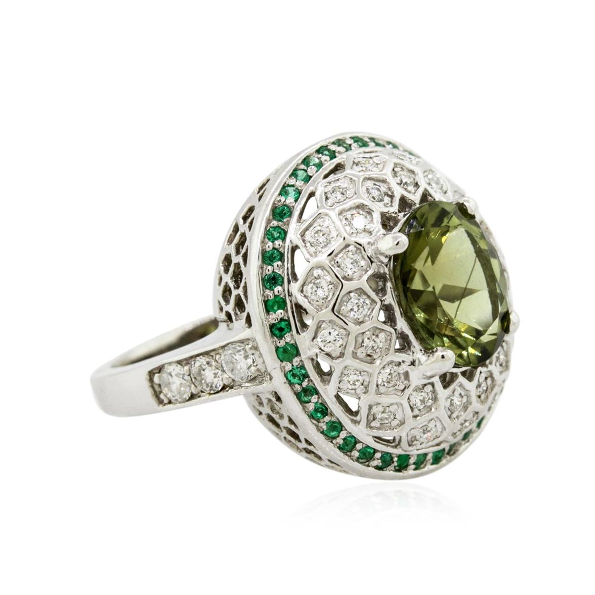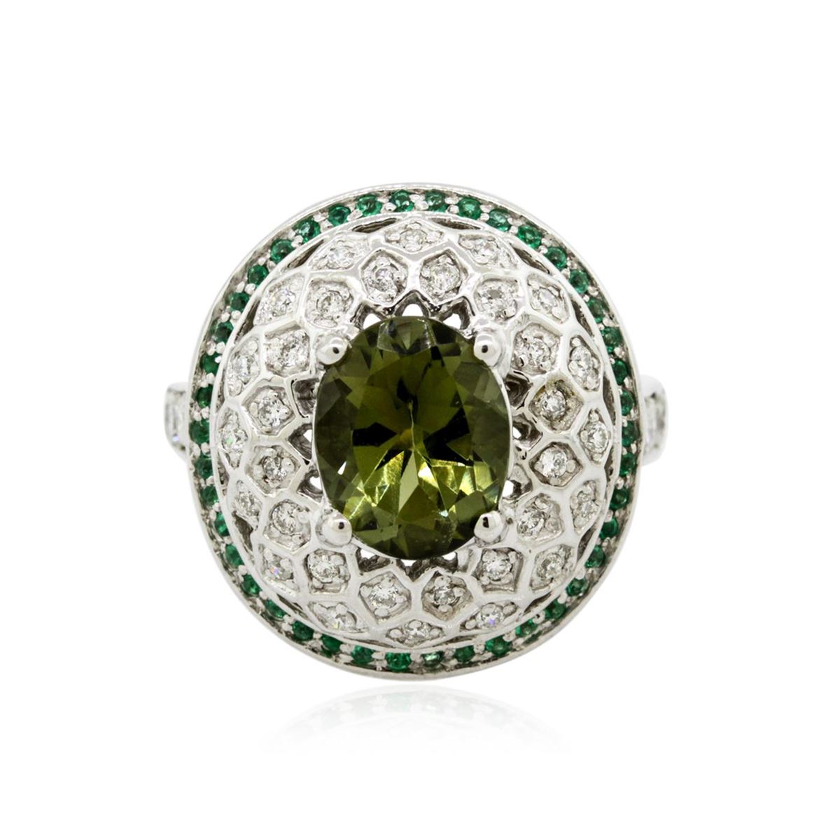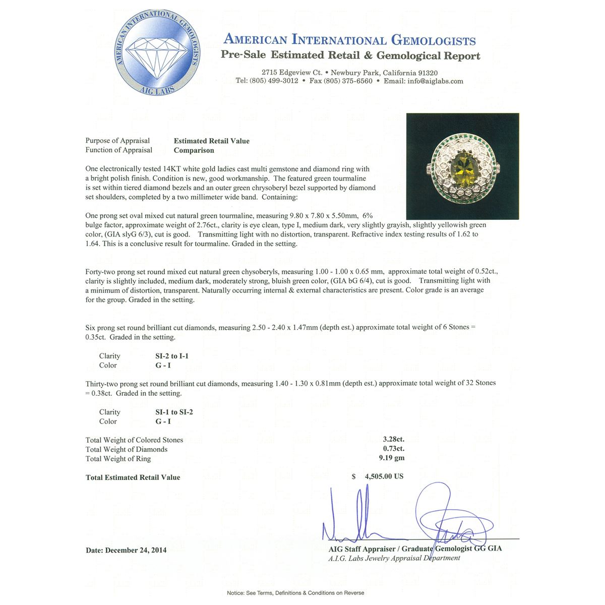 One electronically tested 14KT white gold ladies cast multi gemstone and diamond ring with a bright polish finish. The featured green tourmaline is set within tiered diamond bezels and an outer green chrysoberyl bezel supported by diamond set shoulders, completed by a two millimeter wide band. Condition is new, good workmanship. Containing: One prong set oval mixed cut natural green tourmaline, measuring 9.80 x 7.80 x 5.50mm, 6% bulge factor, approximate weight of 2.76ct., clarity is eye clean, type I, medium dark, very slightly grayish, slightly yellowish green color, (GIA slyG 6/3), cut is good. Transmitting light with no distortion, transparent. Refractive index testing results of 1.62 to 1.64. This is a conclusive result for tourmaline. Graded in the setting. Forty-two prong set round mixed cut natural green chrysoberyls, measuring 1.00 - 1.00 x 0.65 mm, approximate total weight of 0.52ct., clarity is slightly included, medium dark, moderately strong, bluish green color, (GIA bG 6/4), cut is good. Transmitting light with a minimum of distortion, transparent. Naturally occurring internal & external characteristics are present. Color grade is an average for the group. Graded in the setting. Six prong set round brilliant cut diamonds, measuring 2.50 - 2.40 x 1.47mm (depth est.) approximate total weight of 6 Stones = 0.35ct. Graded in the setting. Clarity: SI-2 to I-1. Color: G - I Thirty-Two prong set round brilliant cut diamonds, measuring 1.40 - 1.30 x 0.81mm (depth est.) approximate total weight of 32 Stones = 0.38ct. Graded in the setting. Clarity: SI-1 to SI-2. Color: G - I. Total Weight of Colored Stones 3.28ct. Total Weight of Diamonds 0.73ct. Total Weight of Ring 9.19 grams. AIG Appraised at $4,505.00.
