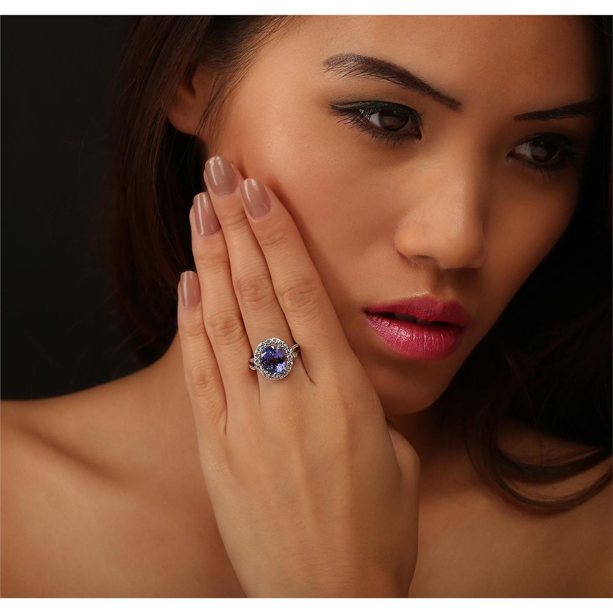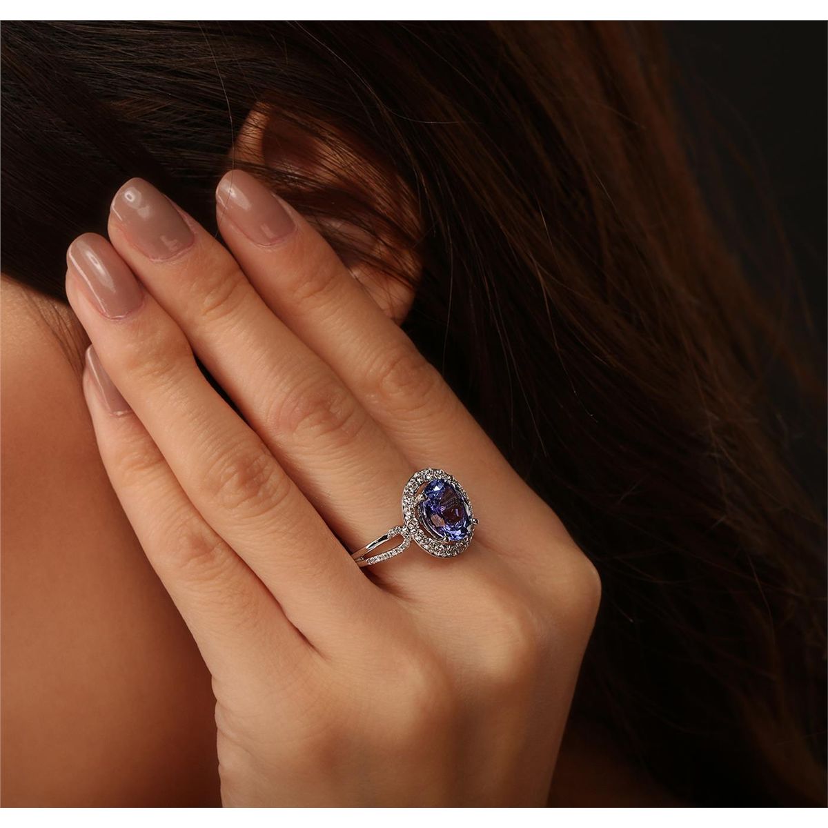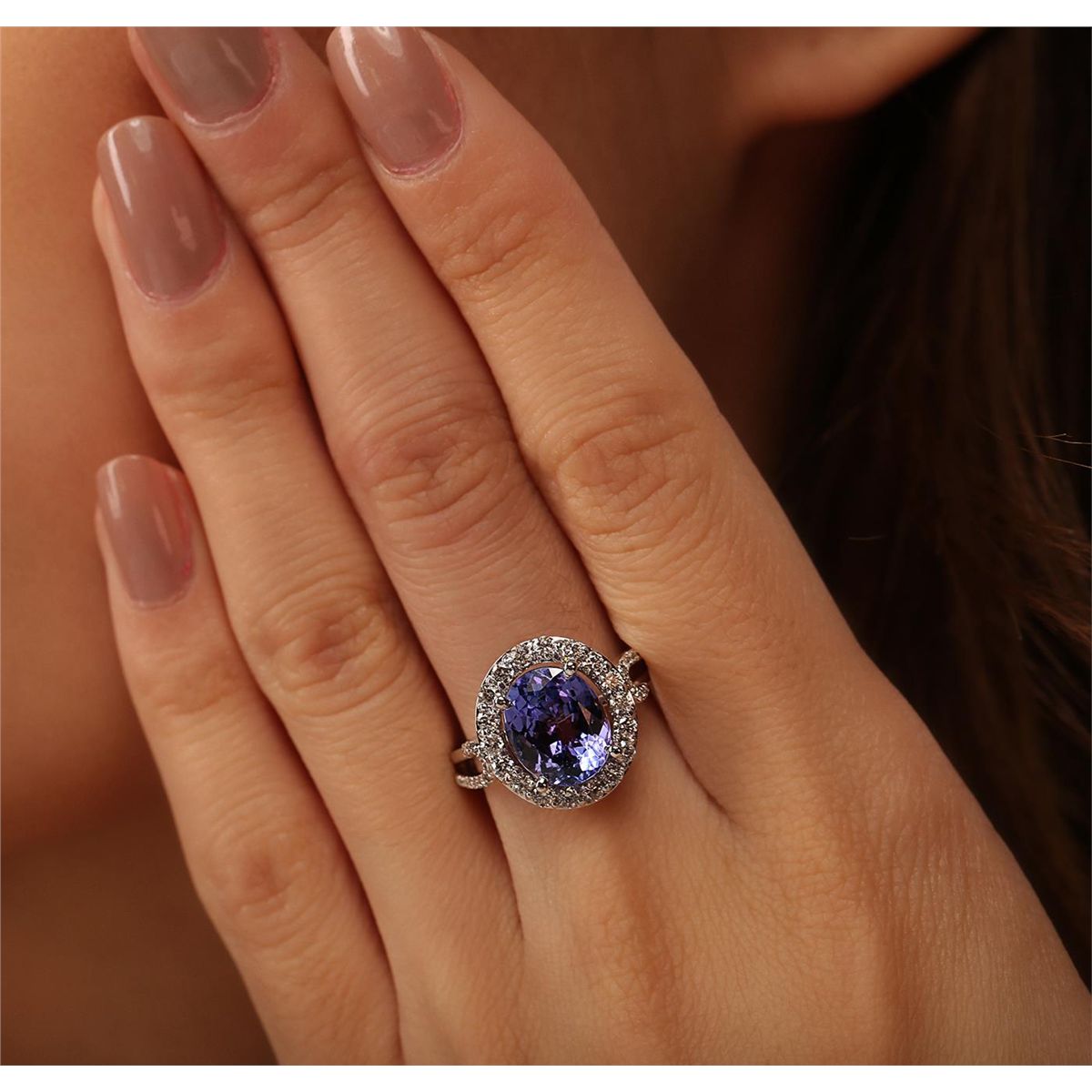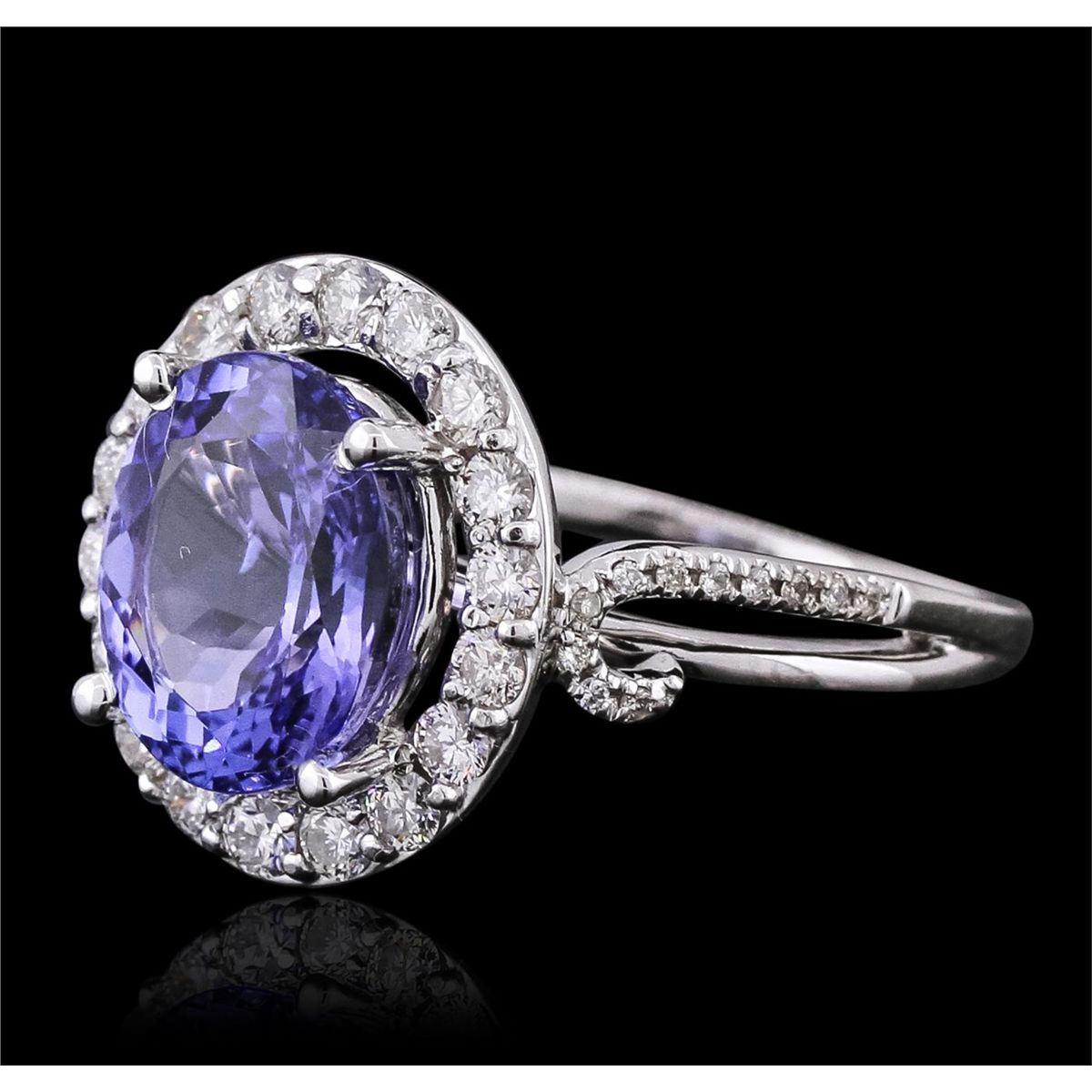 One electronically tested 14KT white gold ladies combination cast & assembled ring with a bright polish finish. Condition is new. Identified with markings of "14K". Containing: One prong set oval modified brilliant cut natural tanzanite, measuring 10.05 x 8.66 x 4.71mm, approximate weight of 2.76ct., clarity is eye clean, type I, medium, moderately strong, bluish violet color, (GIA bV 5/4), cut is good. Eighteen prong set round brilliant cut diamonds, measuring 1.90 - 1.90 x 1.14mm (depth est.) approximate total weight of 18 Stones = 0.45ct. Clarity: SI-2. Color: I - J, Cut is Good. Twenty-Two prong set round brilliant cut diamonds, measuring 1.00 - 1.00 x 0.60mm (depth est.) approximate total weight of 22 Stones = 0.08ct. Clarity: I-1 to I-2. Color: I - J, Cut is Good. Colored gemstones are presumed to have been subjected to commonly used enhancement processes. All diamonds and colored gemstones are graded in the mounting, unless otherwise stated. Total Weight of Colored Stones 2.76ct. Total Weight of Diamonds 0.53ct. Total Weight of Ring 4.50 grams. GGL Appraised at $6,565.00.