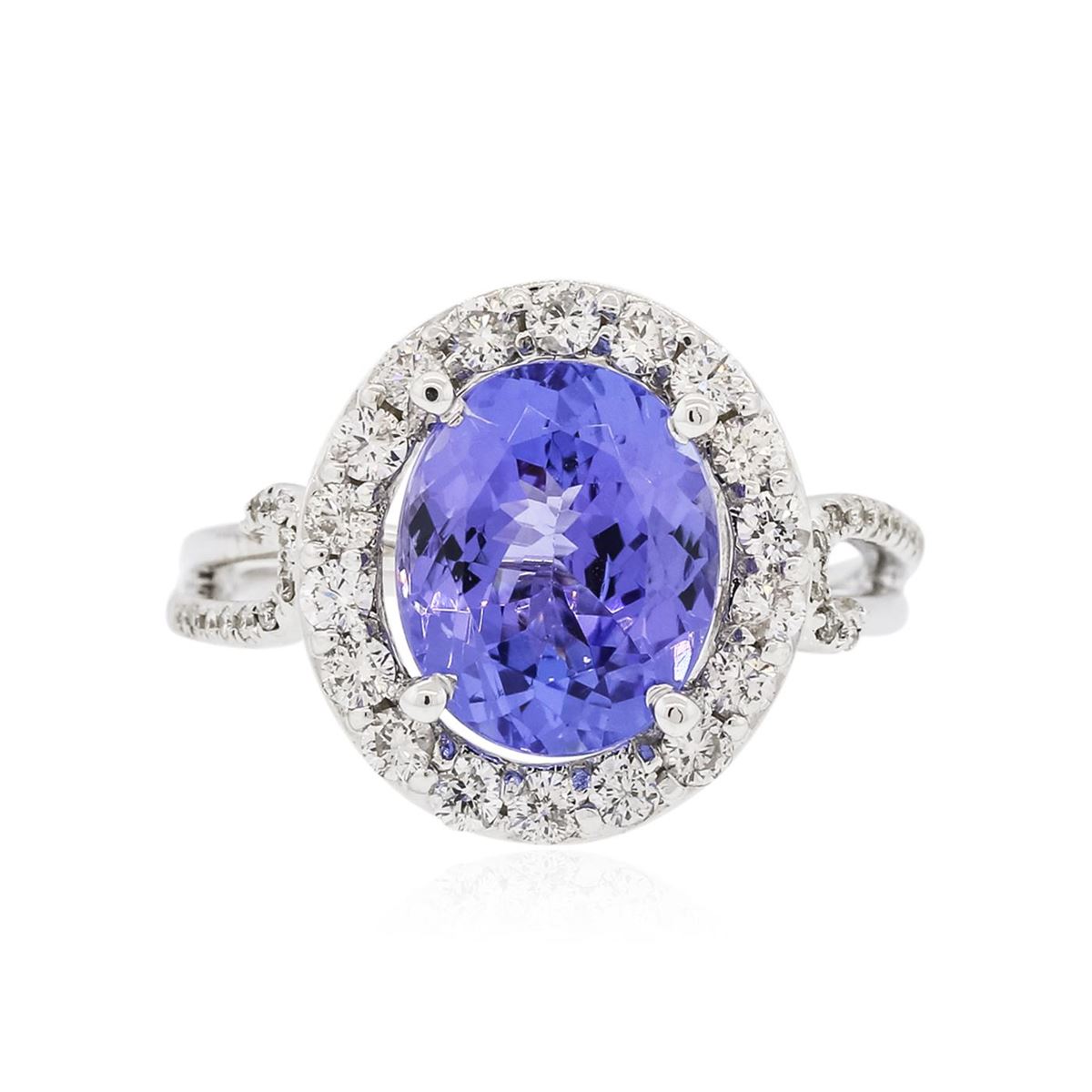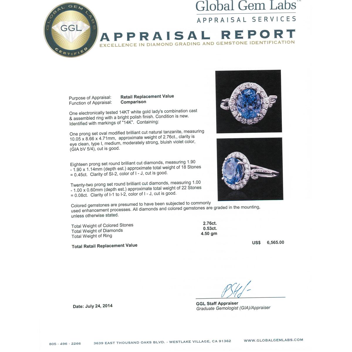 One electronically tested 14KT white gold ladies combination cast & assembled ring with a bright polish finish. Condition is new. Identified with markings of "14K". Containing: One prong set oval modified brilliant cut natural tanzanite, measuring 10.05 x 8.66 x 4.71mm, approximate weight of 2.76ct., clarity is eye clean, type I, medium, moderately strong, bluish violet color, (GIA bV 5/4), cut is good. Eighteen prong set round brilliant cut diamonds, measuring 1.90 - 1.90 x 1.14mm (depth est.) approximate total weight of 18 Stones = 0.45ct. Clarity: SI-2. Color: I - J, Cut is Good. Twenty-Two prong set round brilliant cut diamonds, measuring 1.00 - 1.00 x 0.60mm (depth est.) approximate total weight of 22 Stones = 0.08ct. Clarity: I-1 to I-2. Color: I - J, Cut is Good. Colored gemstones are presumed to have been subjected to commonly used enhancement processes. All diamonds and colored gemstones are graded in the mounting, unless otherwise stated. Total Weight of Colored Stones 2.76ct. Total Weight of Diamonds 0.53ct. Total Weight of Ring 4.50 grams. GGL Appraised at $6,565.00.