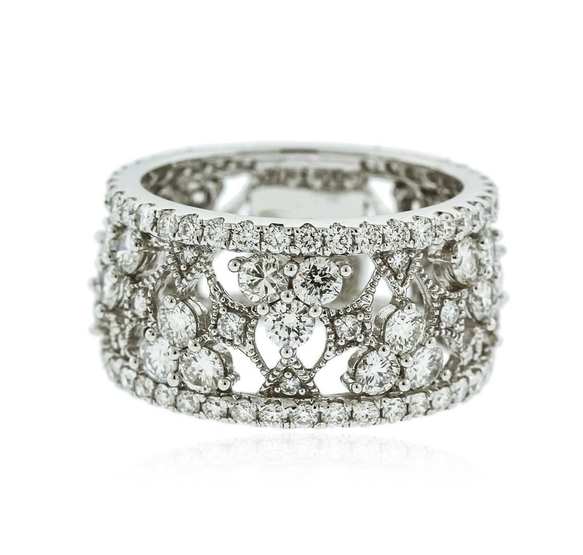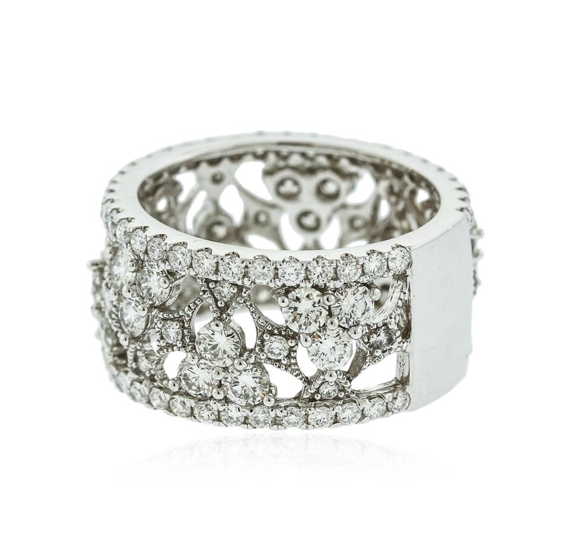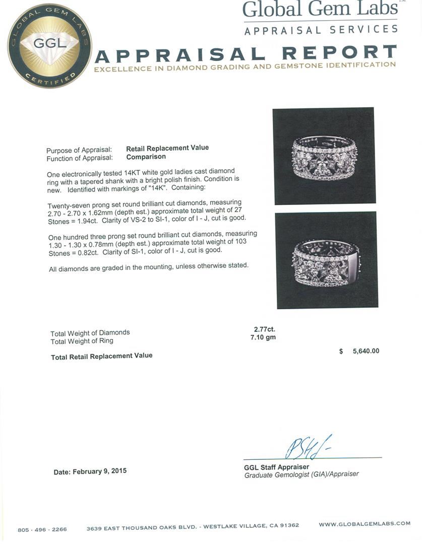 One electronically tested 14KT white gold ladies cast diamond ring with a tapered shank with a bright polish finish. Identified with markings of "14K". Condition is new. Containing: Twenty-Seven prong set round brilliant cut diamonds, measuring 2.70 - 2.70 x 1.62mm (depth est.) approximate total weight of 27 Stones = 1.94ct. Clarity: VS-2 to SI-1. Color: I - J, Cut is Good. One Hundred Three prong set round brilliant cut diamonds, measuring 1.30 - 1.30 x 0.78mm (depth est.) approximate total weight of 103 Stones = 0.82ct. Clarity: SI-1. Color: I - J, Cut is Good. All diamonds are graded in the mounting, unless otherwise stated. Total Weight of Diamonds 2.77ct. Total Weight of Ring 7.10 grams. GGL Appraised at $5,640.00.