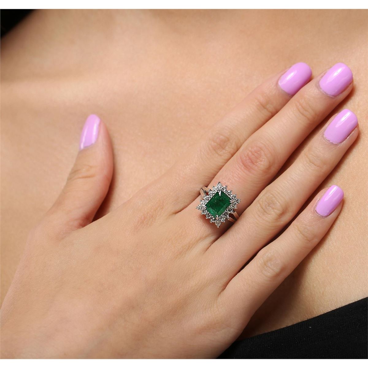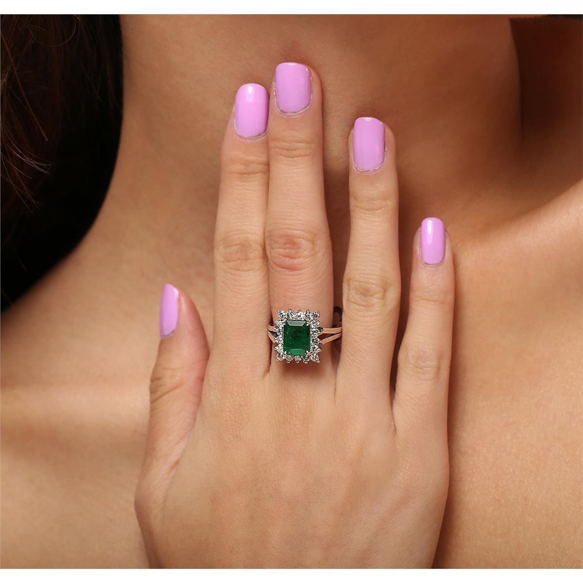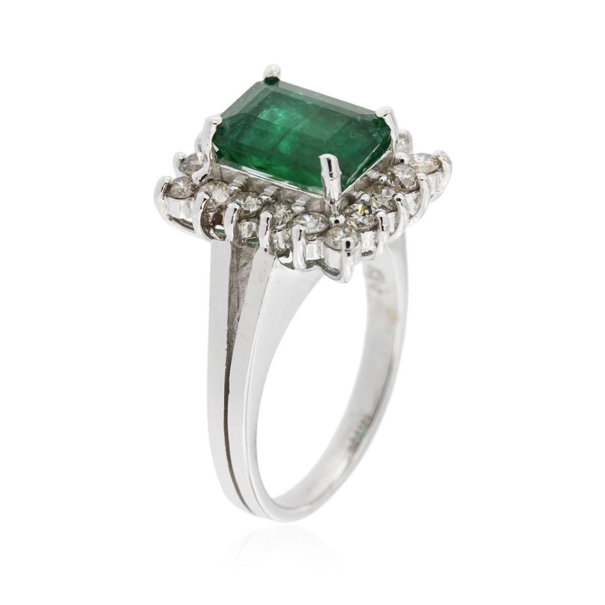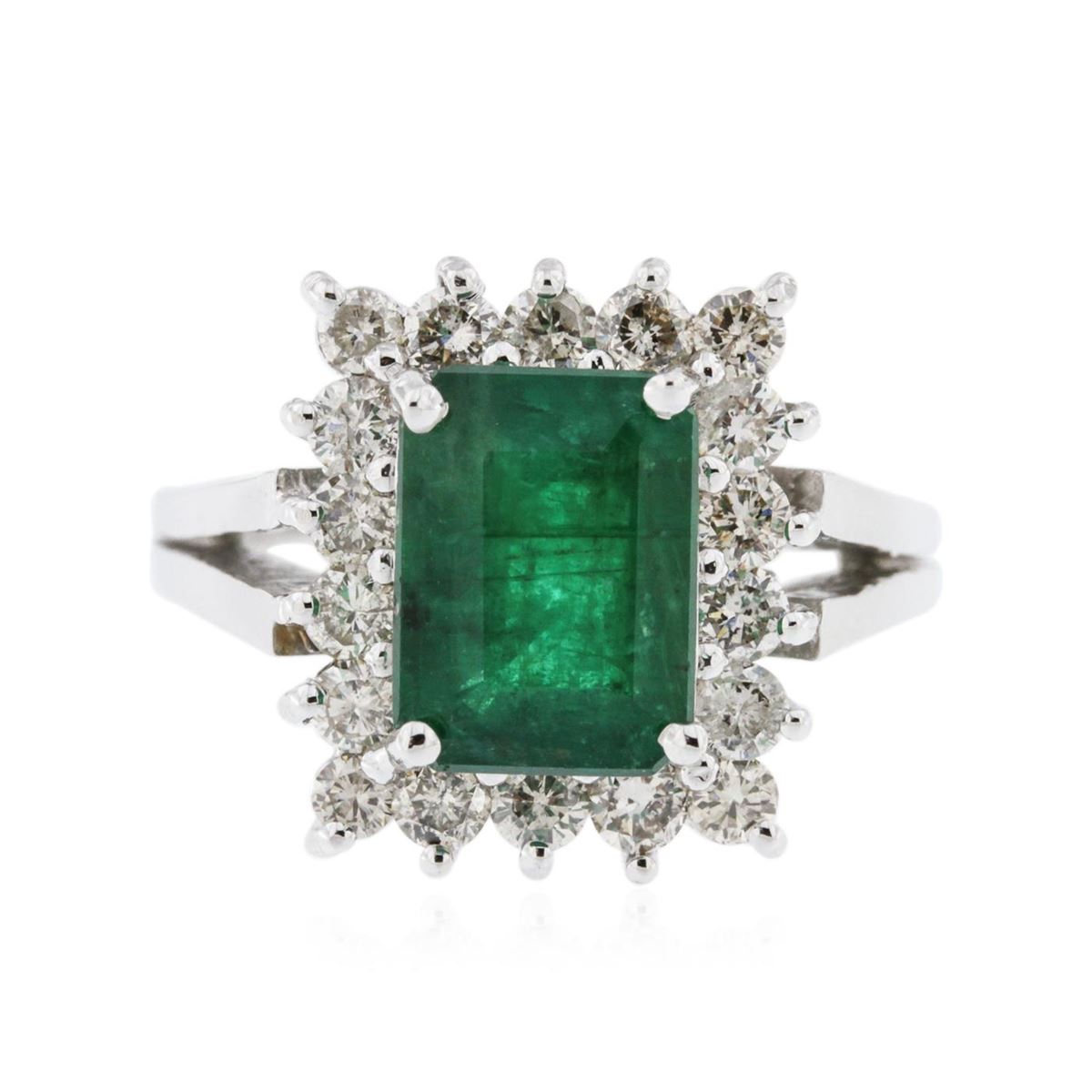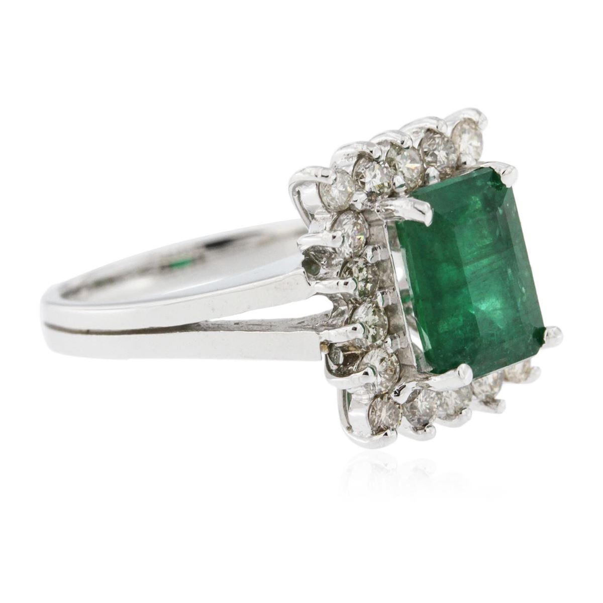 One electronically tested 14KT white gold ladies cast emerald and diamond ring with a bright polish finish. The featured emerald is set within a diamond bezel supported by split shoulders, completed by a grooved two and one-half millimeter wide band. Identified with markings of "K14". Condition is new, good workmanship. Containing: One prong set rectangular step cut natural emerald, measuring 9.35 x 6.79 x 4.95mm, 8%. bulge factor, approximate weight of 2.77ct., clarity is heavily included, type III, medium dark, very slightly grayish, green color, (GIA G 6/3), cut is good. Transmitting light with a minimum of distortion, transparent. Naturally occurring internal & external characteristics are present. Indications of oil & opticon residue. Graded in the setting. Eighteen prong set round brilliant cut diamonds, measuring 2.30 - 2.20 x 1.35mm (depth est.) approximate. Total Weight of 18 Stones = 0.85ct. Graded in the setting. Clarity: SI-1 to I-1 . Color: H - J. Total Weight of Colored Stones 2.77ct. Total Weight of Diamonds 0.85ct. AIG Appraised at $7,000.00.