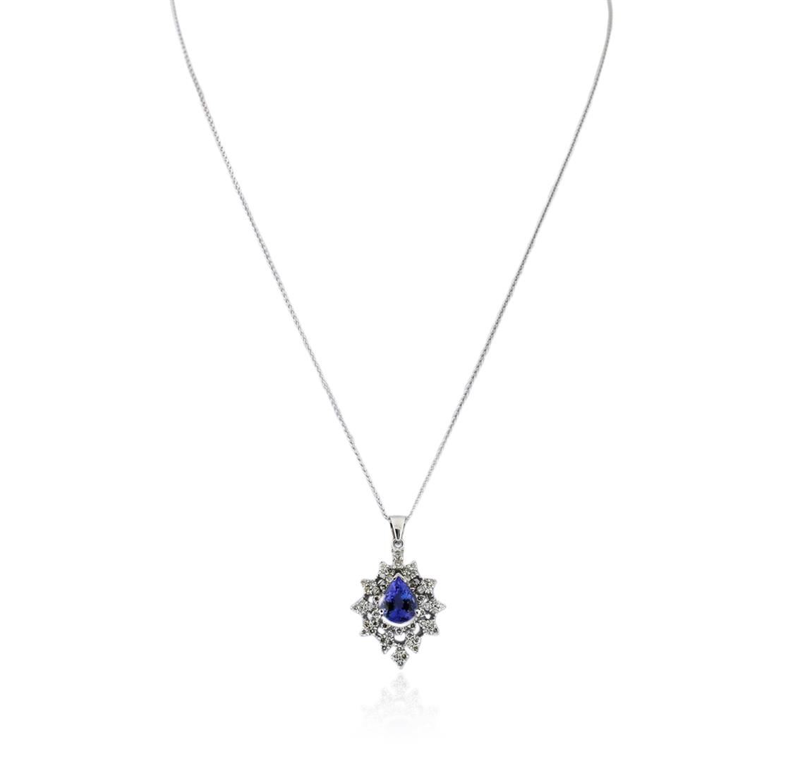 One electronically tested 14KT white gold ladies combination cast & assembled tanzanite and diamond pendant & chain 18.0" long, thin oval link with a spring ring clasp with a bright polish finish. Identified with markings of "14K". Condition is new. Containing: One prong set pear modified brilliant cut natural tanzanite, measuring 9.40 x 7.60 x 5.79mm, approximate weight of 2.77ct., clarity is eye clean, type I, medium light, very slightly grayish, bluish violet color, (GIA bV 4/3), cut is good. Fifty-Five prong set round brilliant cut diamonds, measuring 1.70 - 1.50 x 0.96mm (depth est.) approximate total weight of 55 Stones = 0.82ct. Clarity: SI-2 to I-2. Color: J - K, Cut is Good. Diamonds and colored gemstones are graded in the mounting, unless otherwise stated. Colored gemstones are presumed to have been subjected to commonly used enhancement processes. Total Weight of Colored Stones 2.77ct. Total Weight of Diamonds 0.82ct. Total Weight of Pendant & Chain 6.20 grams. GGL Appraised at $3,305.00.